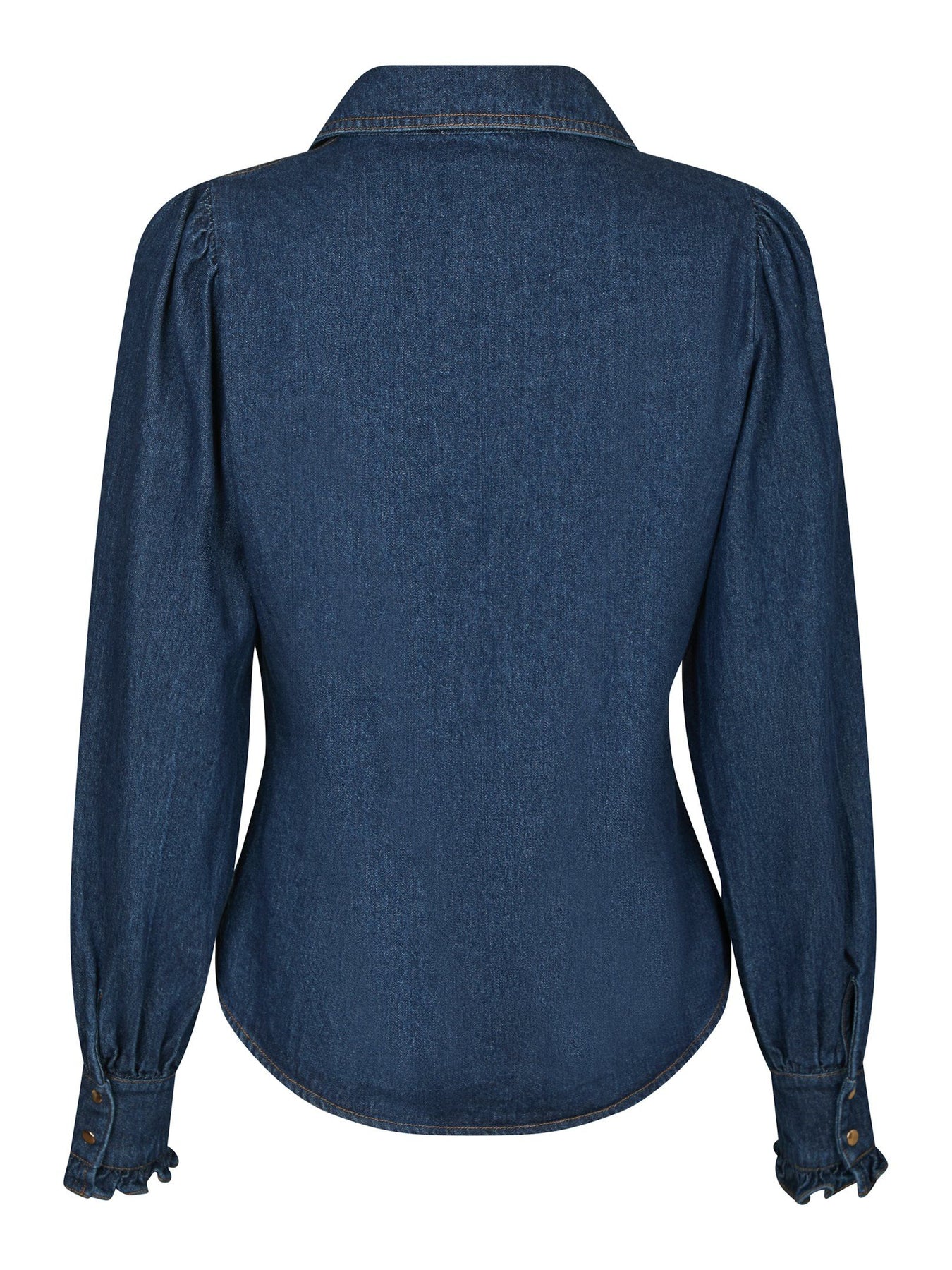 Lio Denim Blouse fra Neo Noir. En klassisk denimbluse med feminine detaljer. Lio Denim Blouse har gullfargede knapper, store brystlommer og en markert krage som gir et elegant uttrykk. De lett puffede skuldrene og rysjene ved mansjettene tilfører en myk og tidløs touch – perfekt til både hverdags og jobb.