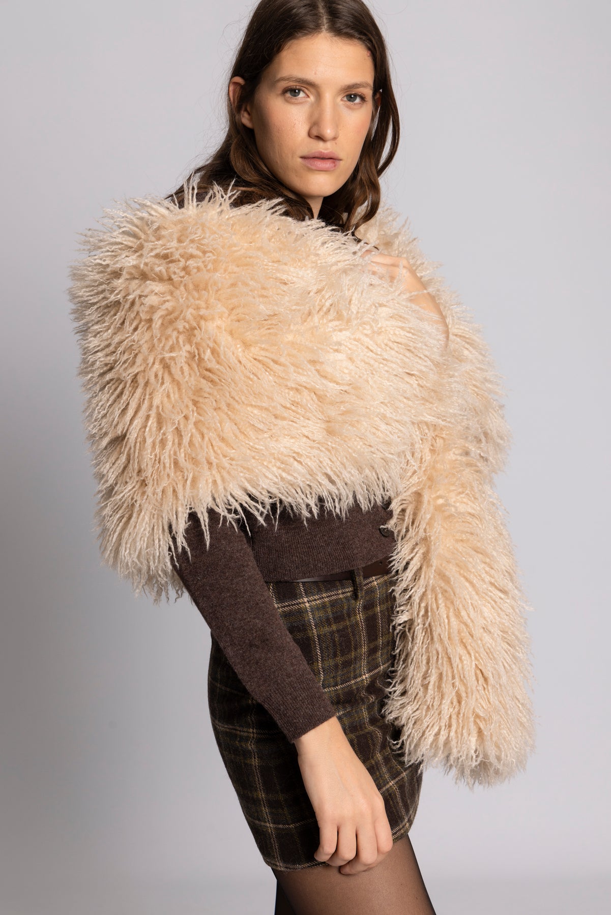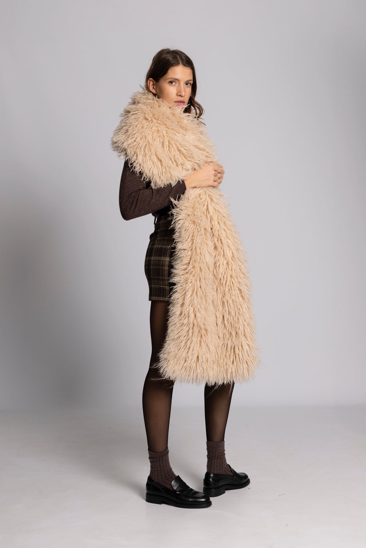 Lynn Faux Fur Maxi Shawl fra VILLOID av Polliani. Lynn Faux Fur Maxi Shawl er et luksuriøst statement-sjal som kombinerer varme og glam. Det voluminøse designet i fluffy faux fur gir en dramatisk silhuett og løfter ethvert antrekk, enten du bruker det over en kåpe eller til kjole. Den lyse beige tonen gir et elegant og mykt uttrykk som passer perfekt til sesongen.