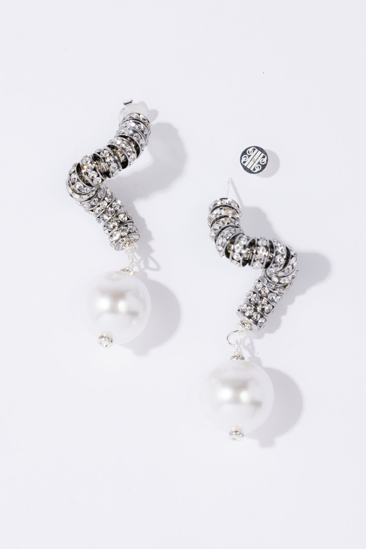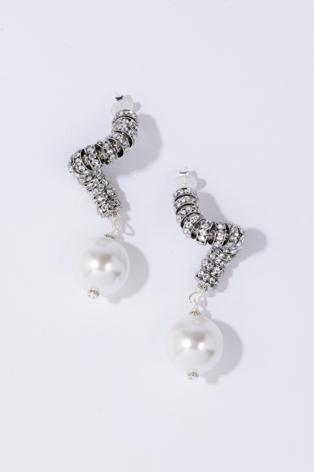 Madonna Earrings fra Pearl Octopuss.y. Disse statement-øredobbene har en stor, skulpturell spiral med glitrende krystaller og en stor akryl-perle.