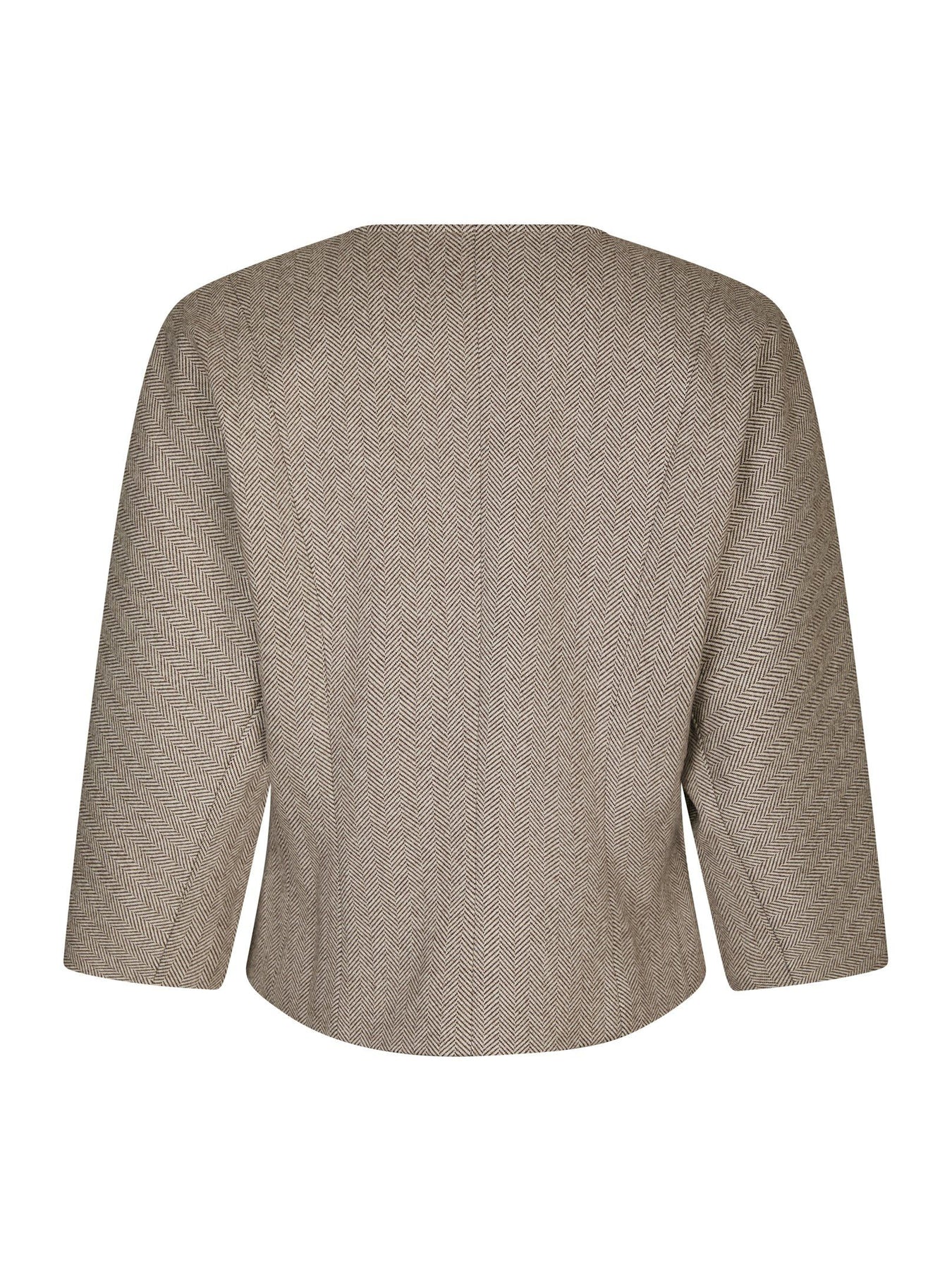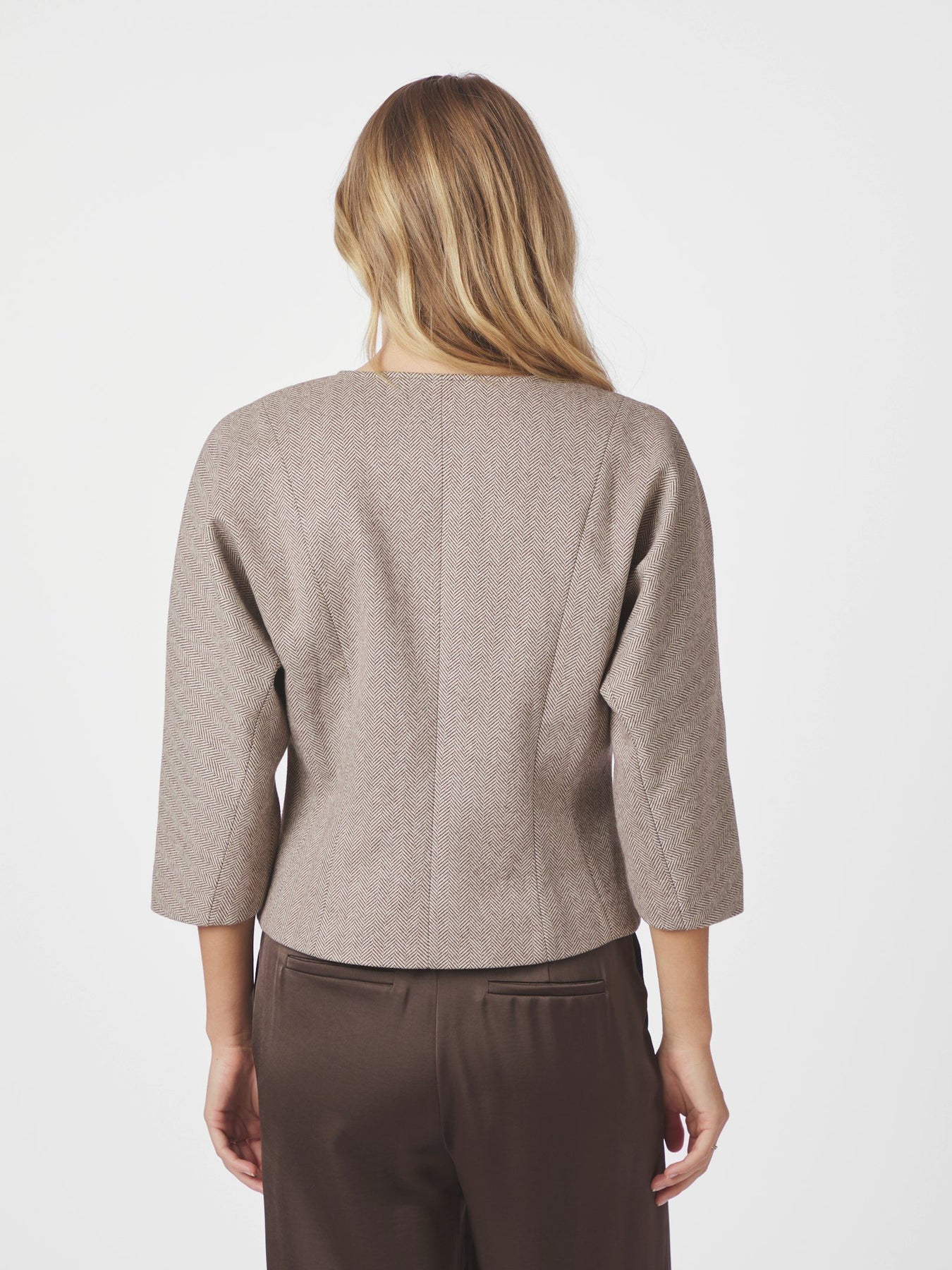Mesto Light Herringbone Jacket fra Neo Noir. En elegant jakke med tidløst fiskebensmønster i myk, strukturert ullblanding. Jakken har rund hals, trekvartlange ermer og store dekorative knapper som tilfører et eksklusivt preg. Den lett innsvingede fasongen gir en feminin silhuett, mens stoffets subtile glans gir et sofistikert uttrykk.
