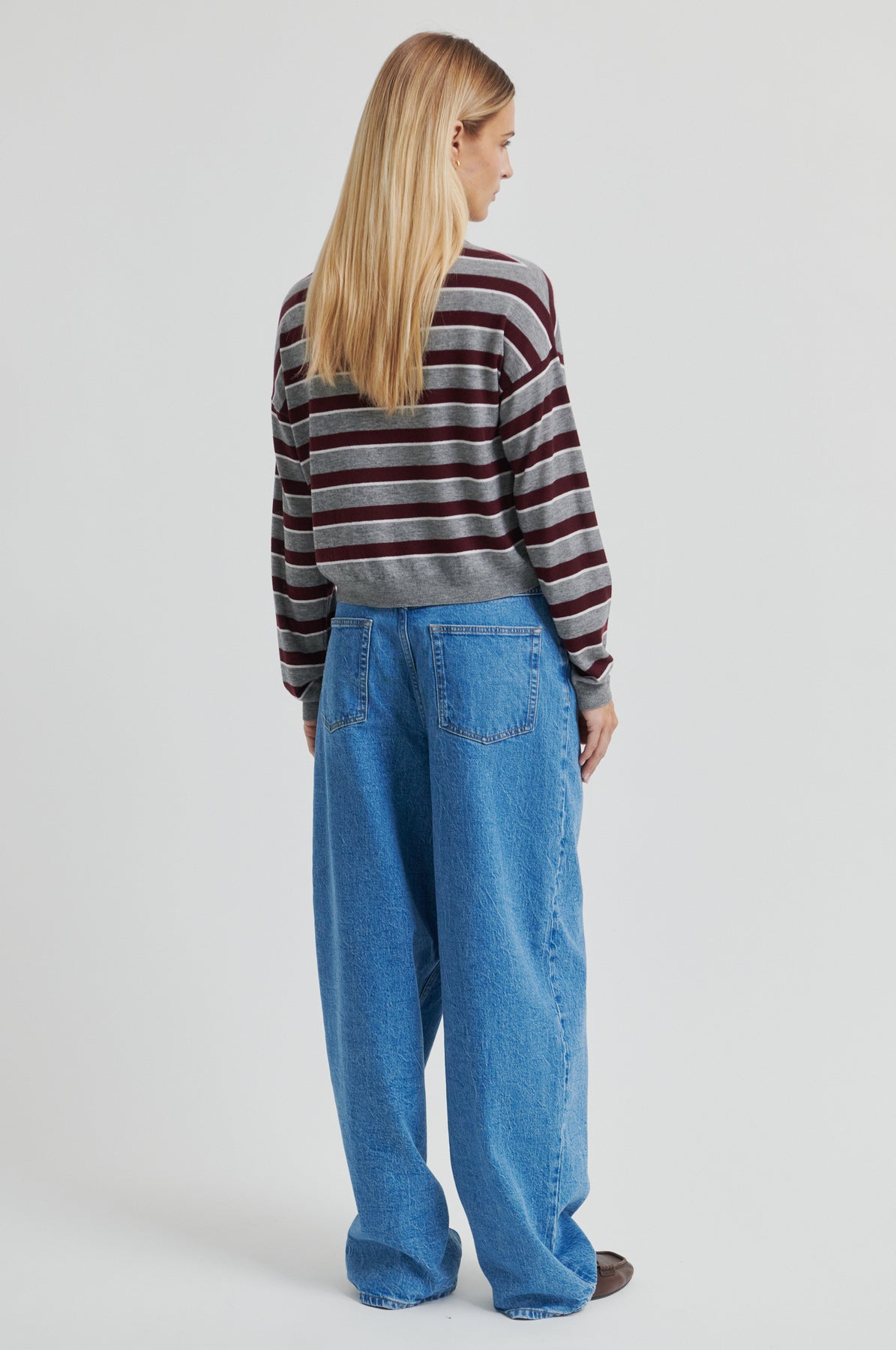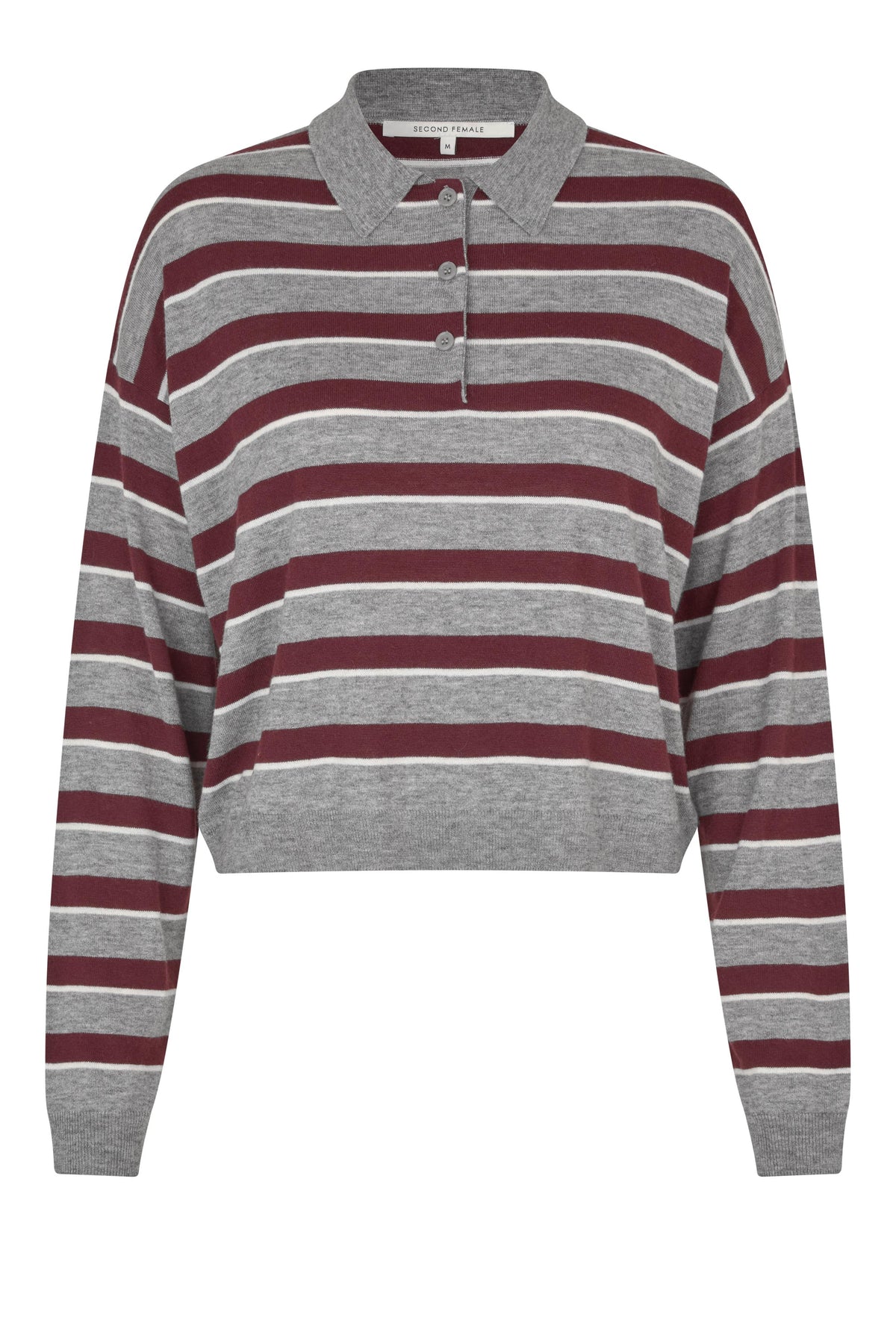 Miley Knit Collar er en stilig, stripete genser fra Second Female. Genseren er laget i en myk og deilig blanding med merinoull, og kommer i et klassisk stripemønster med farger i grått, burgunder og hvitt. Passformen er avslappet med senkede skuldre som skaper en uanstrengt og kul silhuett. Den har en klassisk pologkrage med knapper i front og en litt kortere lengde. Dette gjør den ideell å style sammen med et par jeans eller et skjørt med høyt liv for en moderne og gjennomført look.