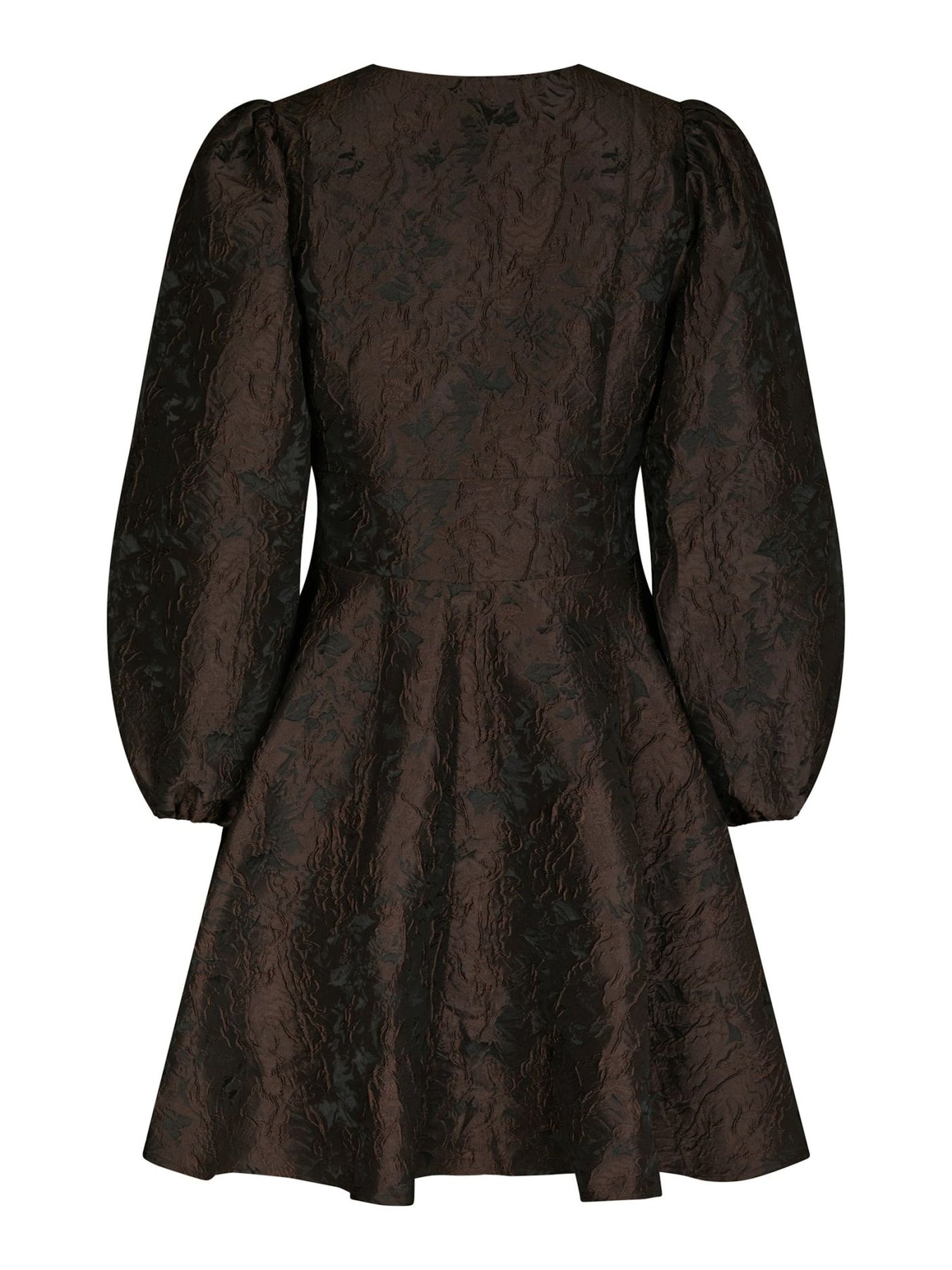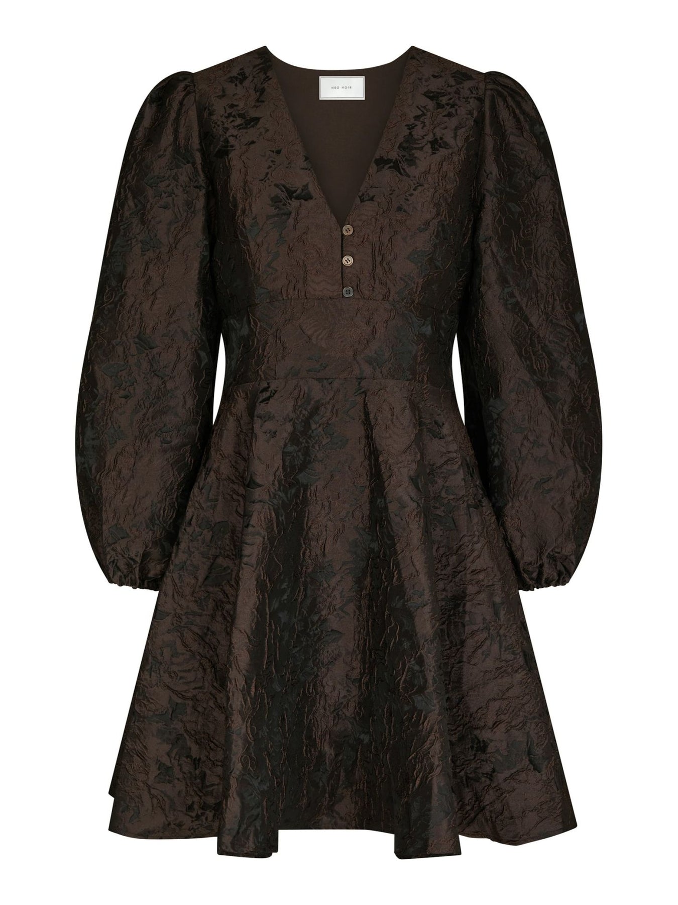 Milly Brocade Dress fra Neo Noir. Cool minikjole fra Neo Noir perfekt for sesongens festlige anledninger. Milly Brocade Dress kommer i en nydelig mørkebrun farge i strukturert sateng med et elegant brokademønster. Kjolen har v-hals med knapper, lange, voluminøse ermer med elastisk mansjett, innsvinget midje og et utsvingt miniskjørt.