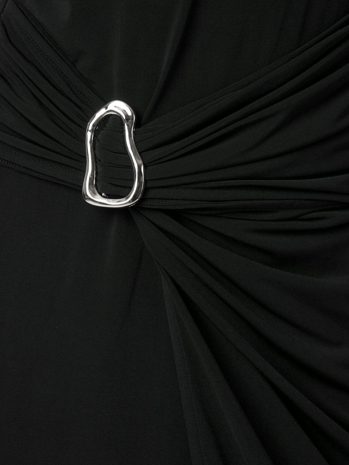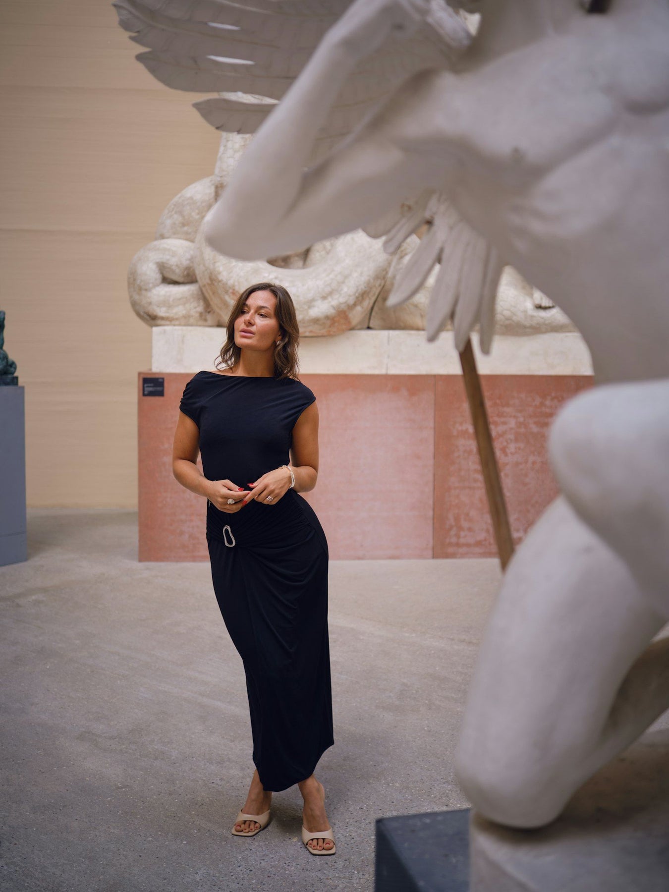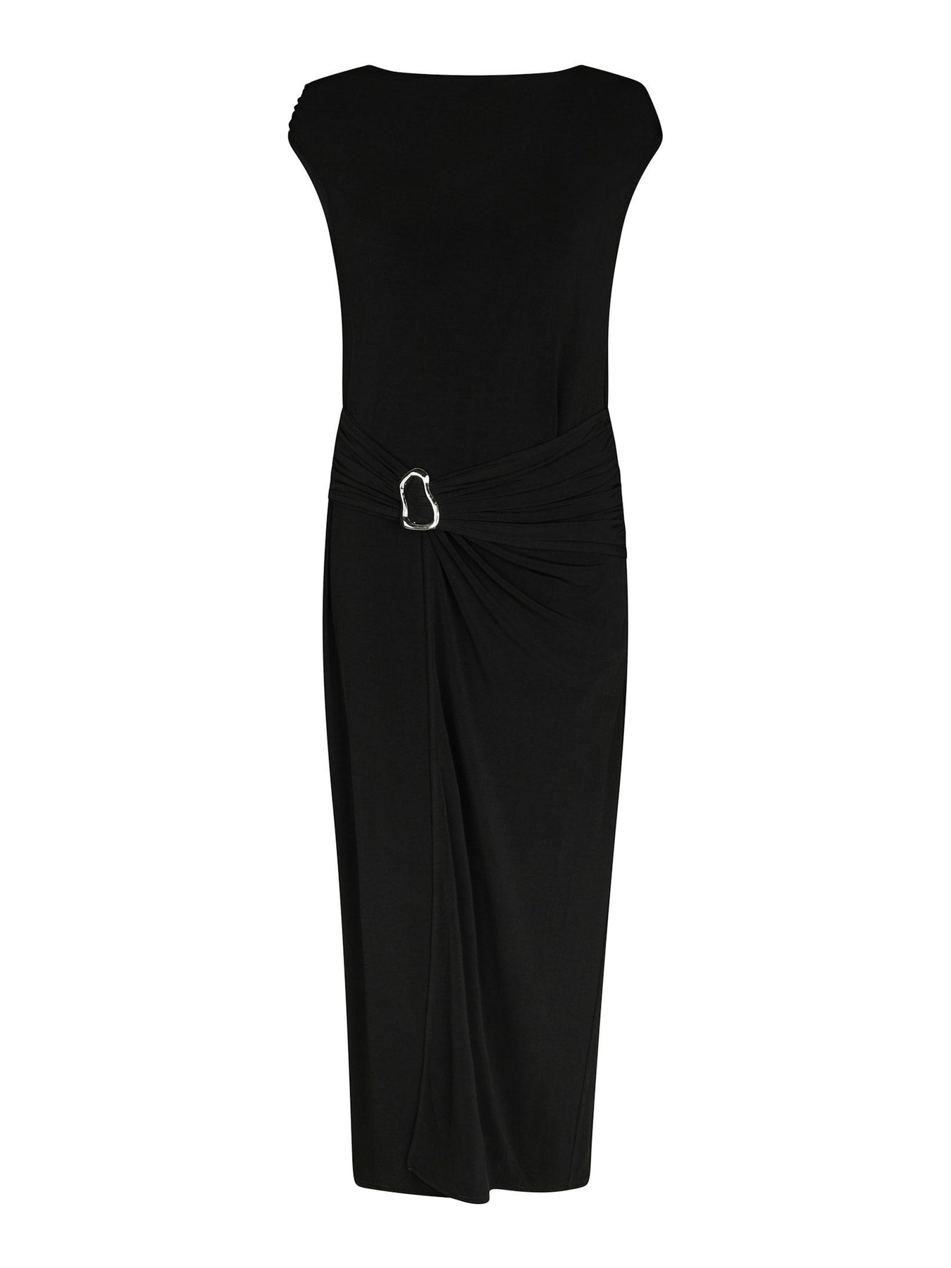 Minja Drapy Dress fra Neo Noir. En elegant kjole som kombinerer en tidløs silhuett med moderne detaljer. Minja Drapy Dress har en smal passform med myke draperinger og et dekorativt sølvspenne i midjen som gir et eksklusivt uttrykk. Den enkle halsutskjæringen og midi-lengden gjør kjolen til et perfekt valg både til fest og formelle anledninger.
