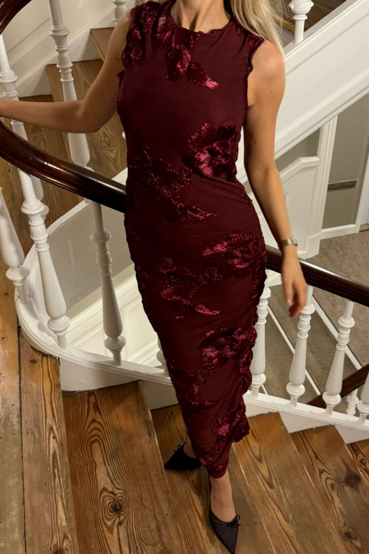 Kjolen er vakkert dekorert med ton-i-ton 3D-blomsterapplikasjoner som gir tekstur og et luksuriøst preg. Med sin ermeløse design, høye runde hals og sofistikerte midilengde, er dette en kjole som garantert vil vekke oppsikt.