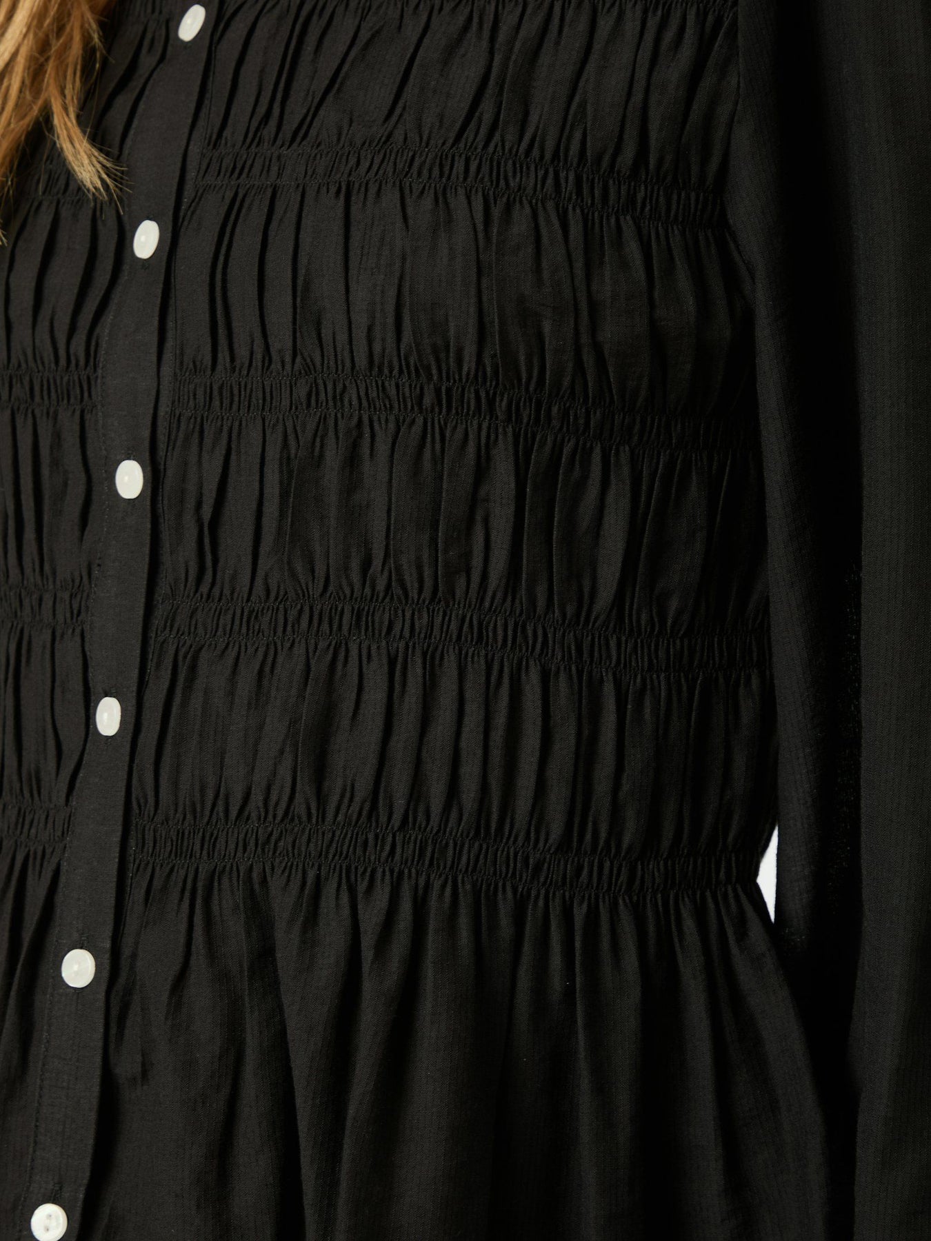 Mocca Smock Blouse har tettsittende smock over hele overdelen og lett utsvingt nedre del som fremhever figuren. Blusen har rund hals med en liten krage, kontrasterende knapper langs fronten og lange ermer med puffede skuldre og bred, elastisk mansjett. Små volangkanter ved hals, mansjetter og nederkant tilfører en myk, feminin touch.