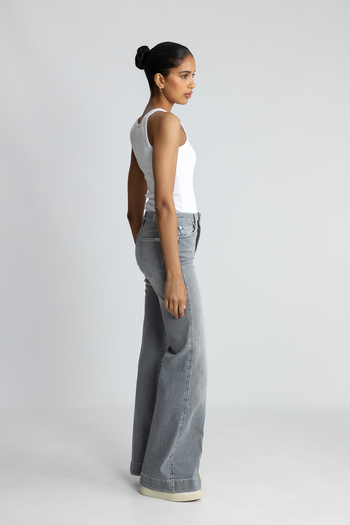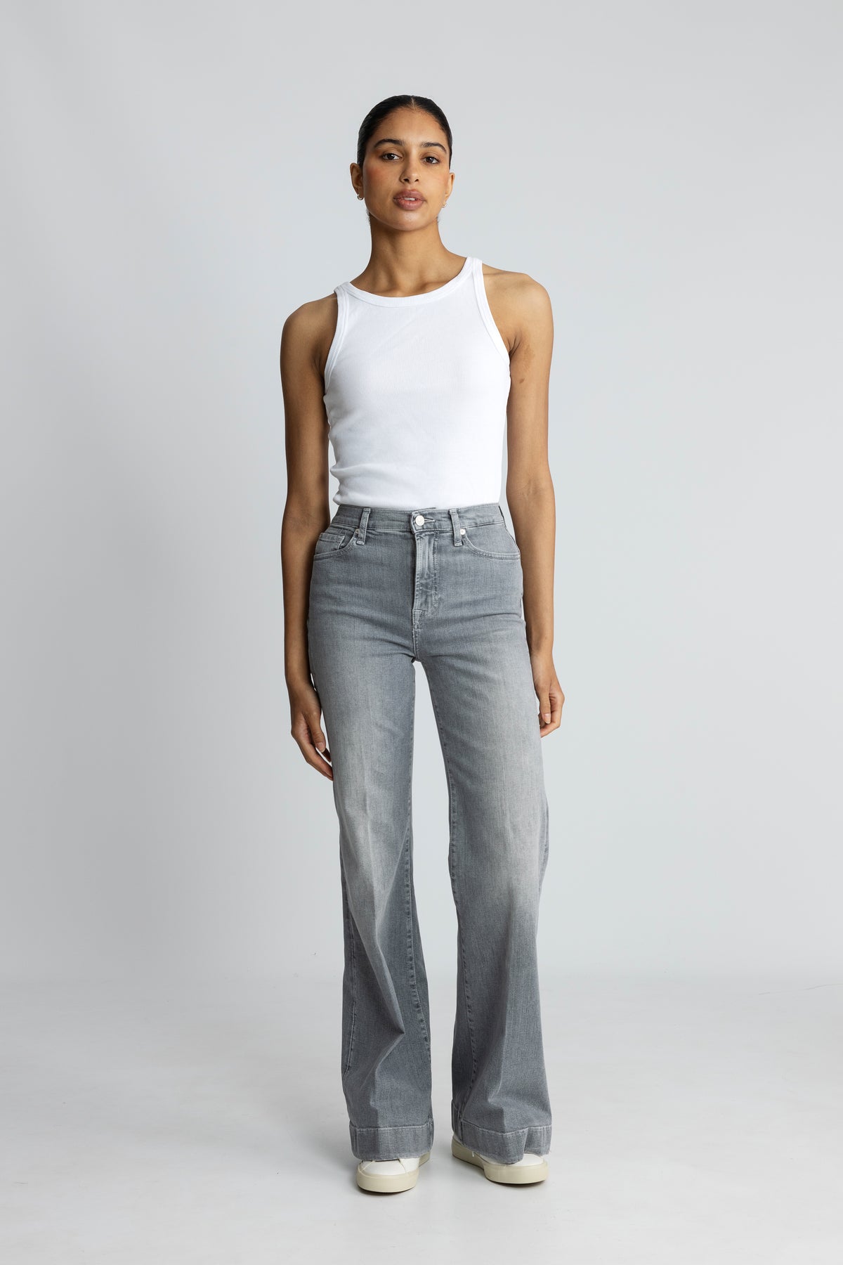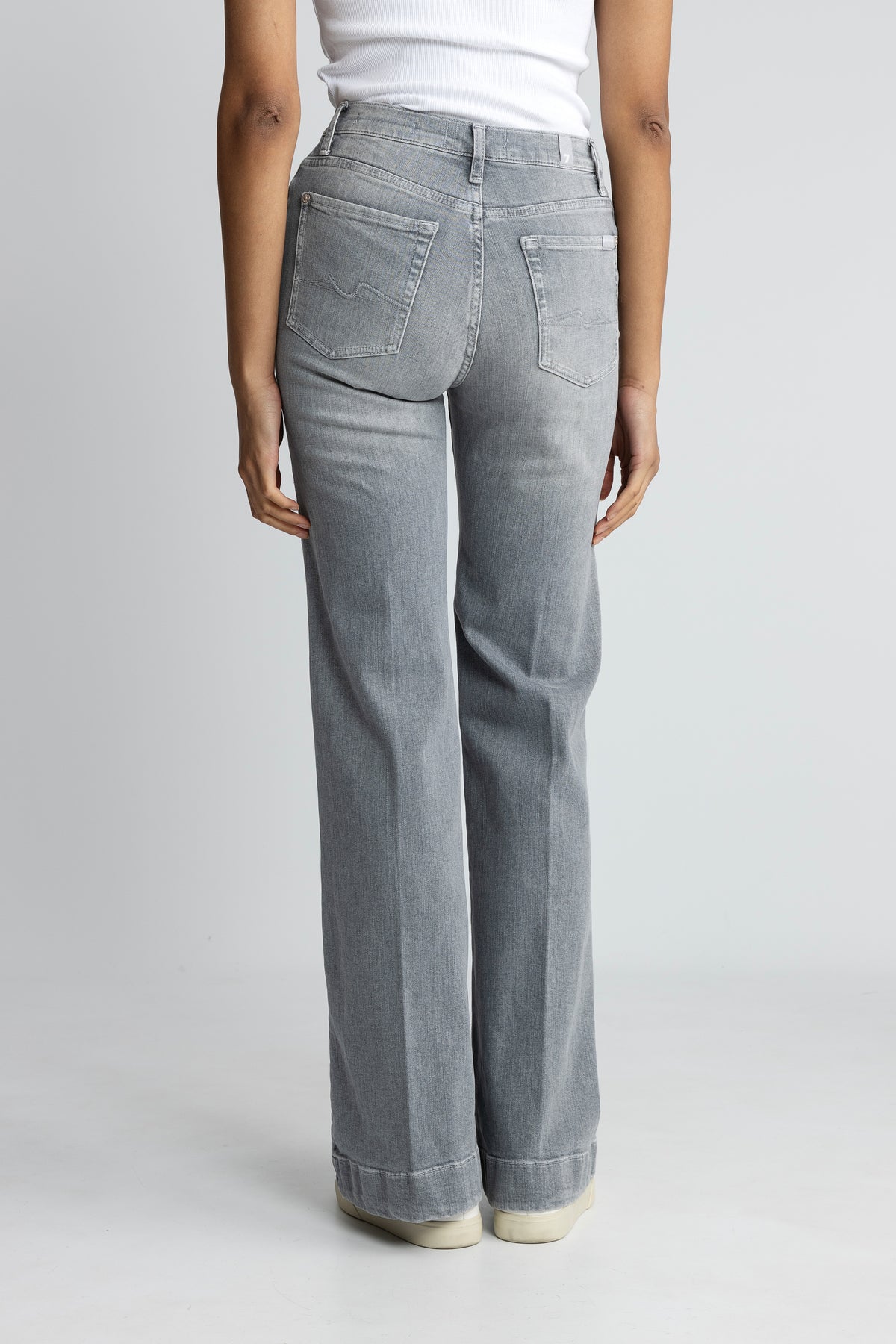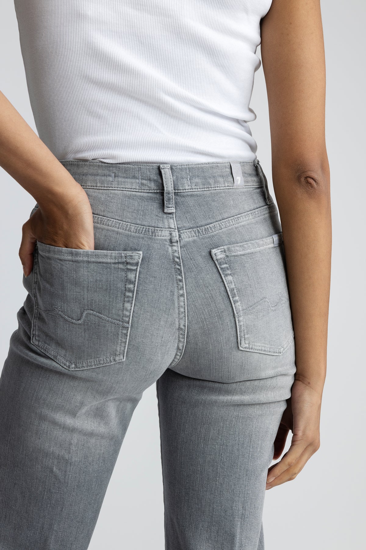 Modern Dojo fra 7 For All Mankind. Et ikon er tilbake, Modern Dojo gir deg en moderne vri på den klassiske vide jeansen. Denne grå vasken har en diskré slitt effekt og ekstra bred kant nederst, som gir et sofistikert men avslappet uttrykk. Jeansen har høy midje og en figurnær passform over hofter og lår før den faller ut i en bred benvidde, perfekt for å forlenge silhuetten.