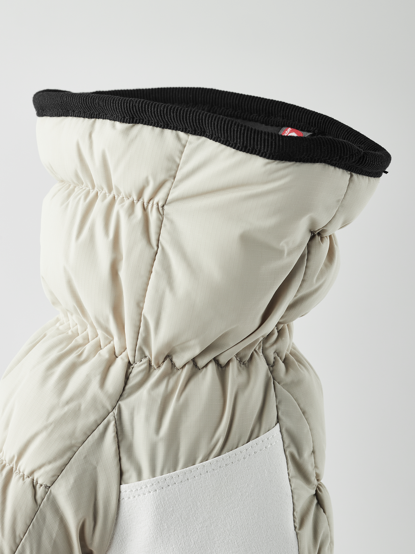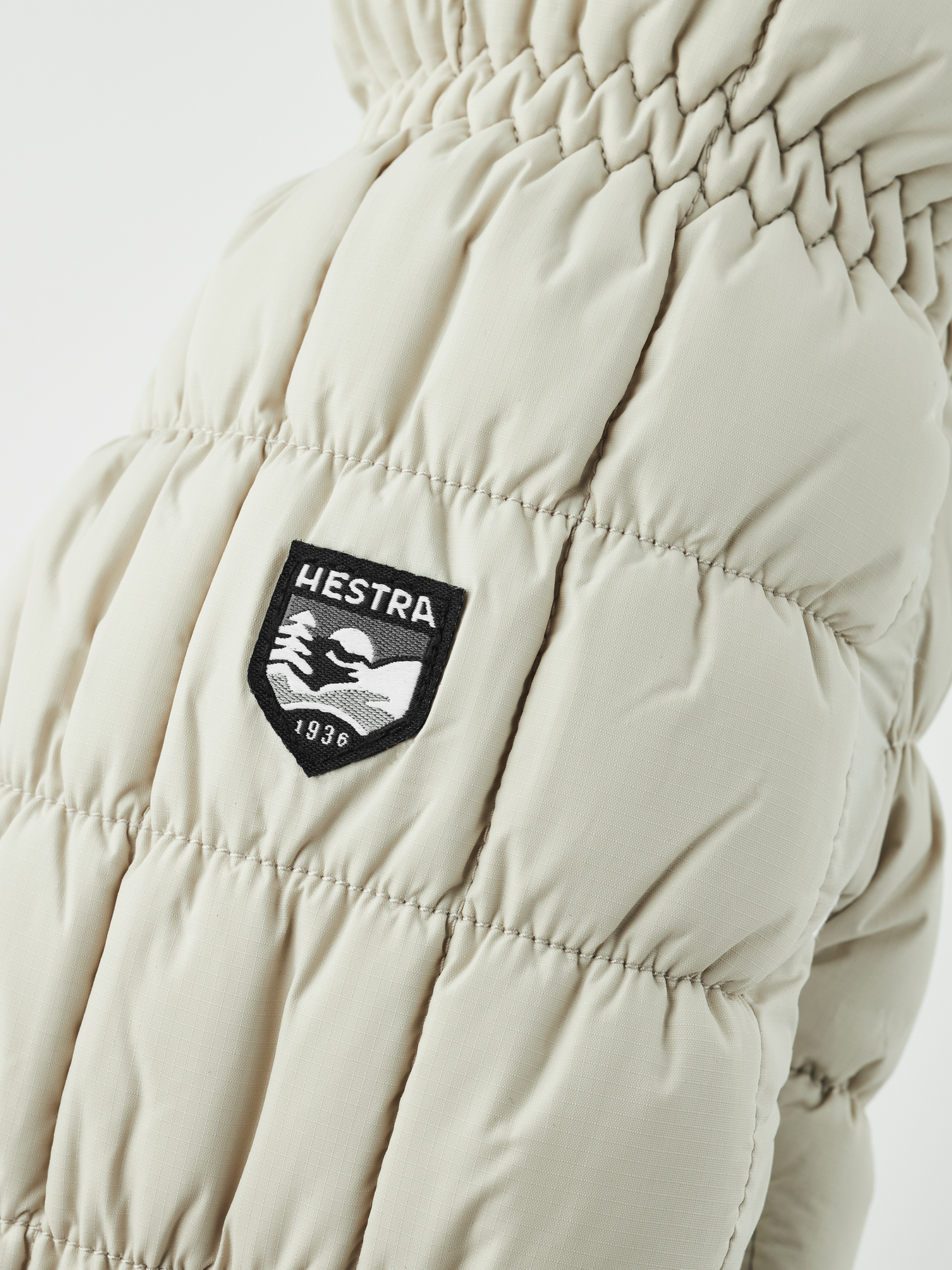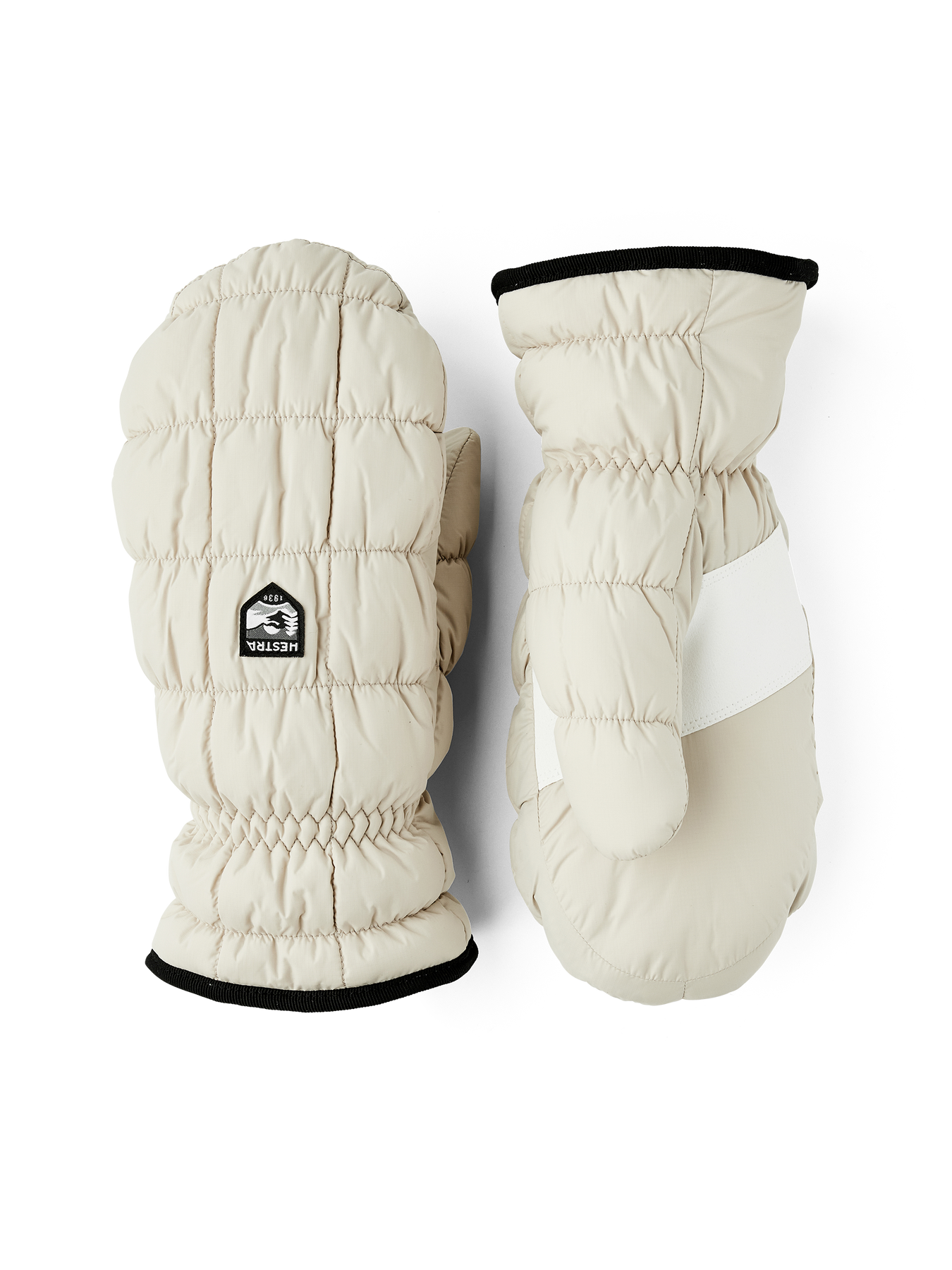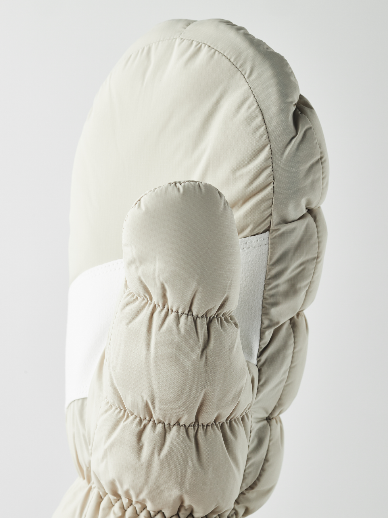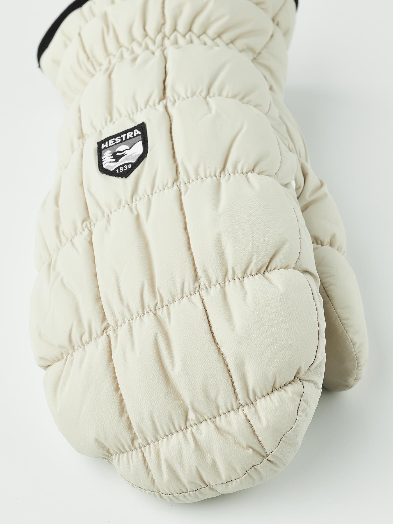 Moon Mitt fra Hestra. Supervarme og lette votter designet for iskaldt vær og arktiske eventyr. Moon Mitt i fargen Natural Beige kombinerer høy funksjonalitet med et chunky, quiltet uttrykk som gir både komfort og stil. Yttermaterialet i vindtett og vannavstøtende polyamid gir beskyttelse mot elementene, mens innvendig isolasjon og myk fleece sørger for maksimal varme. Elastiske detaljer rundt håndleddet og slitesterk håndflate i geiteskinn gir en trygg og fleksibel passform – ideell for alt fra toppturer til kalde byturer.
