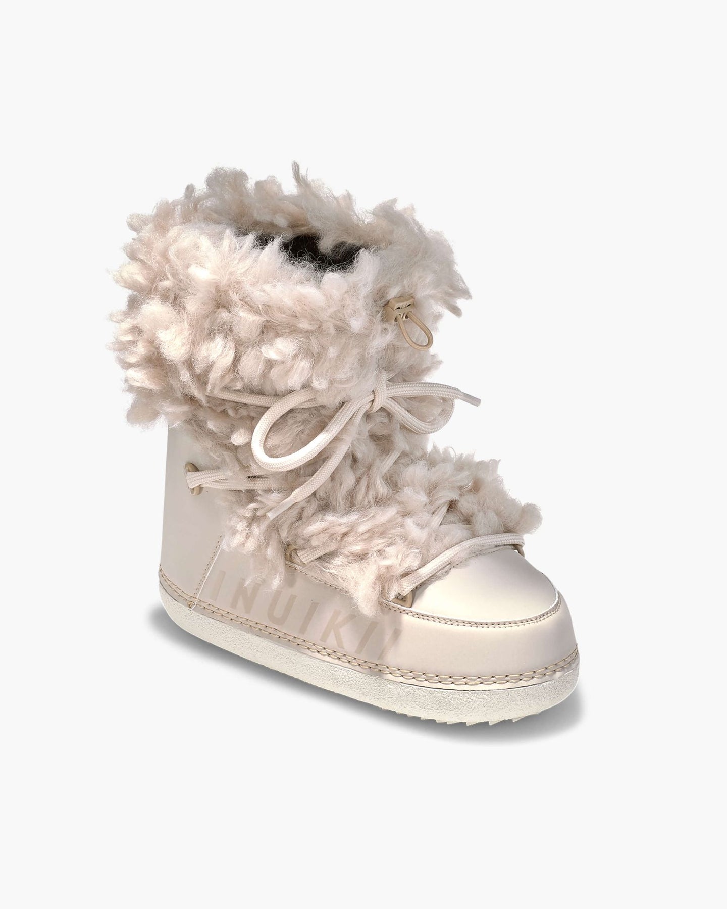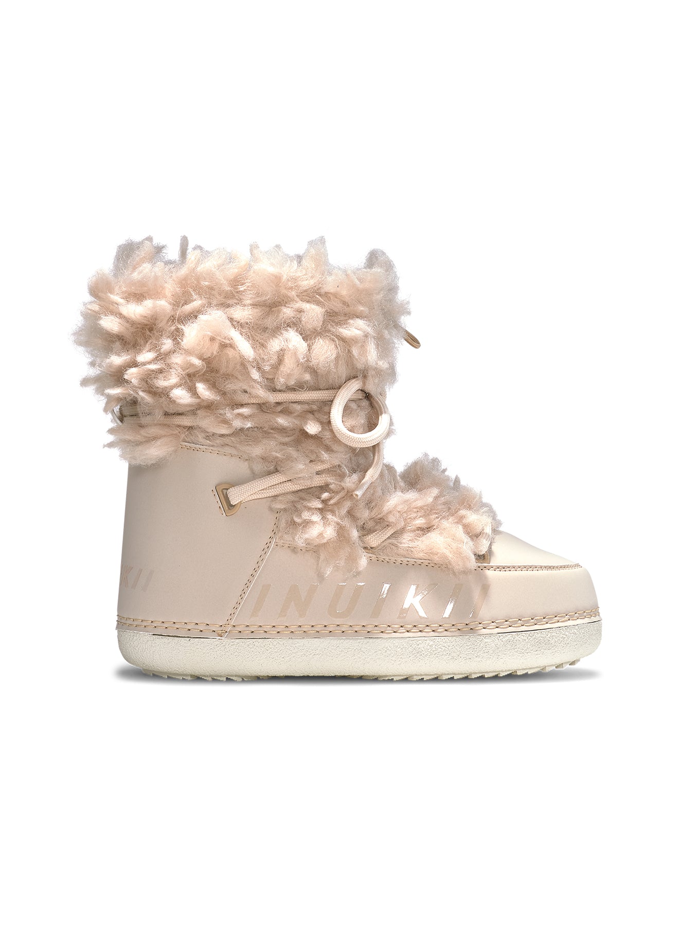 Mountain Teddy fra INUIKII. En luksuriøs vinterboot i kremfarget skinn med fluffy, langhåret ull som gir et eksklusivt og lekent uttrykk. Mountain Teddy har dekorative snørelisser med metallringer, avrundet tå og ikonisk INUIKII-logo på siden. Den robuste, fleksible sålen gir godt grep, mens ullfôret holder deg varm gjennom hele vinteren.