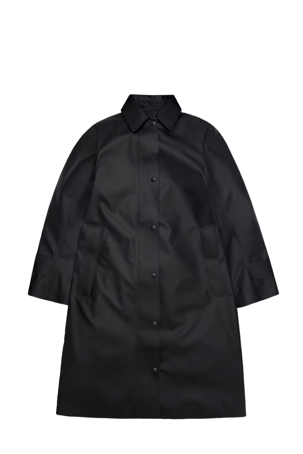 Nara W Long Jacket fra Rains. Nara W Long Jacket er en moderne og funksjonell regnfrakk med minimalistisk design. Jakken har en klassisk A-formet silhuett og er laget i et vannavstøtende, matt PU-materiale som holder deg tørr med stil. Den har trykknapper foran, skrålommer, og en avtakbar hette som gir ekstra beskyttelse mot vær og vind.