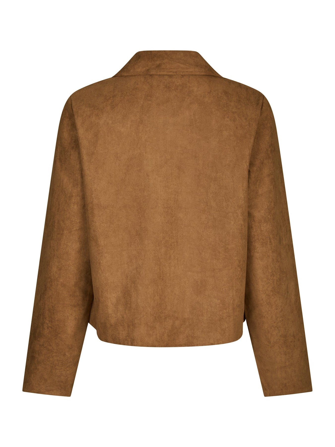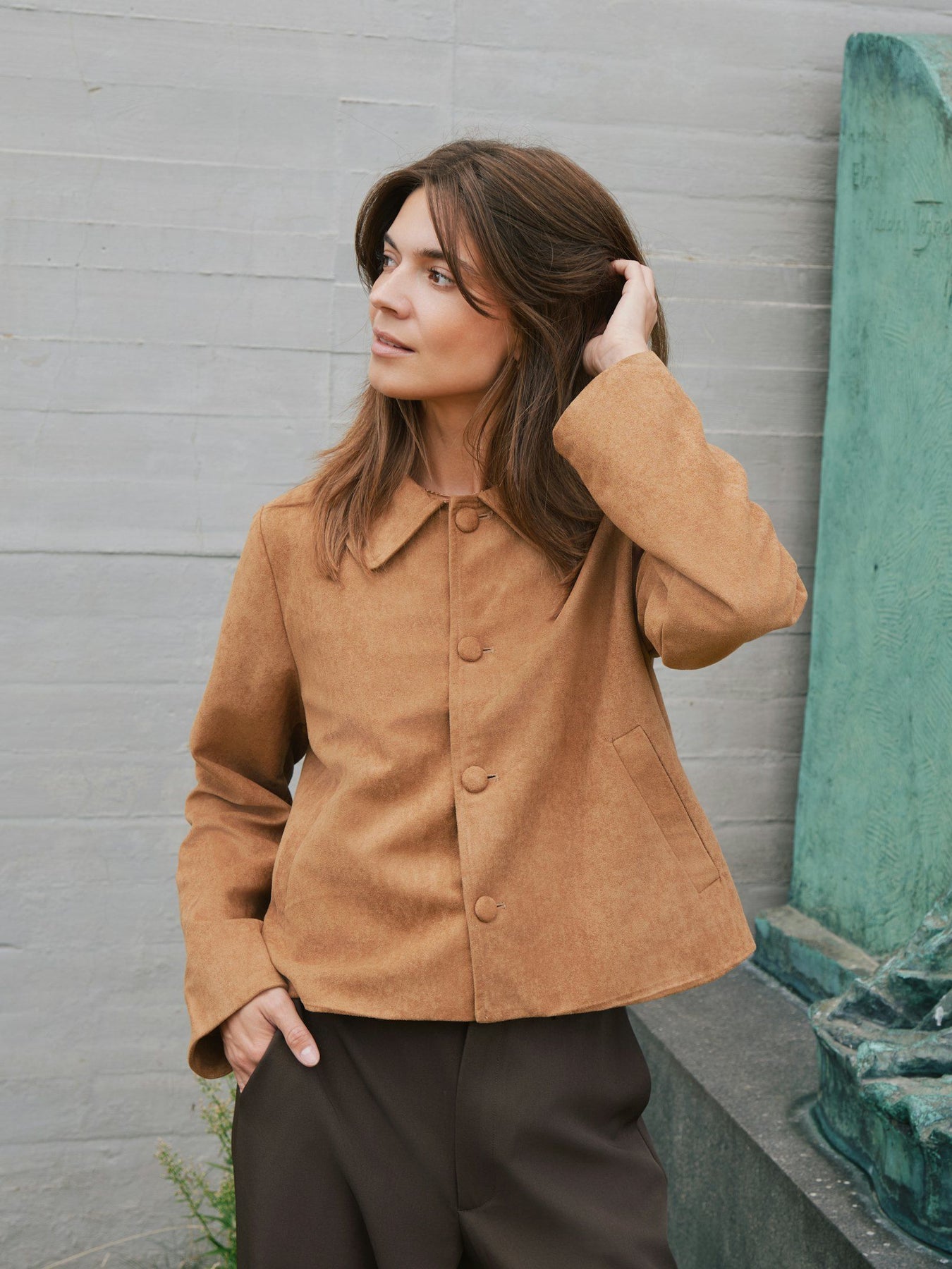 Nilo Faux Suede Jacket fra Neo Noir. Minimalistisk og elegant jakke i dyp sjokoladebrun farge fra Neo Noir. Denne jakken har en feminin og sofistikert look med sin rene silhuett og myke semskede overflate. Jakken er cropped med avrundet krage, ton-i-ton knapper og skjulte stikklommer – perfekt til både hverdags og mer pyntede anledninger.