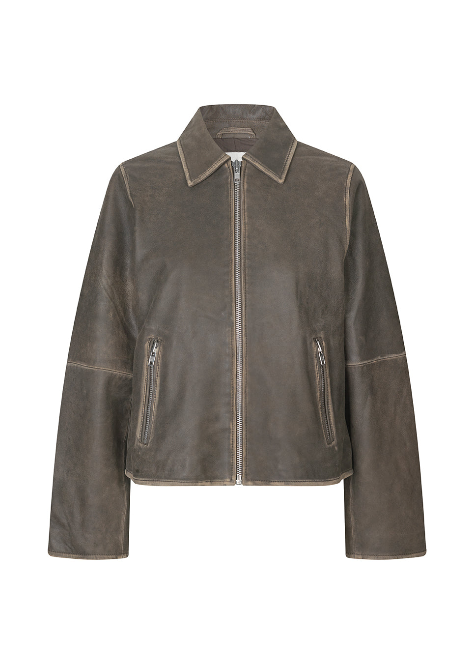 Nima Jacket fra Modström. Cool skinnjakke fra Modström med en vintage look. Nima Jacket har en avslappet passform med krage, glidelås langs fronten og sidelommer med glidelås i front. Jakken er laget i mykt lammeskinn og kommer i en fin, brun farge. Perfekt over en søt kjole eller et blondeskjørt.