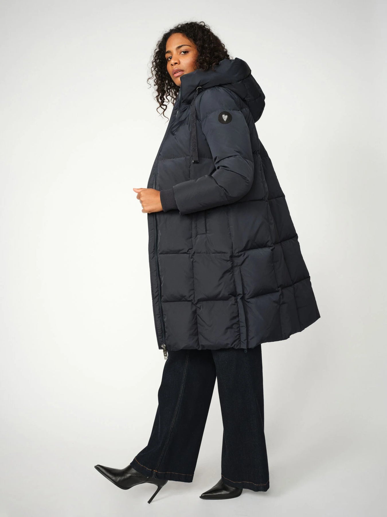 Nova Square Down Coat fra Mos Mosh. Hold deg varm på kjølige dager med denne superlette, men likevel varme dunjakken fra Mos Mosh. Nova Square Down Coat har lang passform og kraftig glidelås, og kult rutete vattert mønster, fylt med ansvarlig dun. Høy, praktisk krage og splitt i sidene, noe som gjør passformen ekstra fleksibel.