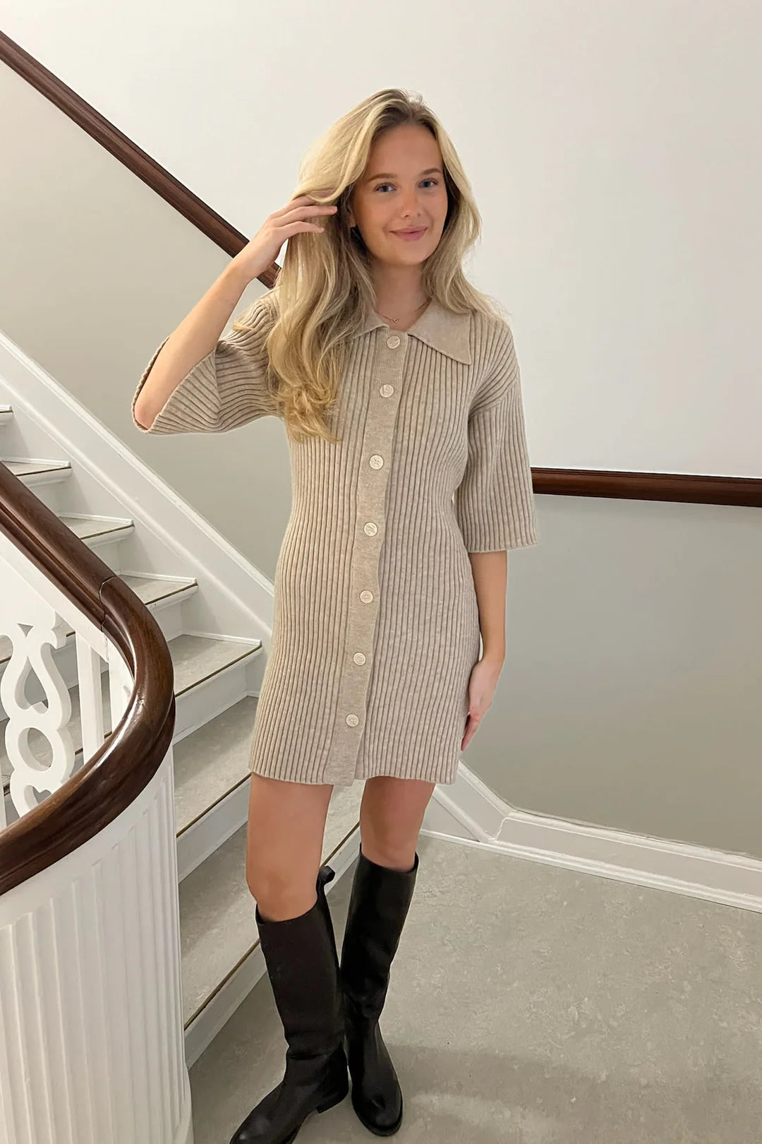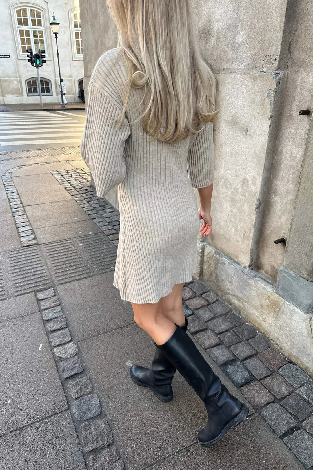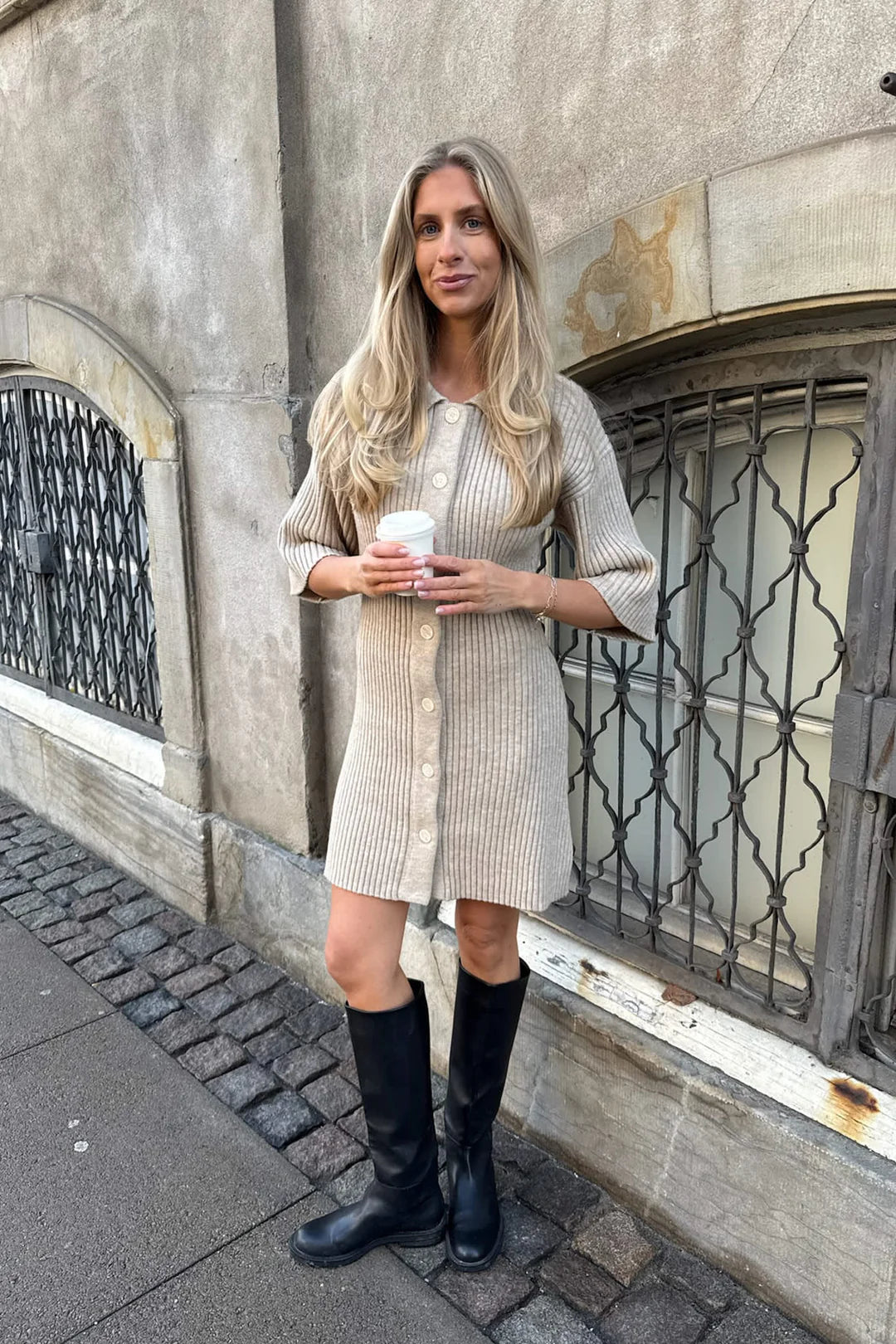 Oliviaic Knit Dress fra BYIC. En myk strikkekjole i klassisk beige som kombinerer komfort med tidløs stil. Kjolen har en rett passform med knelang lengde og vide, korte ermer som gir et balansert uttrykk. Kontrastknapper i front setter et lekent preg, mens den klassiske skjortekragen tilfører et strukturert og sofistikert element. Perfekt å bruke både alene med støvler eller lag-på-lag til kalde dager.