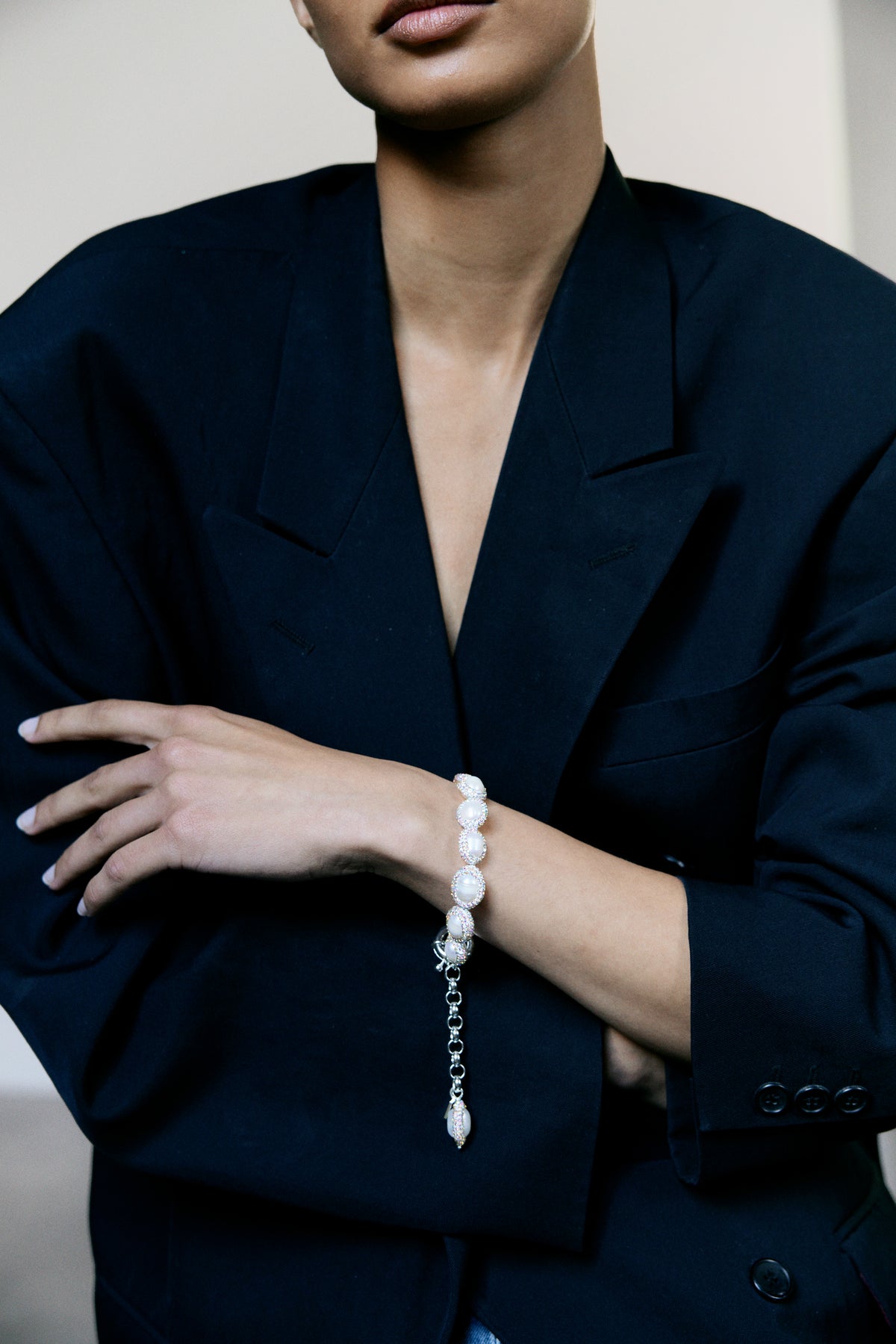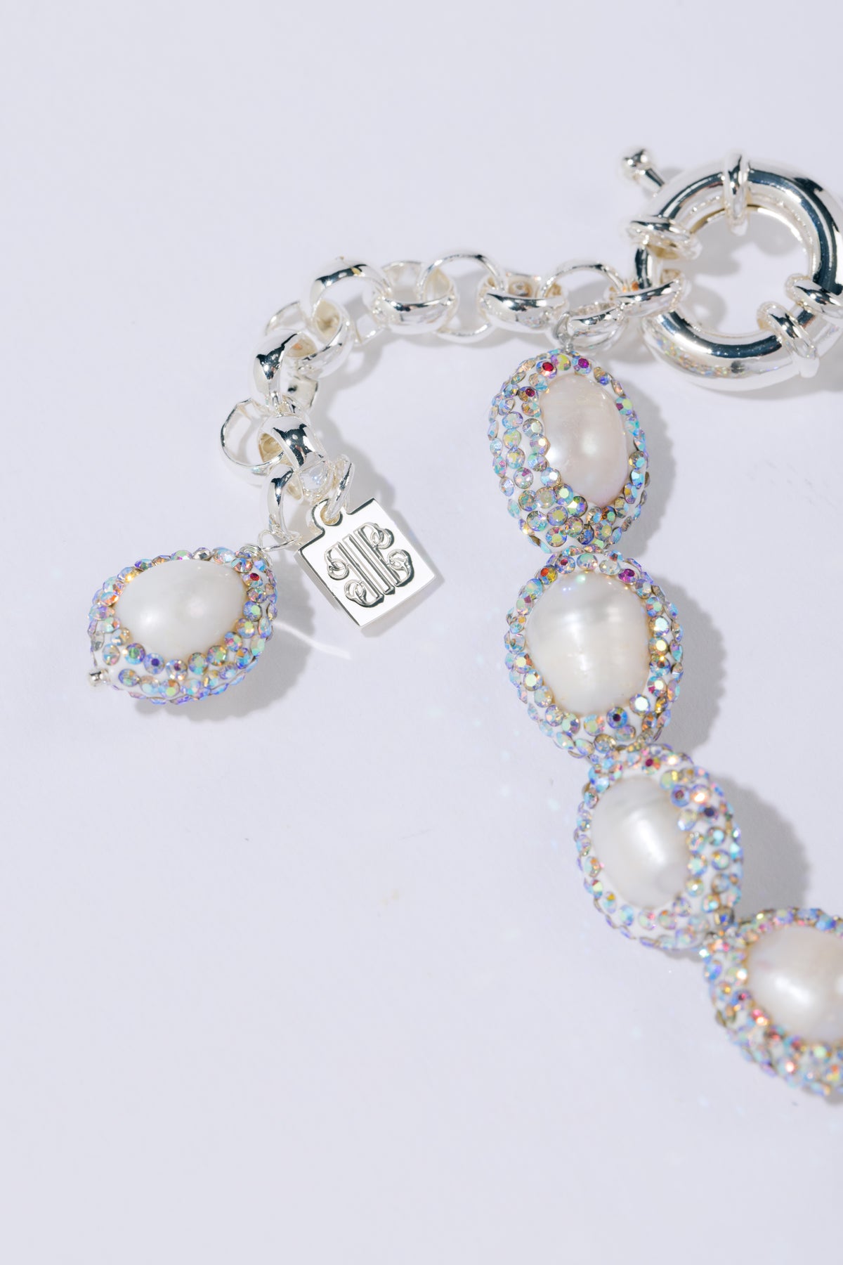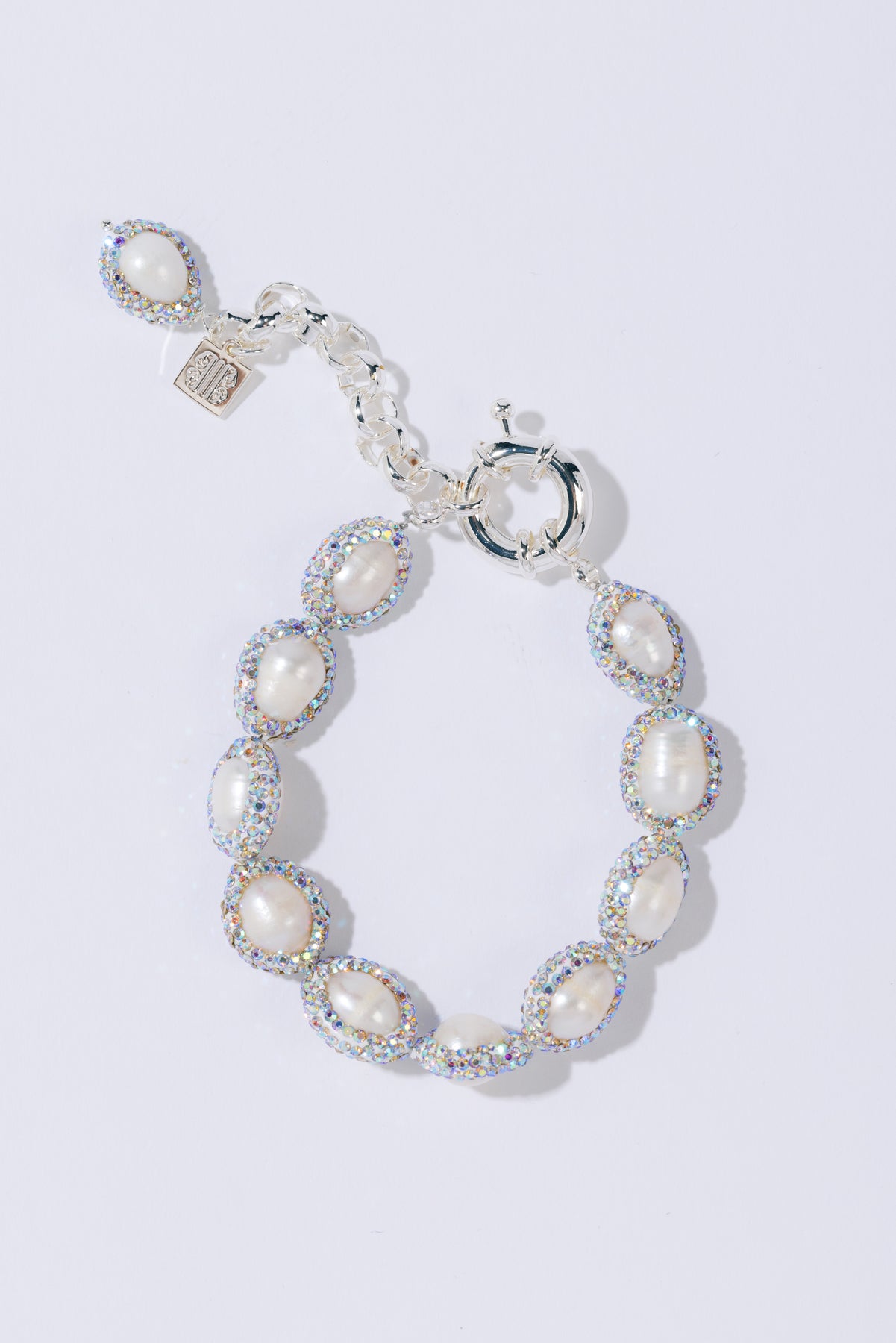 Pearl Drop Bracelet fra Pearl Octopuss.y. Med glitrende ferskvannsperler gir dette armbåndet et preg av moderne eleganse. De iriserende strass-stenene reflekterer lyset vakkert, noe som gjør det til den perfekte partneren til ditt favorittantrekk nå du vil skinne litt ekstra.
