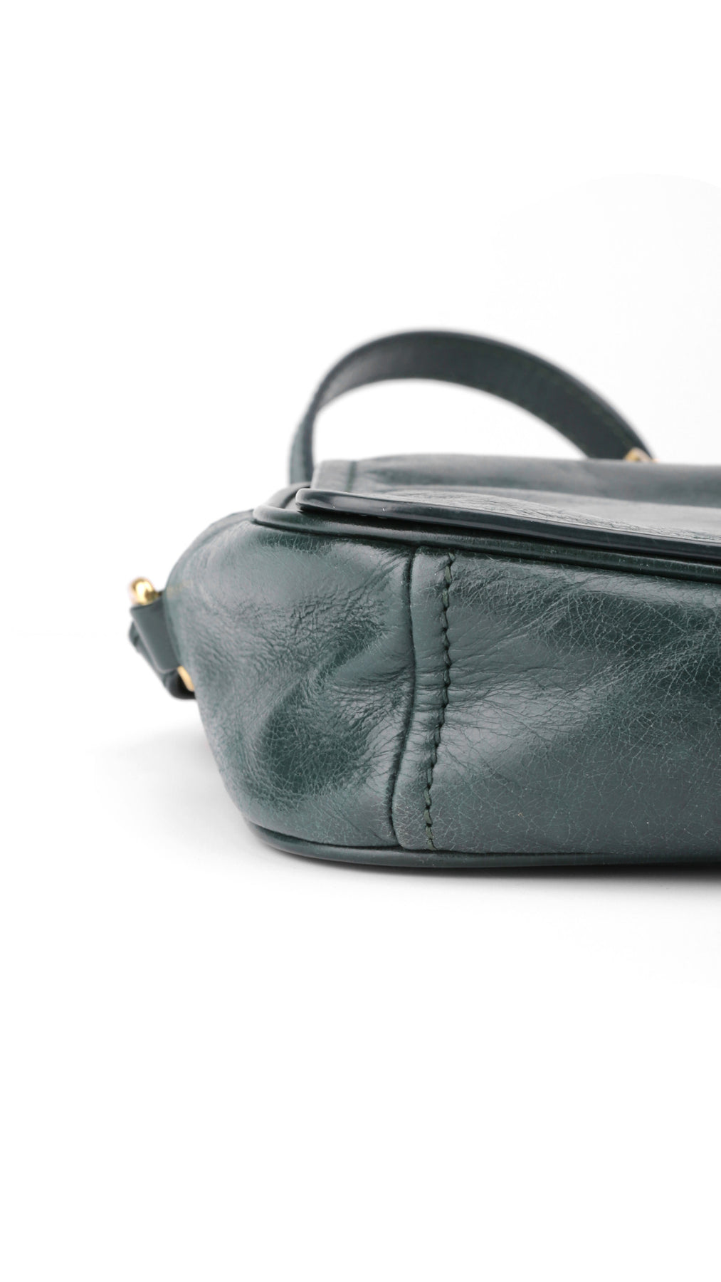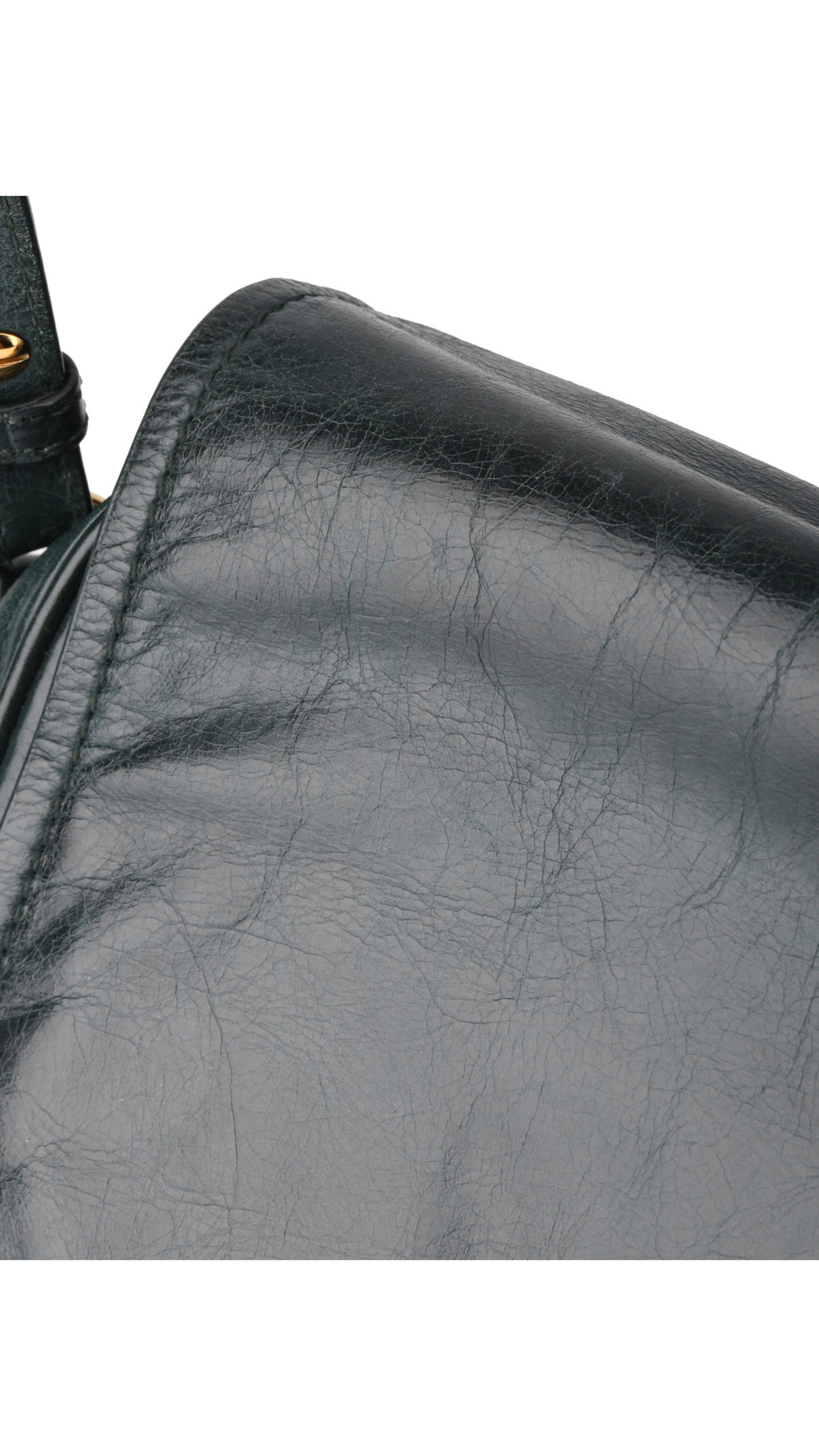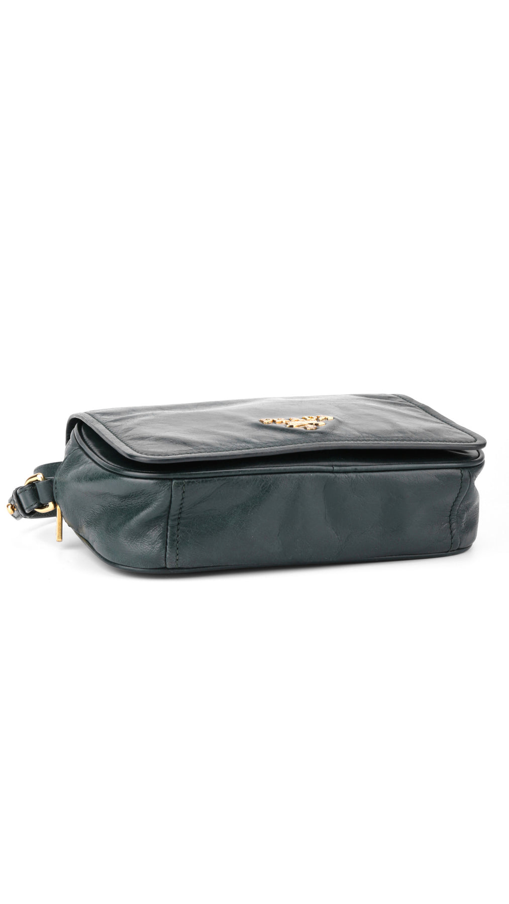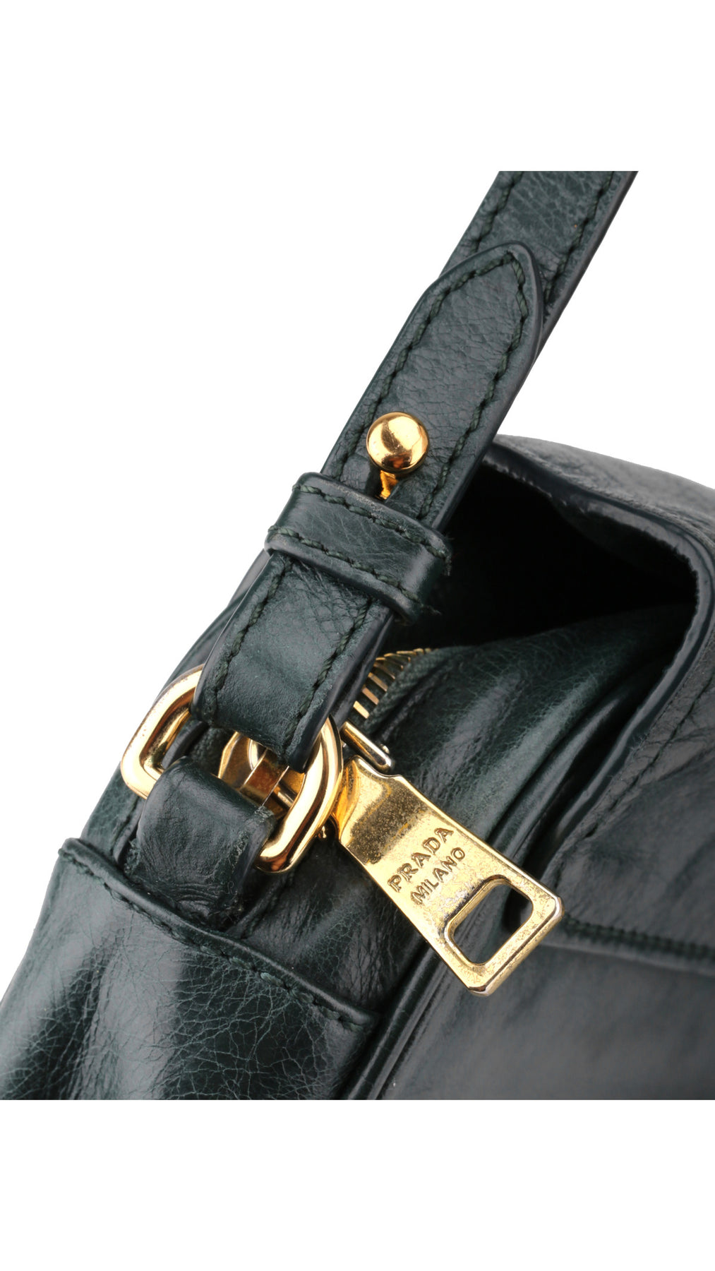 Prada Logo Crossbody Bag er en elegant og allsidig veske som kombinerer avslappet luksus med praktisk funksjonalitet. Det myke, krakelerte skinnet har en dyp, mørkegrønn tone som gir vesken et sofistikert og unikt uttrykk, perfekt for både hverdagsbruk og kveldsanledninger.
