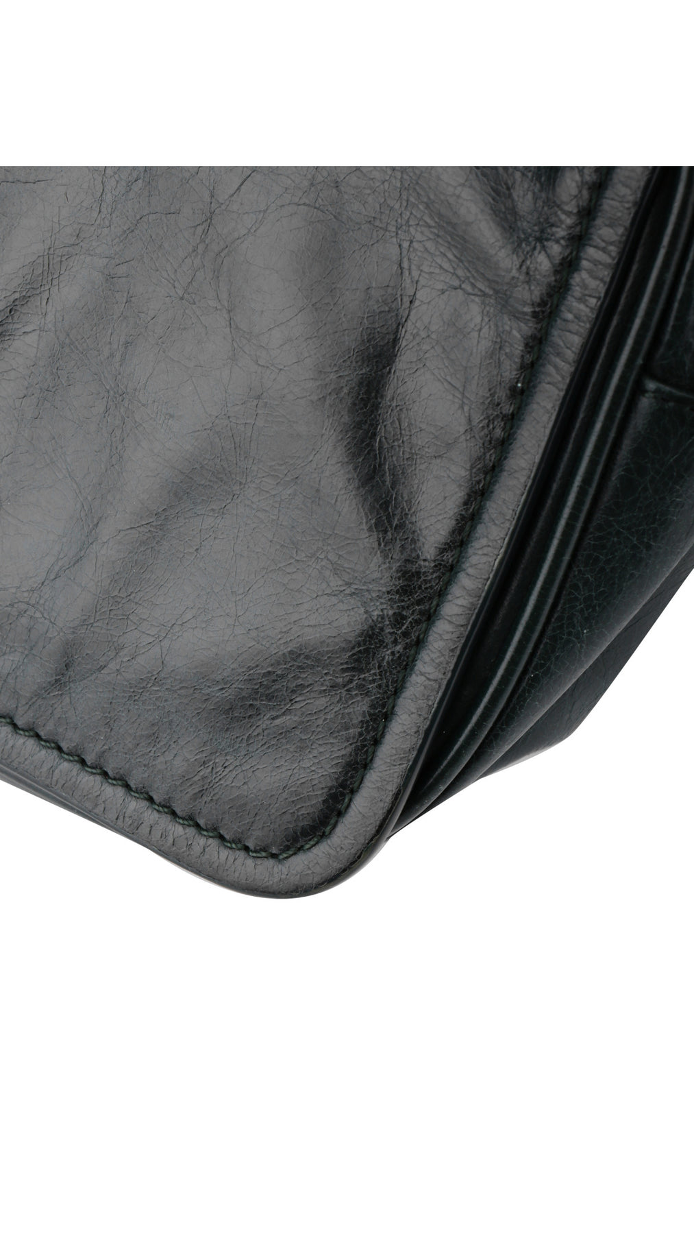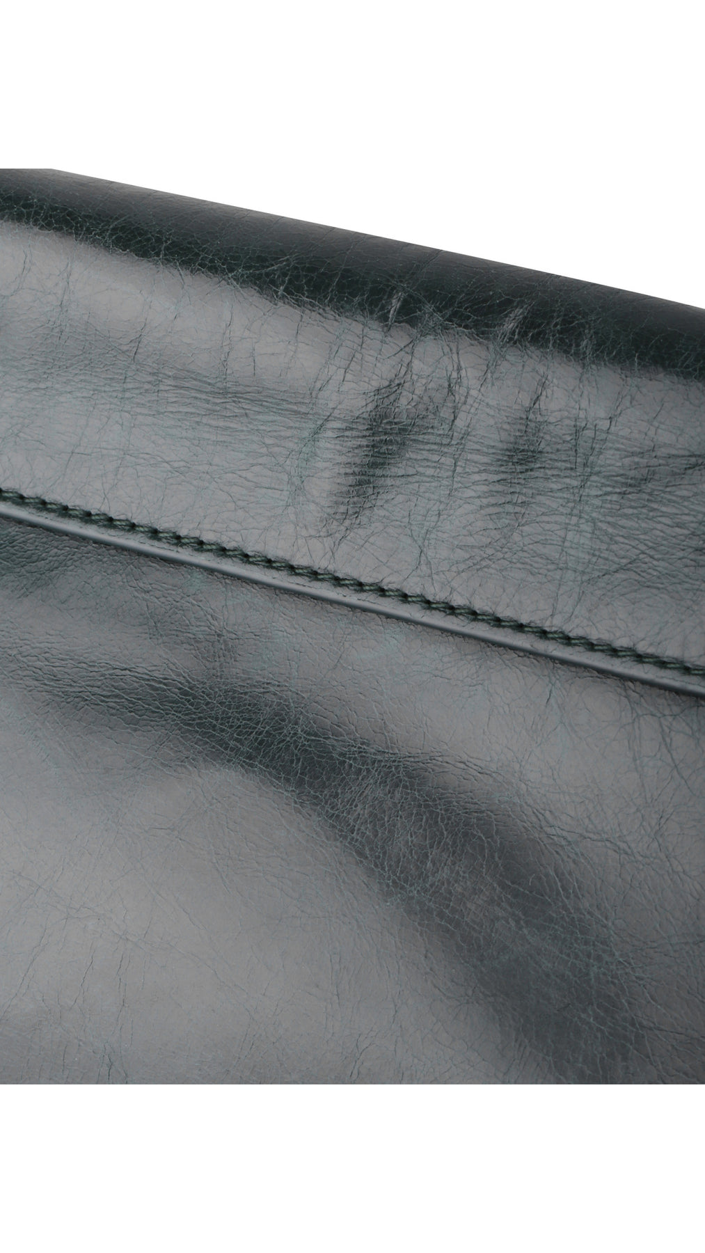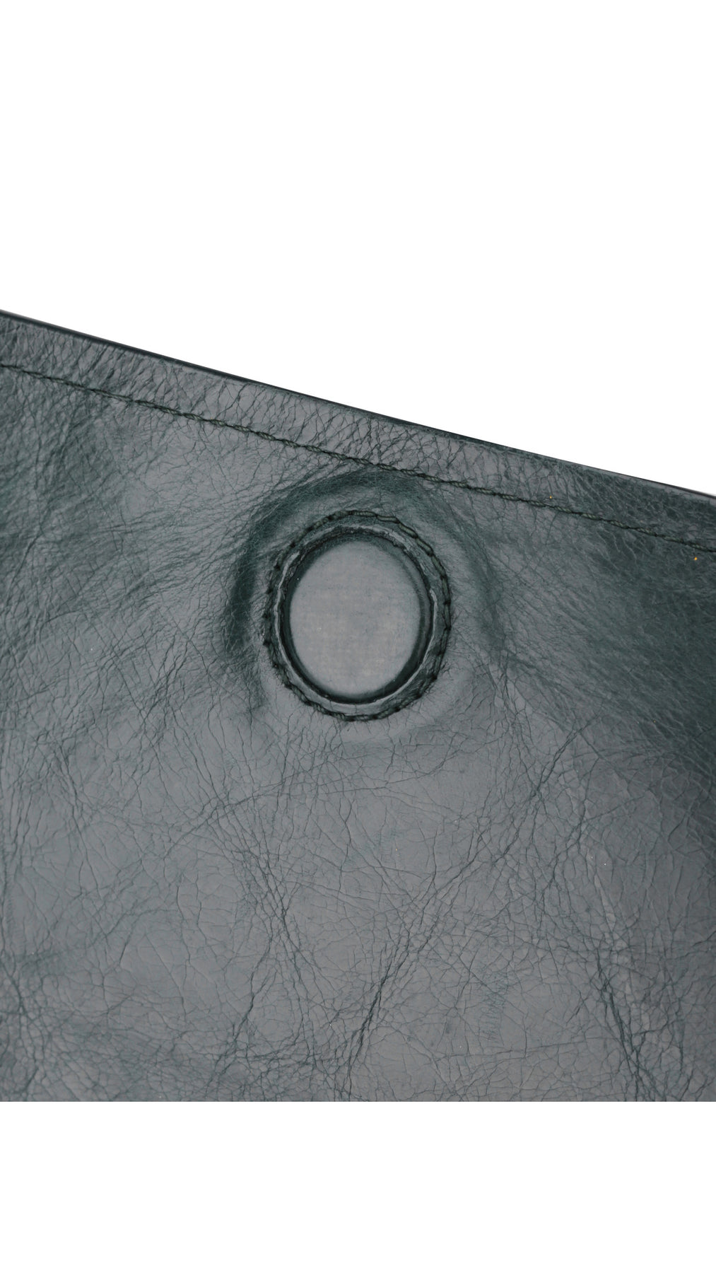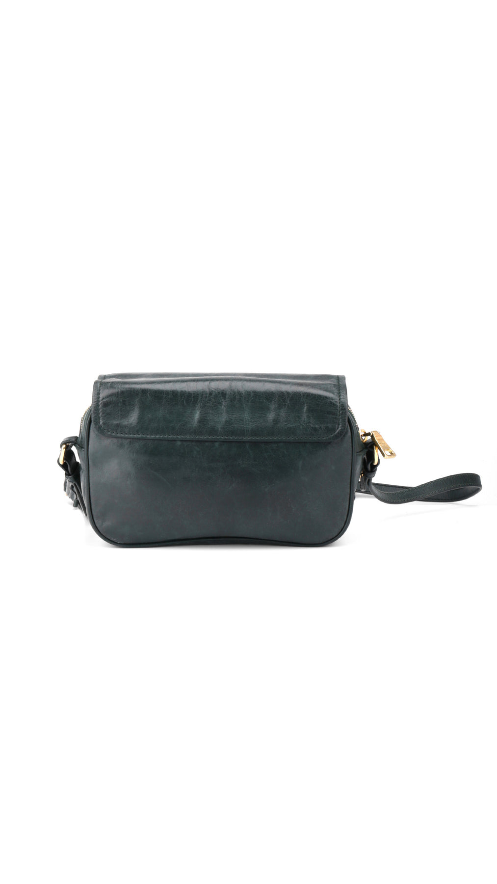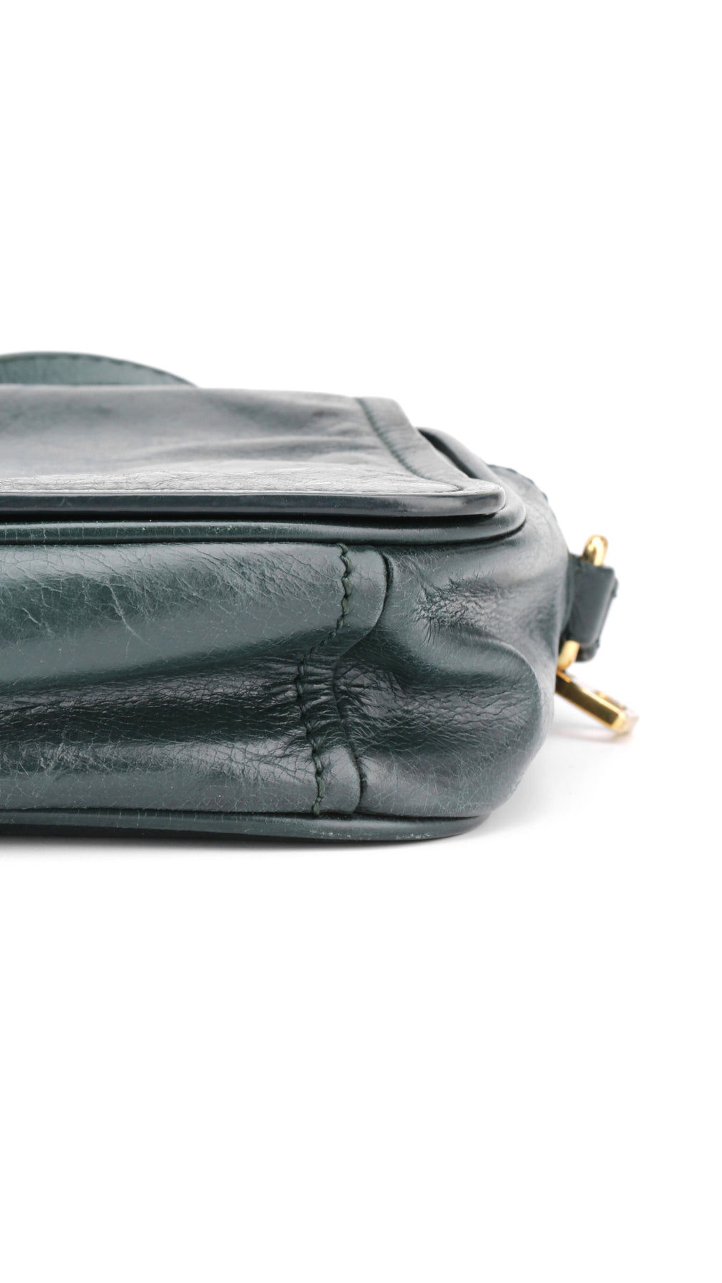Prada Logo Crossbody Bag er en elegant og allsidig veske som kombinerer avslappet luksus med praktisk funksjonalitet. Det myke, krakelerte skinnet har en dyp, mørkegrønn tone som gir vesken et sofistikert og unikt uttrykk, perfekt for både hverdagsbruk og kveldsanledninger.