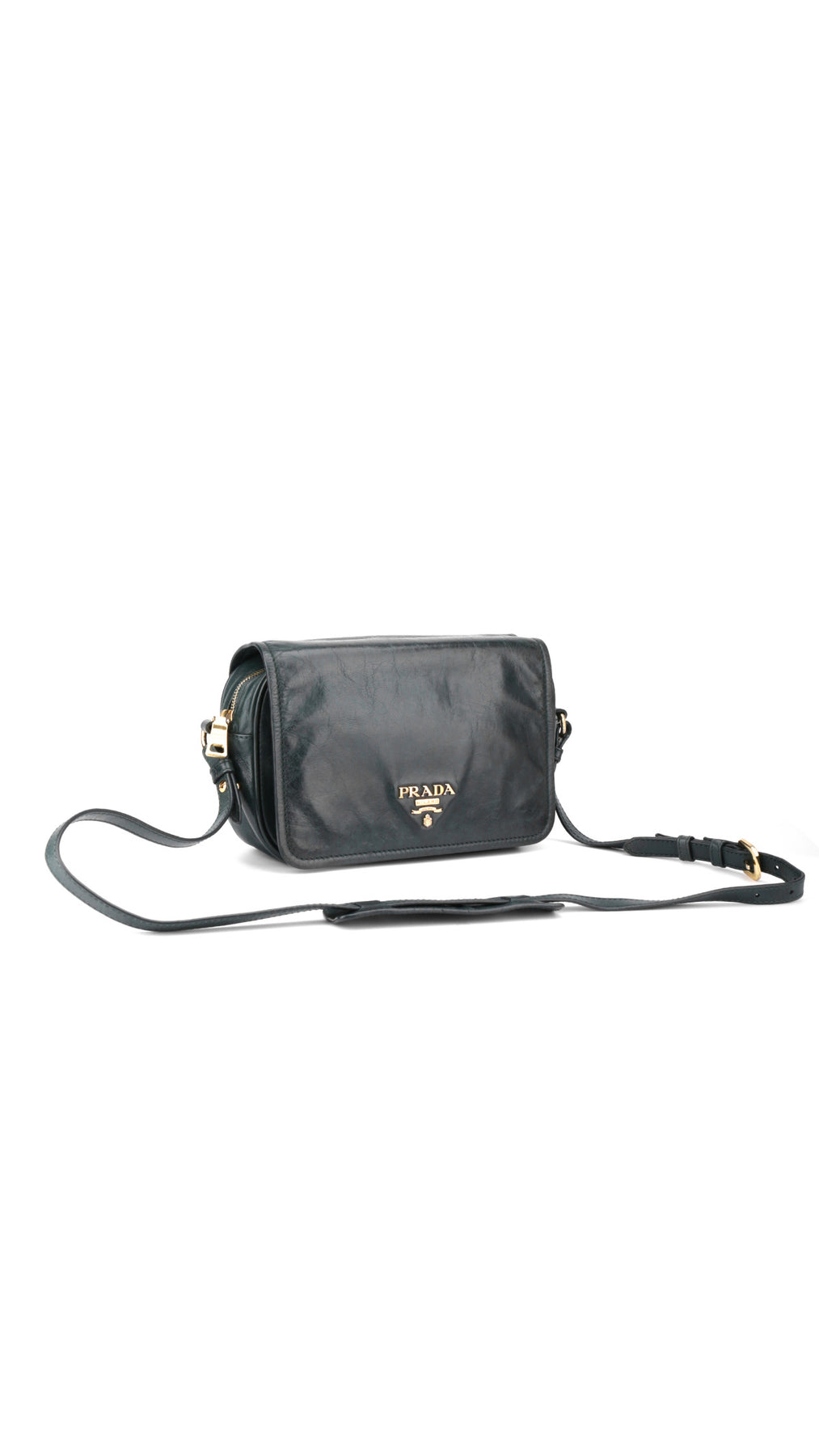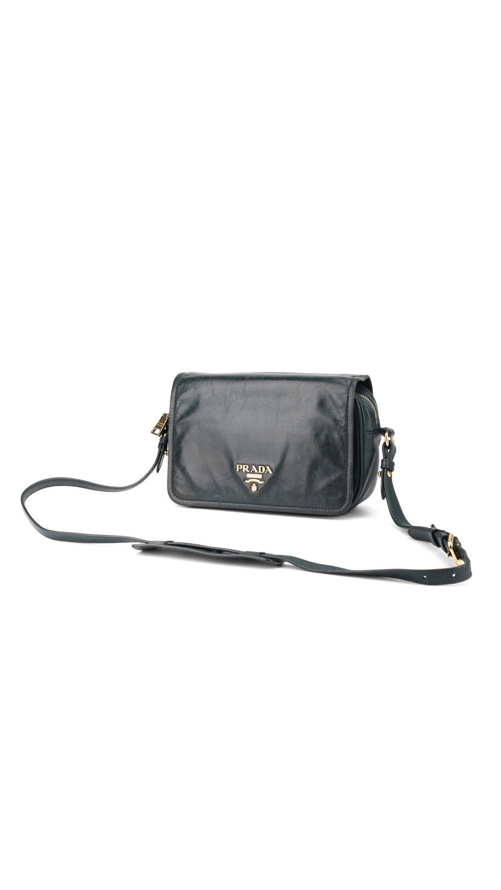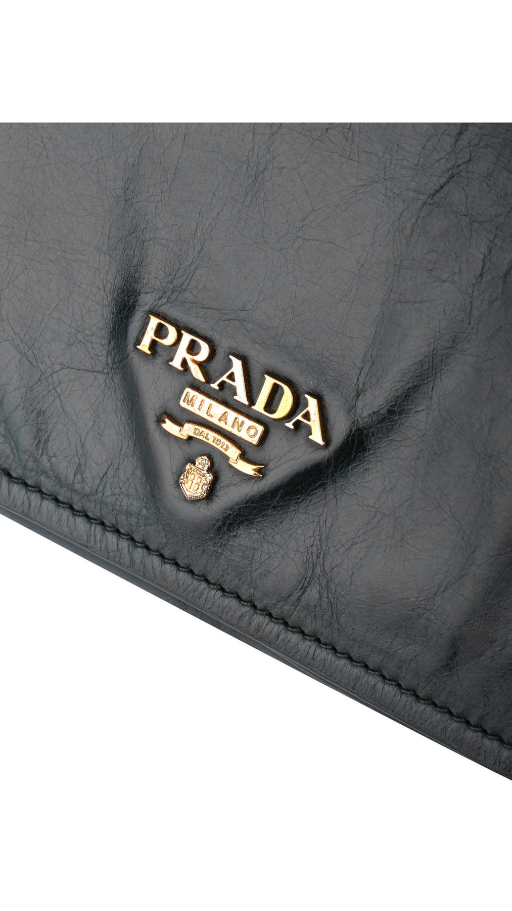Fronten er pyntet med den ikoniske Prada-logoen i gullfarget metall, som står i vakker kontrast til skinnets mørke nyanse. Vesken åpnes med magnetisk klaff og har et romslig hovedrom med flere innerlommer som gjør det enkelt å holde orden på nødvendigheter. Den justerbare skulderstroppen gir fleksibel bæring – enten på skulderen eller crossbody.