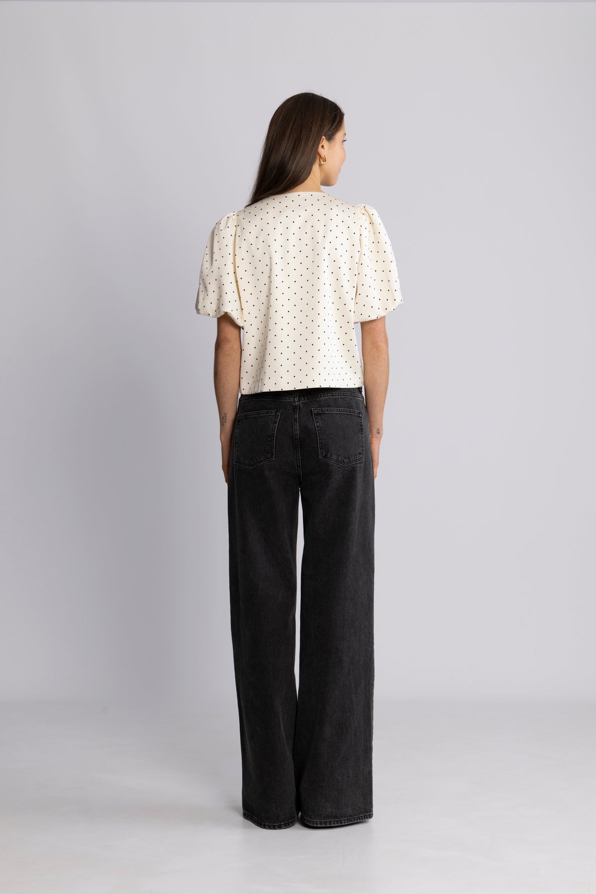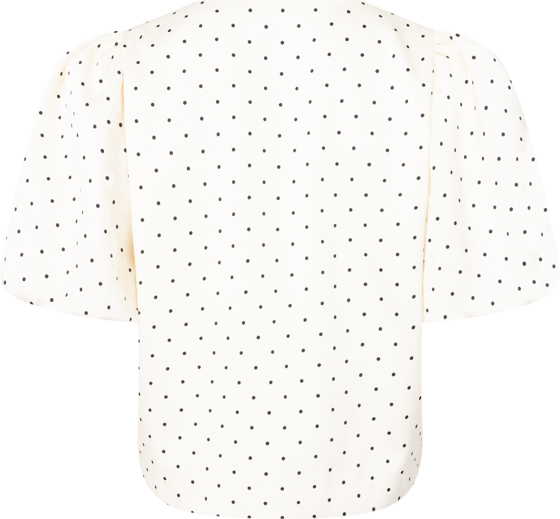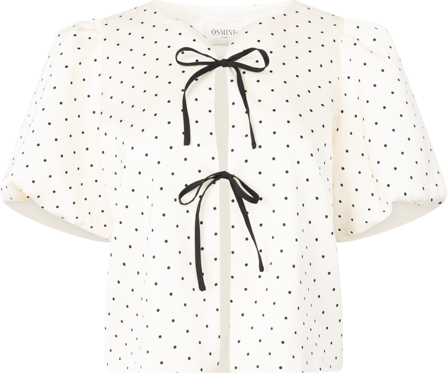 Rosie Polka Dot Blouse fra OSMINE af nor. Rosie Polka Dot Blouse fra OSMINE af nor er en feminin og leken bluse i kremhvit med små sorte prikker. Blusen har korte puffermer, avrundet hals og delikate bånd som knytes foran for en elegant kontrast. Den myke, strukturerte kvaliteten gir et flatterende fall og gjør blusen perfekt både til jeans og skjørt.