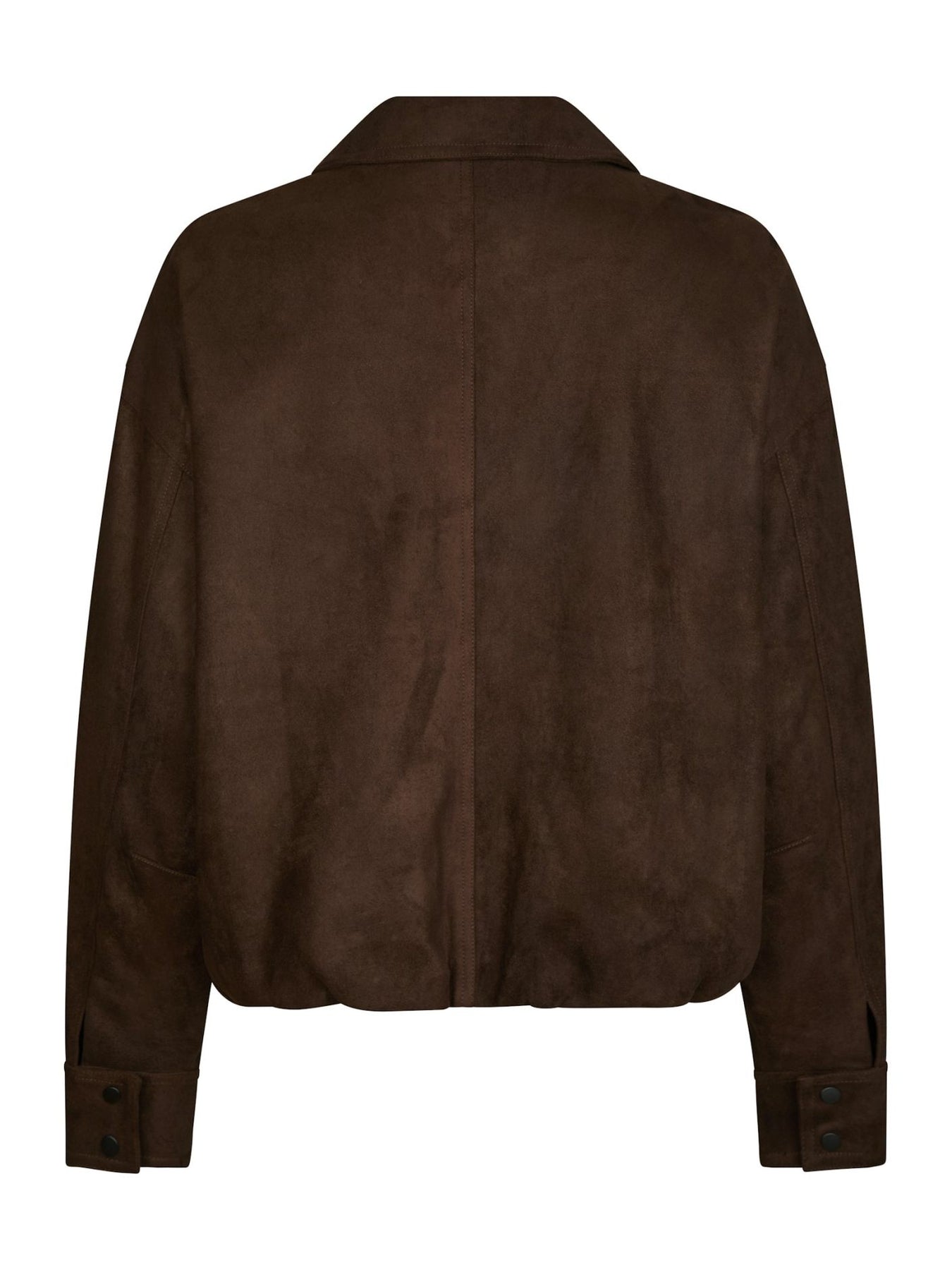 Rubby Faux Suede Jacket fra Neo Noir. Denne mørkebrune jakken fra Neo Noir er et tidløst tilskudd til høstgarderoben. Rubby Faux Suede Jacket er laget i myk, imitert semsket kvalitet med matt finish, og har en avslappet passform med droppede skuldre og elastisk fald som gir en rundet silhuett. Den skjulte kneppingen foran og de brede mansjettene gir et stilrent uttrykk, mens det myke materialet gir et eksklusivt preg til både hverdags- og kveldsantrekk.