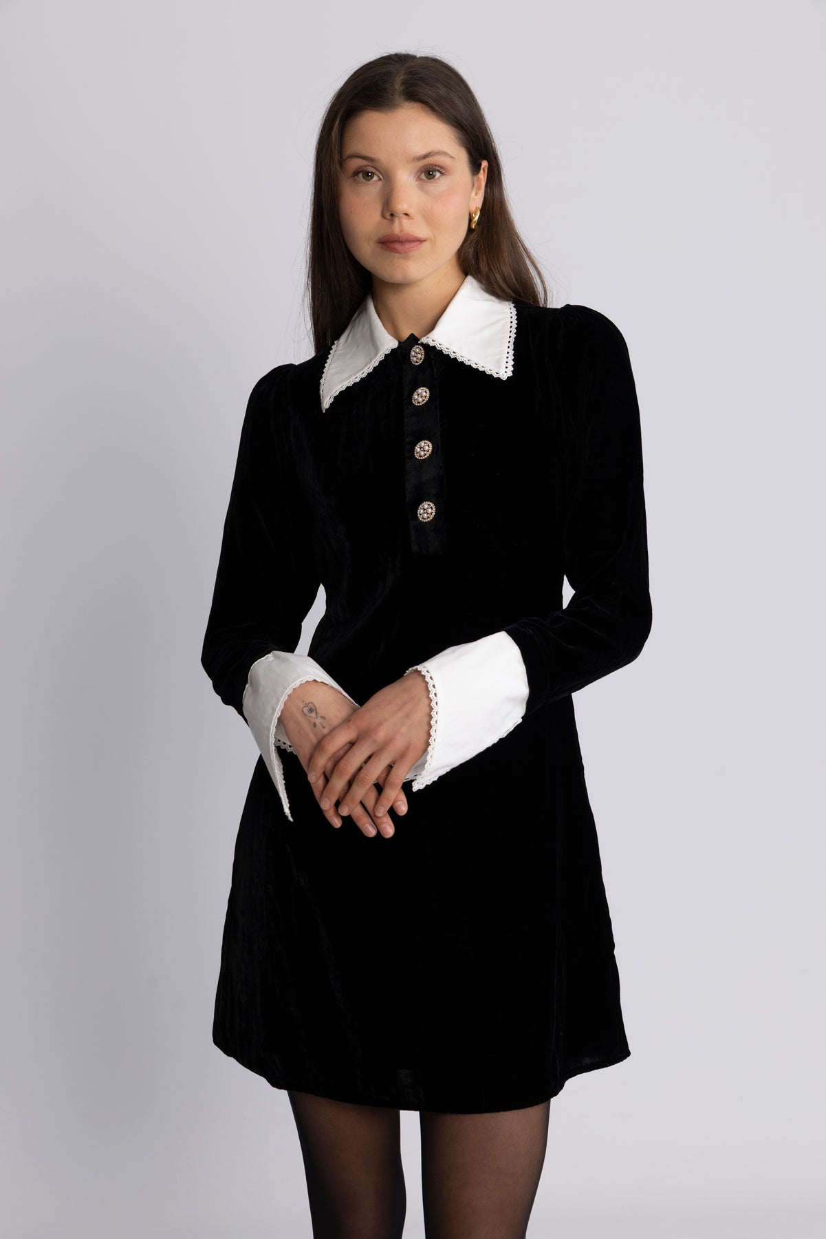 Runa Velvet Mini Dress fra OSMINE af nor. Runa Velvet Mini Dress er en elegant fløyelskjole i dyp sort med et klassisk uttrykk. Den har en tydelig A-fasong, lange ermer og kontrastdetaljer som gir et sofistikert preg. Den hvite kragen og mansjettene med blondekant rammer inn designet og fremhever de dekorative knappene foran.