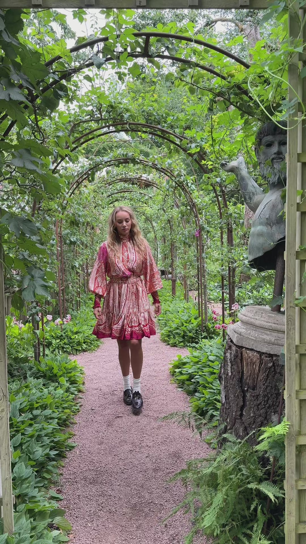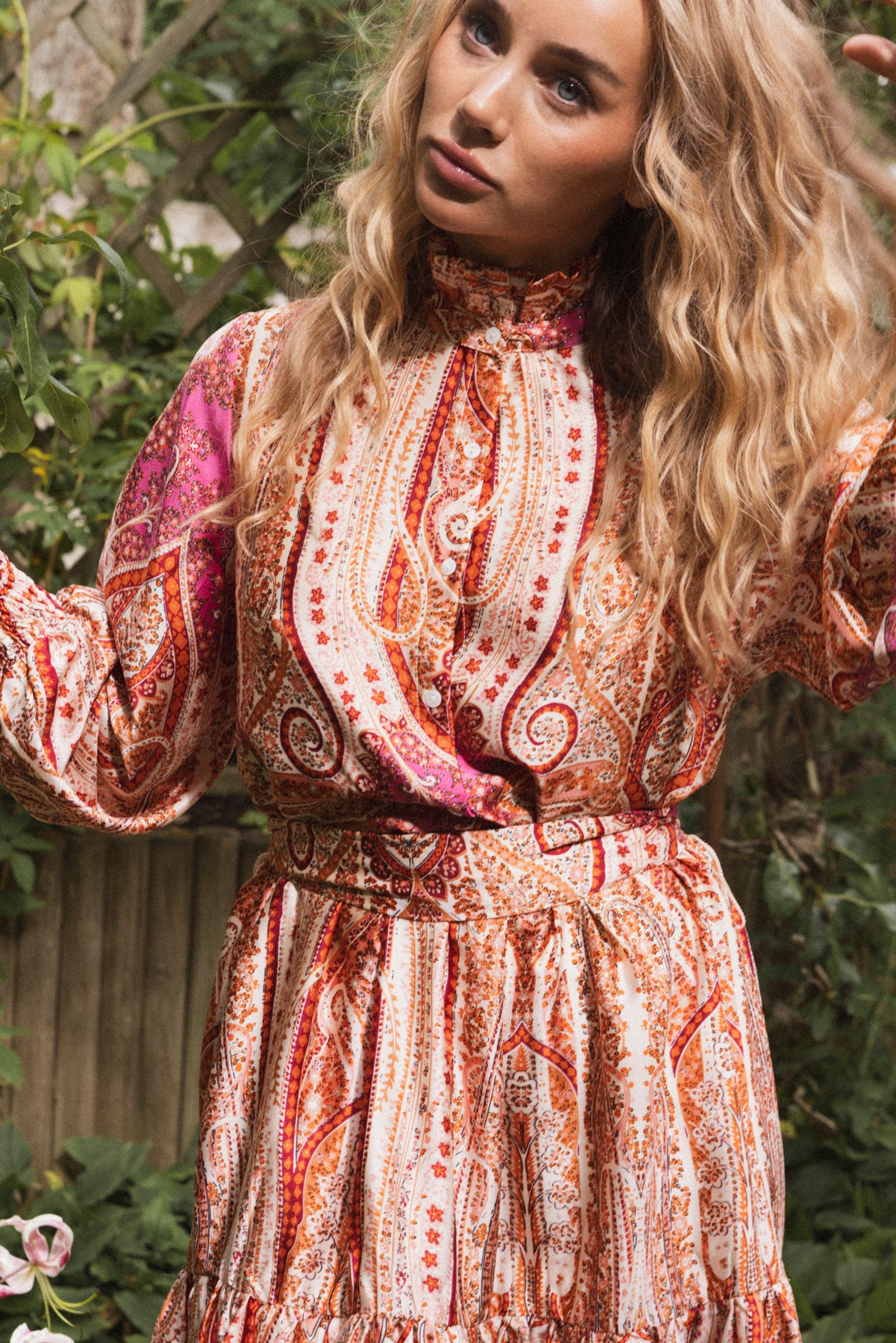 Saga Wide Border Paisley Dress fra OSMINE af nor. Vakker kjole fra norske OSMINE af nor med et vakkert paisleyprint. Kjolen er kuttet i en tung sateng med vakkert fall og et nydelig paisleyprint med detaljer i orange, rødt og burgunder. Saga Wide Border Paisley Dress har lange ermer med volum og høy, smocket, elastisk mansjett med en liten rysjekant. Kjolen har halvhøy hals med en feminin volangkant og knapper til midjen. Saga Wide Dress har også et langt, avtakbart knytebelte i den samme tunge, eksklusive satengen. Kjolen har snittlinje i midjen som gir en feminin og flatterende silhuett - hvis du bruker kjolen uten beltet har den en fin A-fasong.