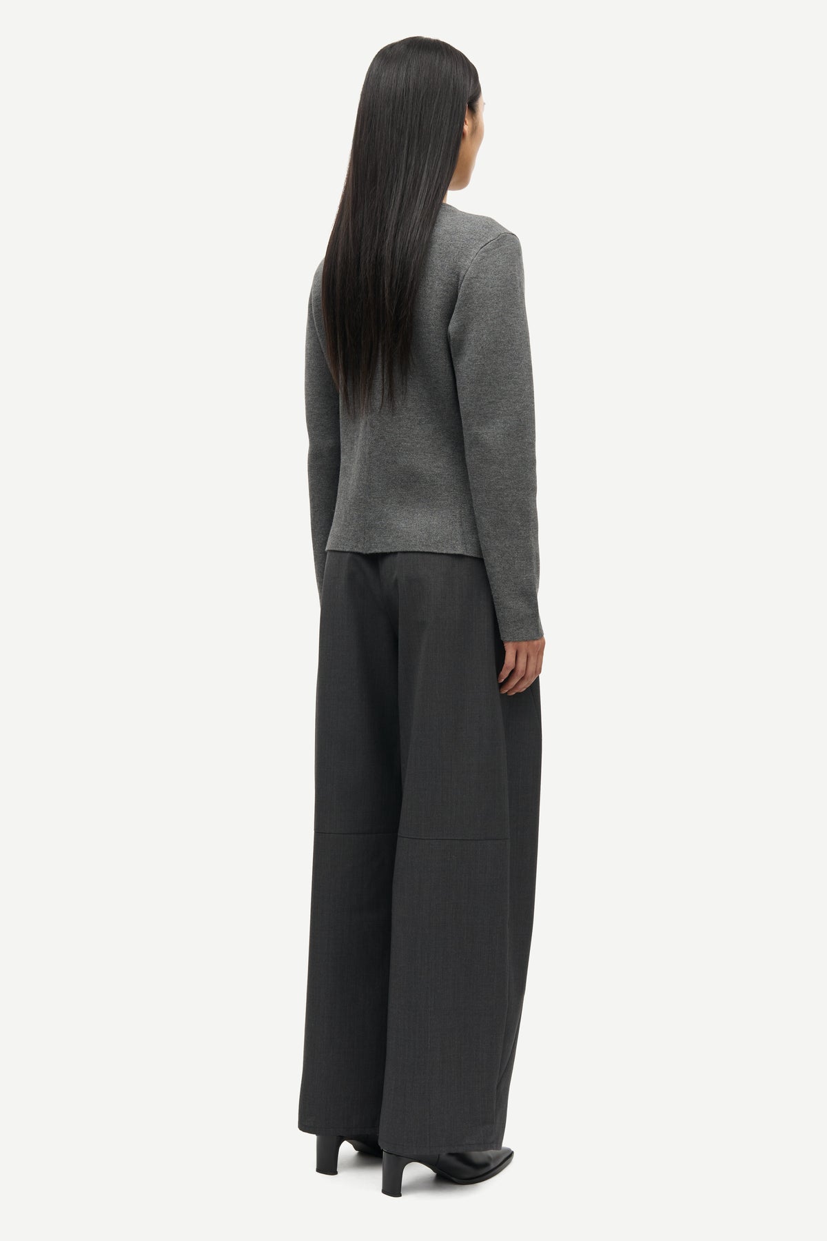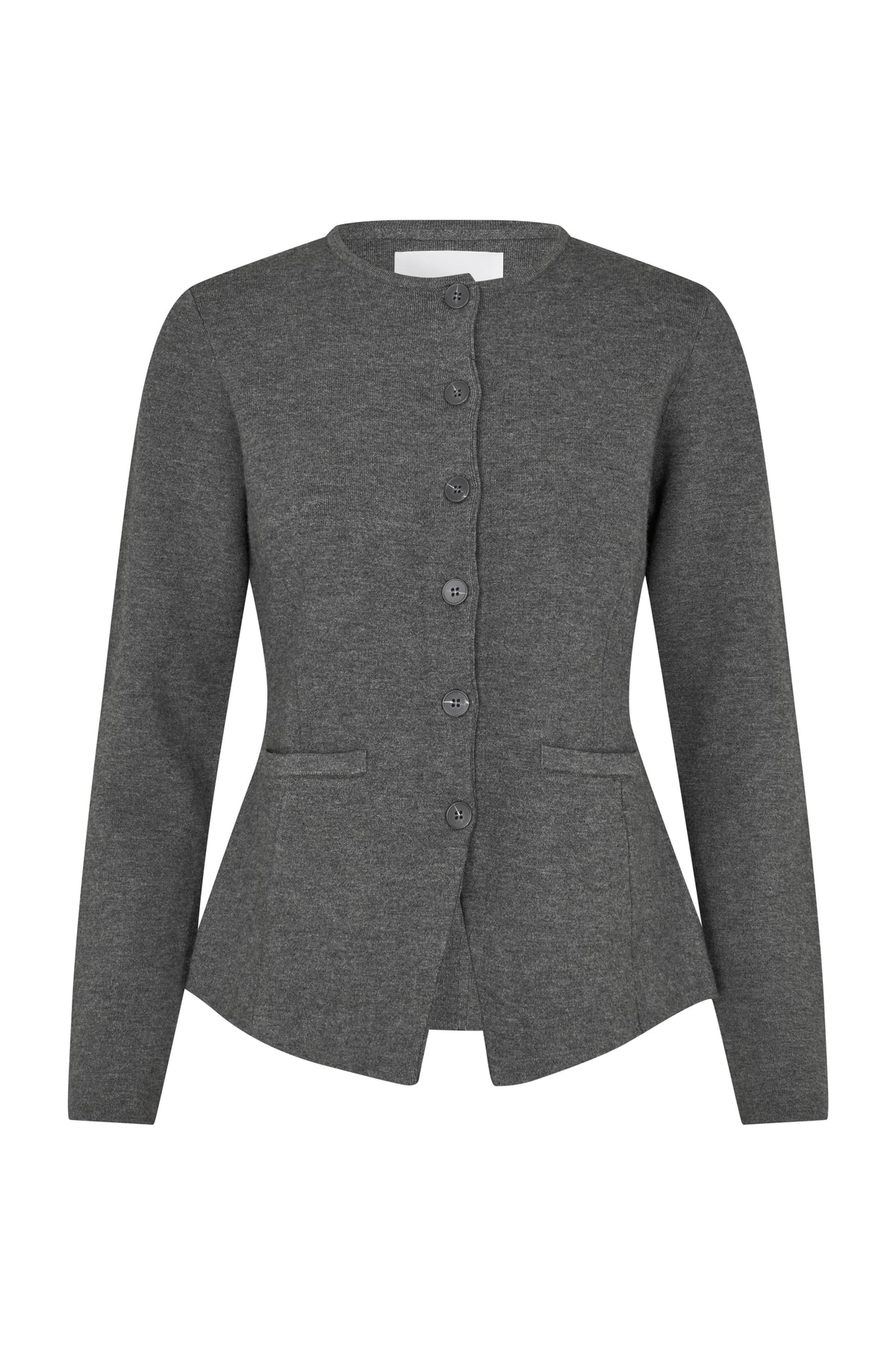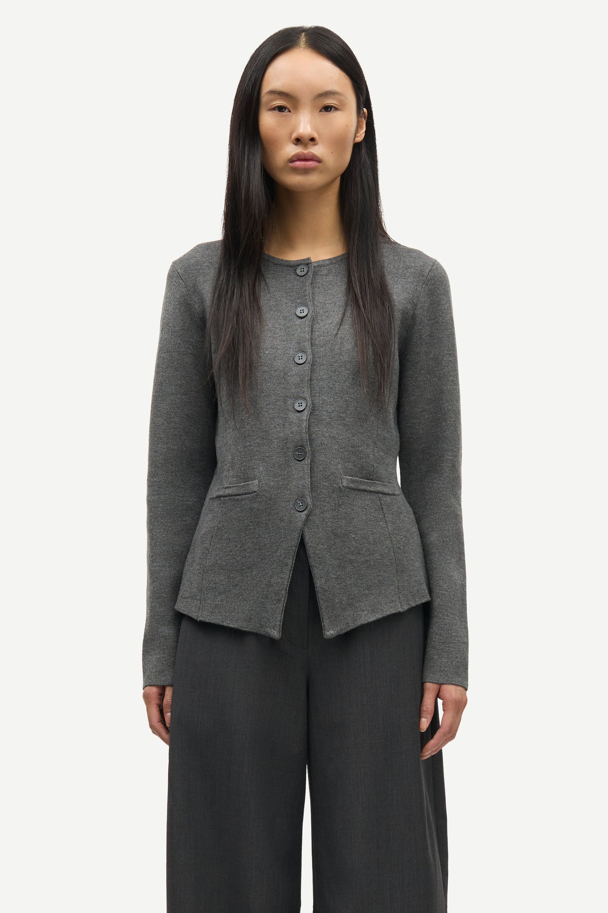 Salula Jacket fra Samsøe Samsøe. Salula Jacket er en elegant, strukturert jakke i klassisk gråmelert. Modellen har rund hals, knapper i front og en lett innsvinget fasong som fremhever midjen. De rene linjene og minimalistiske detaljene gir et moderne og sofistikert uttrykk – perfekt både til jobb og mer avslappede anledninger.