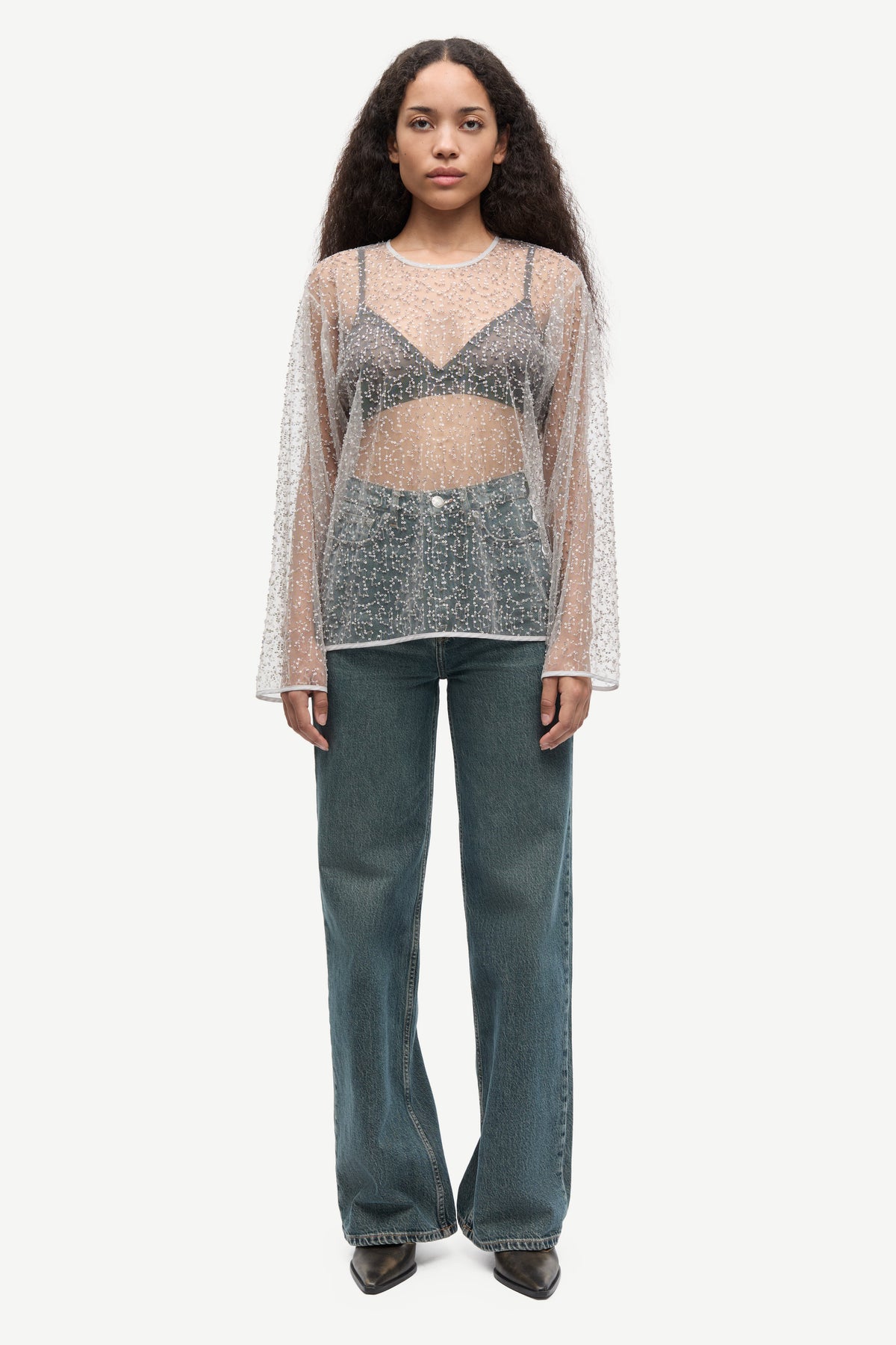 Samally Blouse fra Samsøe Samsøe. En drømmende og feminin bluse i transparent mesh med håndsydde paljetter som fanger lyset vakkert. Samally Blouse har en løs passform med lange ermer og knapp i nakken for en diskret avslutning. Perfekt over en enkel topp eller bralette for en glamorøs look som passer både til fest og kveldsantrekk.