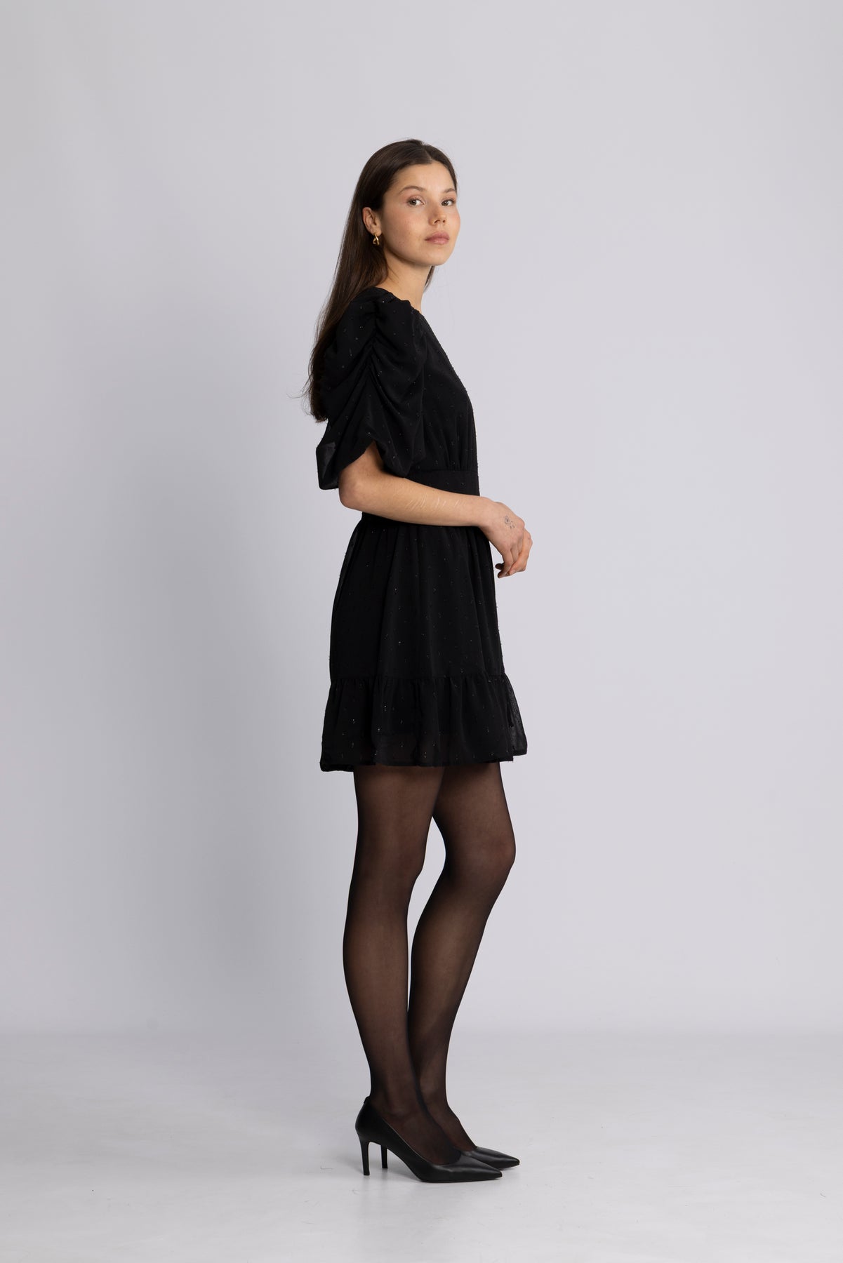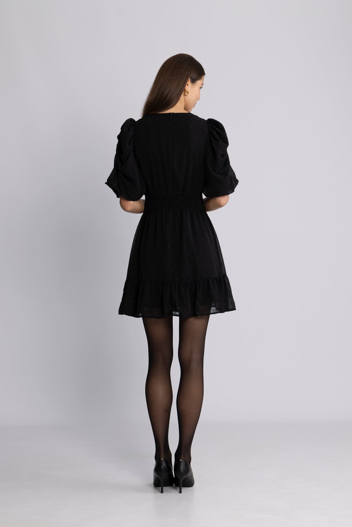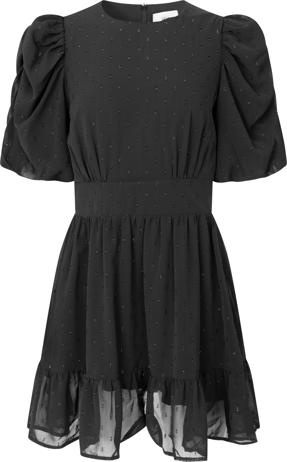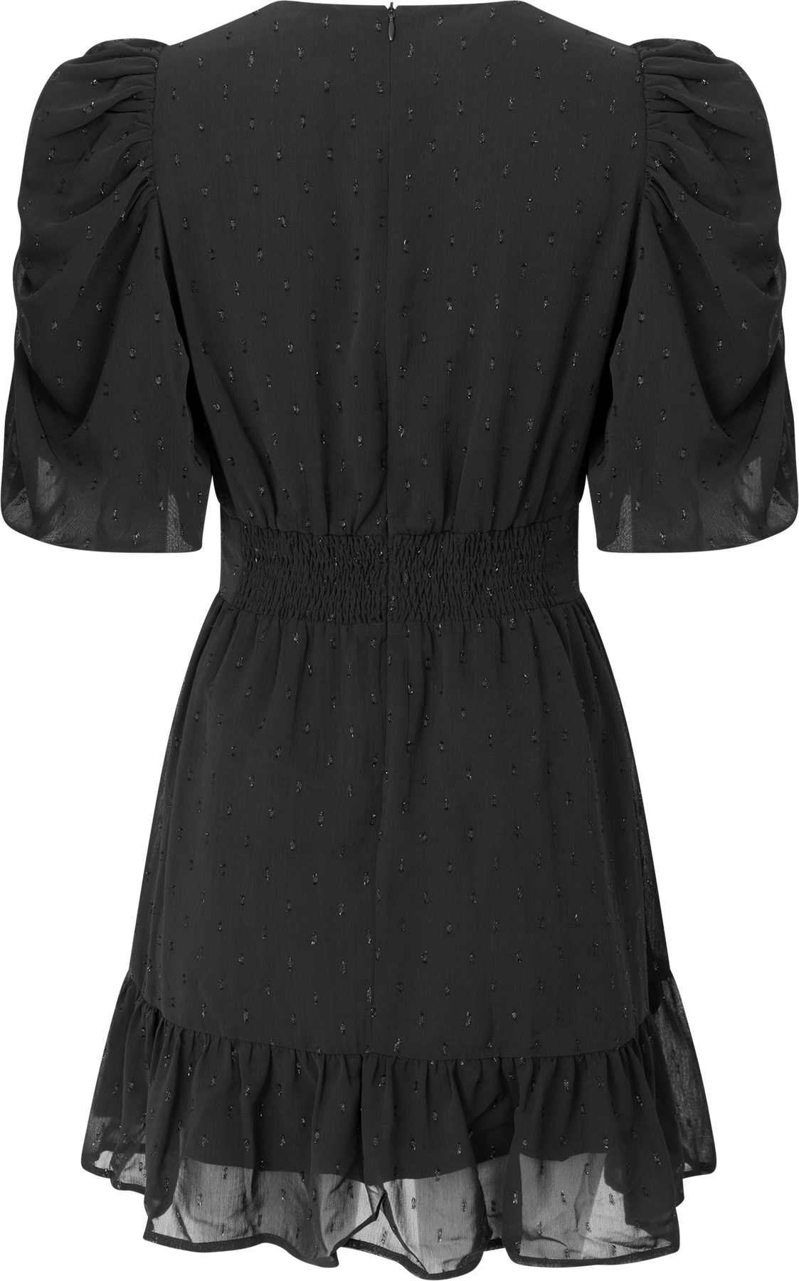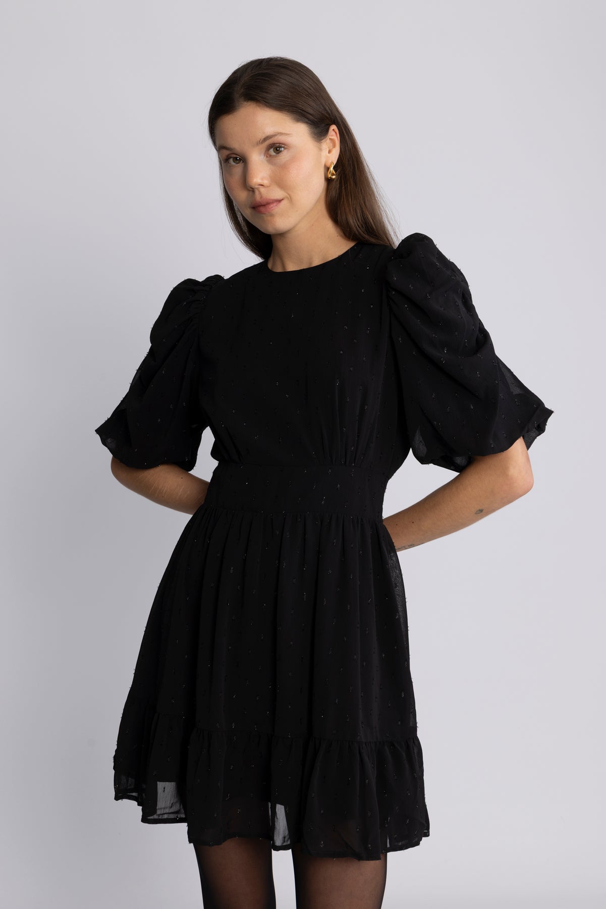 Santi Mini Dress Black Silver fra OSMINE af nor. Denne festkjolen har en flatterende og feminin silhuett med korte, voluminøse puffermer og en markert midje med smock-søm som sikrer en komfortabel passform. Det delikate, svarte stoffet er dekket av små sølvfargede prikker som gir en subtil og elegant glitrende effekt.