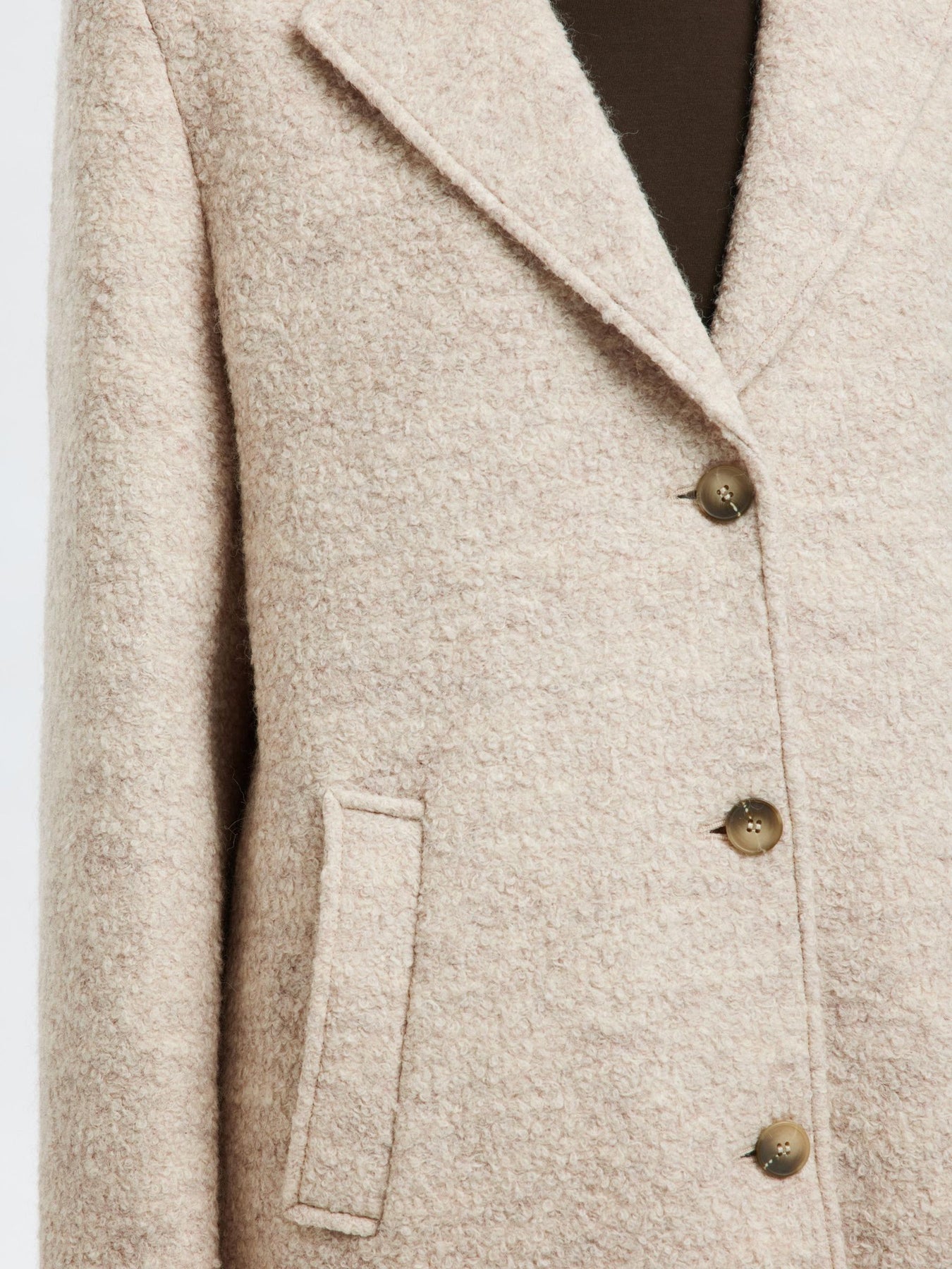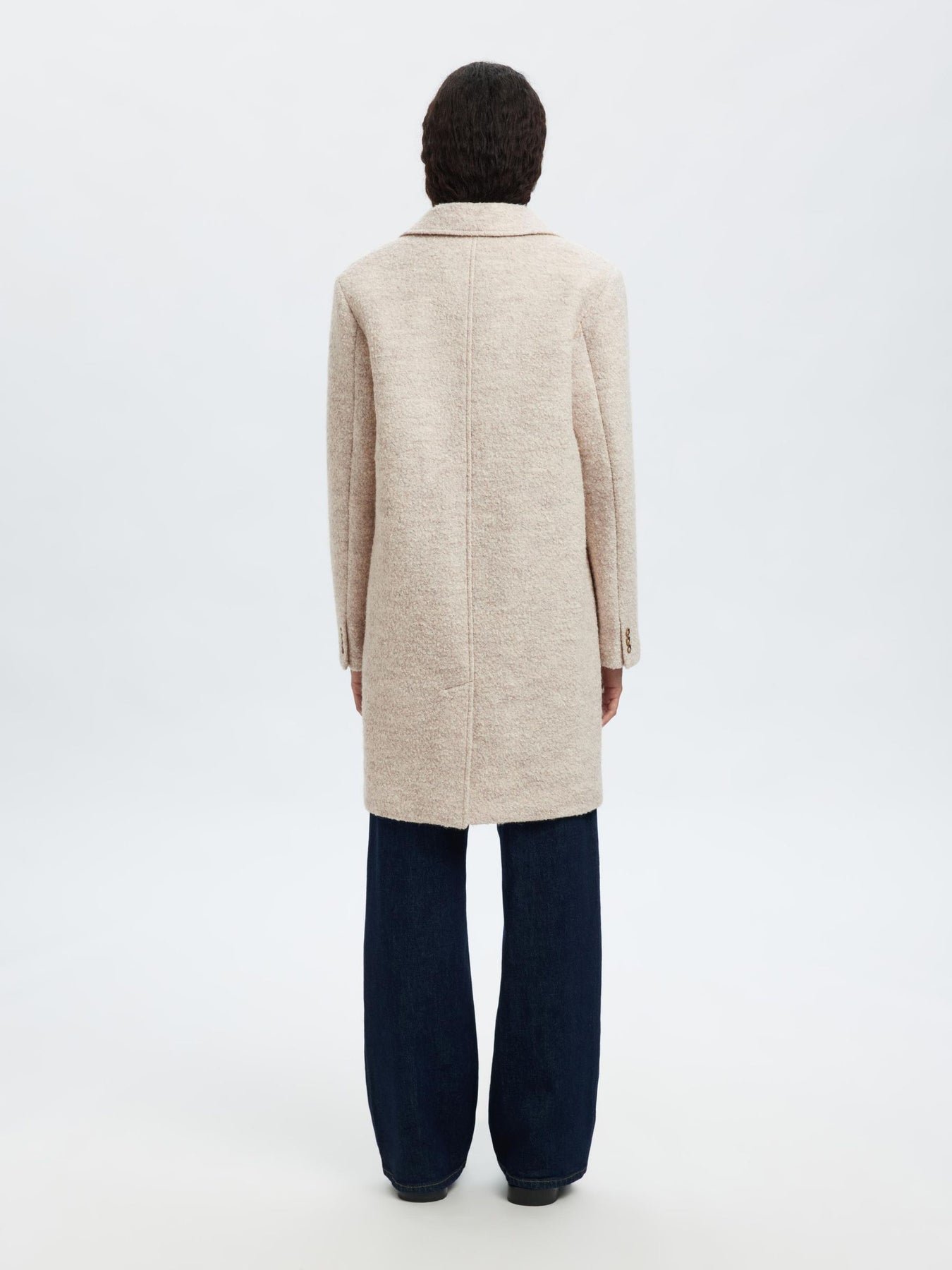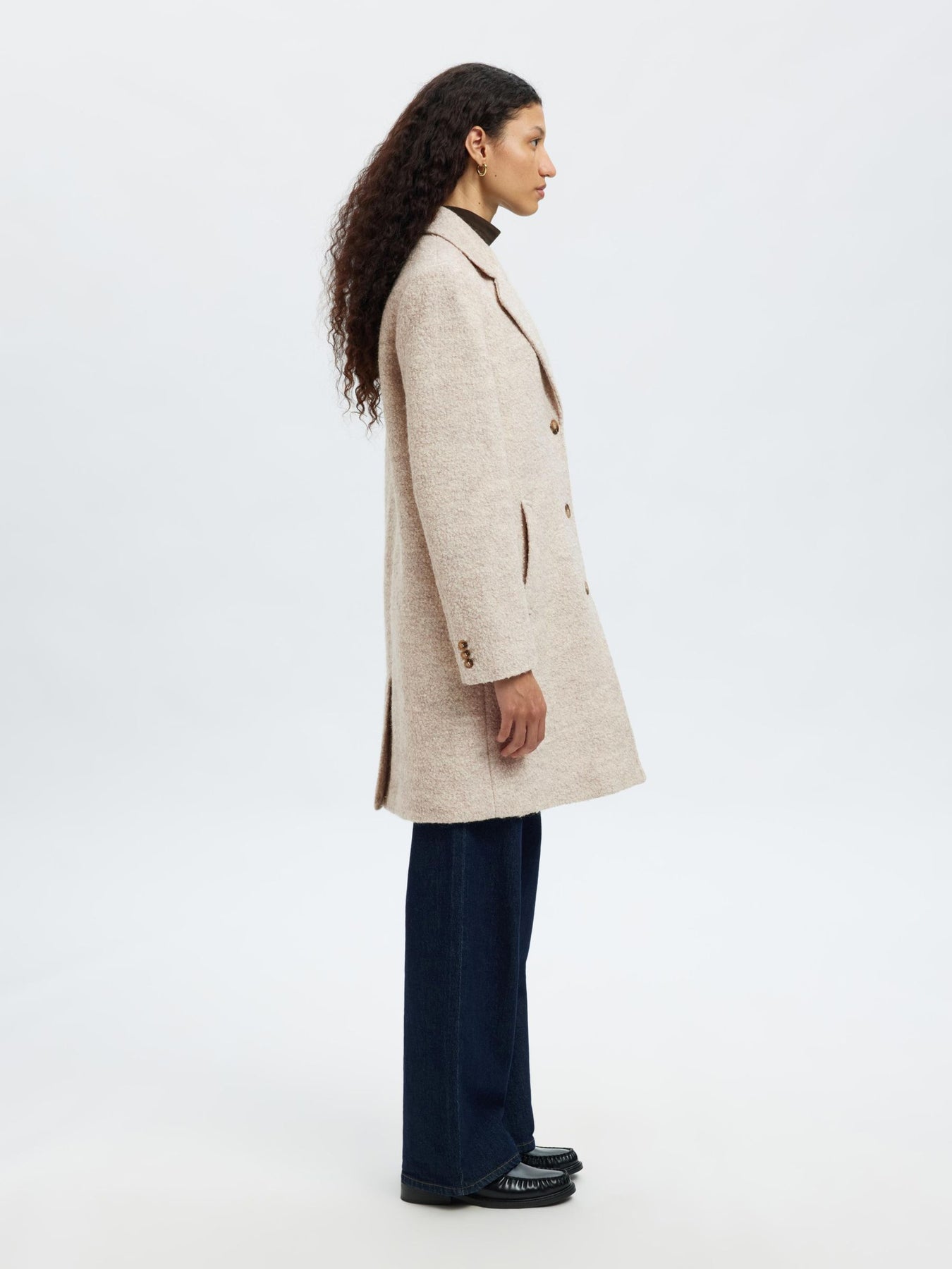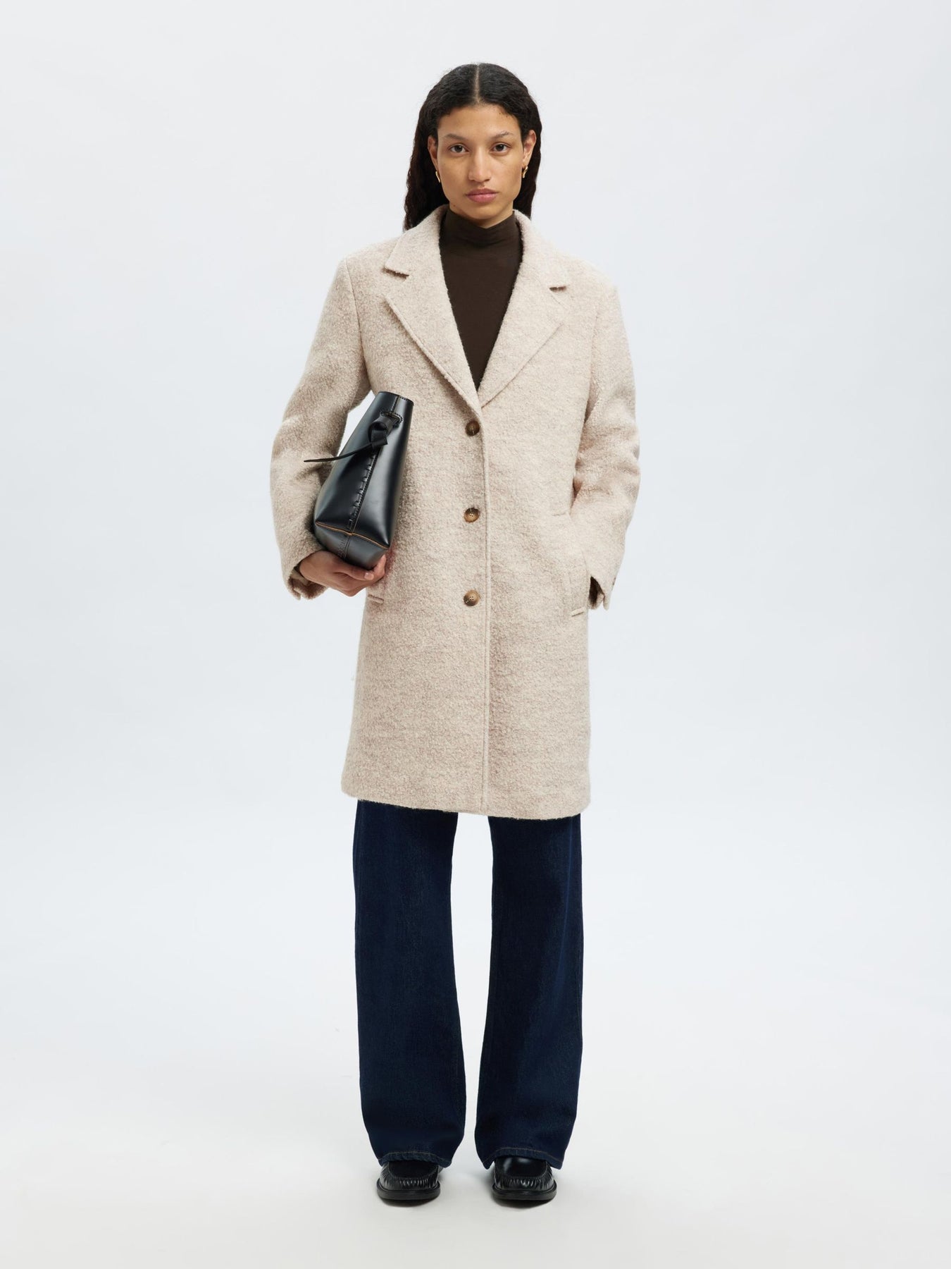 Sasja Boucle Wool Blend Coat fra Selected Femme. Sasja Boucle Wool Blend Coat fra Selected Femme er en tidløs ullkåpe med en elegant, rett silhuett. Den er laget i en myk ullblanding med teksturert boucléfinish som gir et luksuriøst uttrykk. Kåpen har klassisk krage, knappelukking foran og praktiske sidelommer – et perfekt valg for en sofistikert hverdagslook.