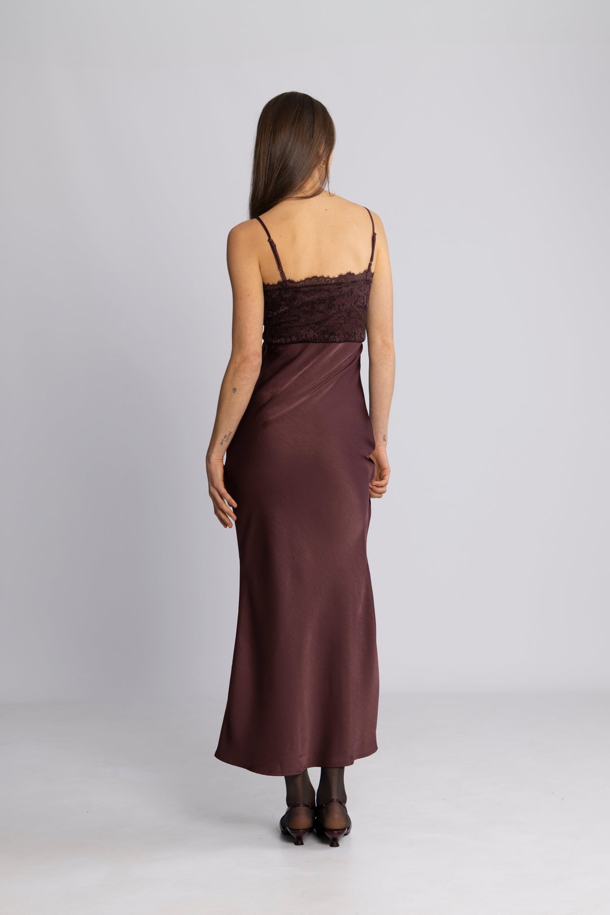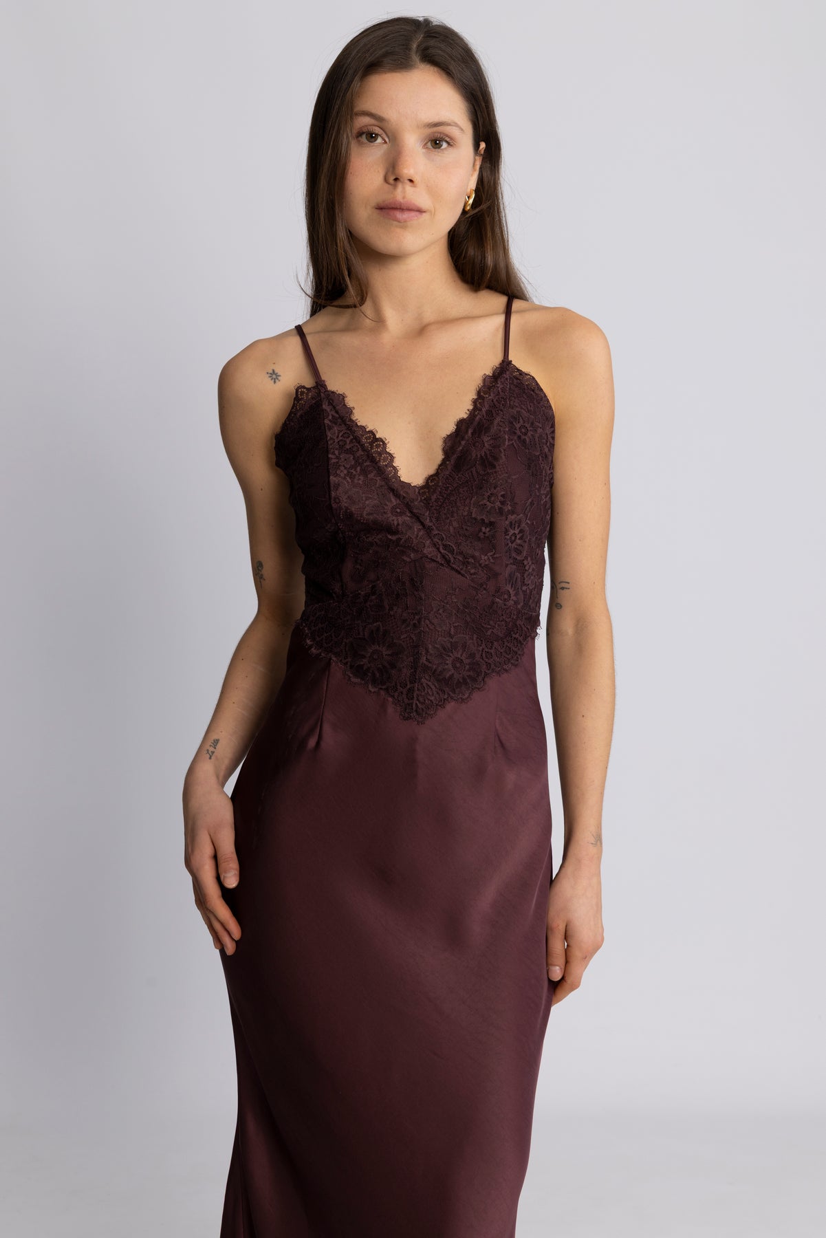 Signi Slip Dress fra OSMINE af nor. Signi Slip Dress er en elegant fotsid kjole i en dyp vinrød nyanse. Den er laget i elegant sateng med delikate blondedetaljer over bysten og smale stropper som gir et feminint og sofistikert uttrykk. Den enkle silhuetten faller vakkert langs kroppen og gjør kjolen perfekt til festlige kvelder og spesielle anledninger.