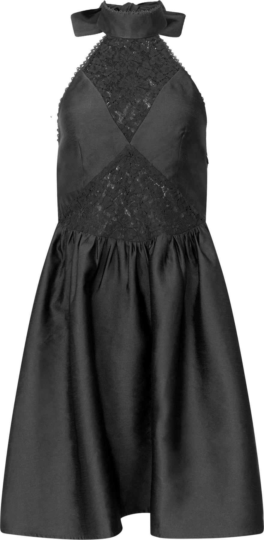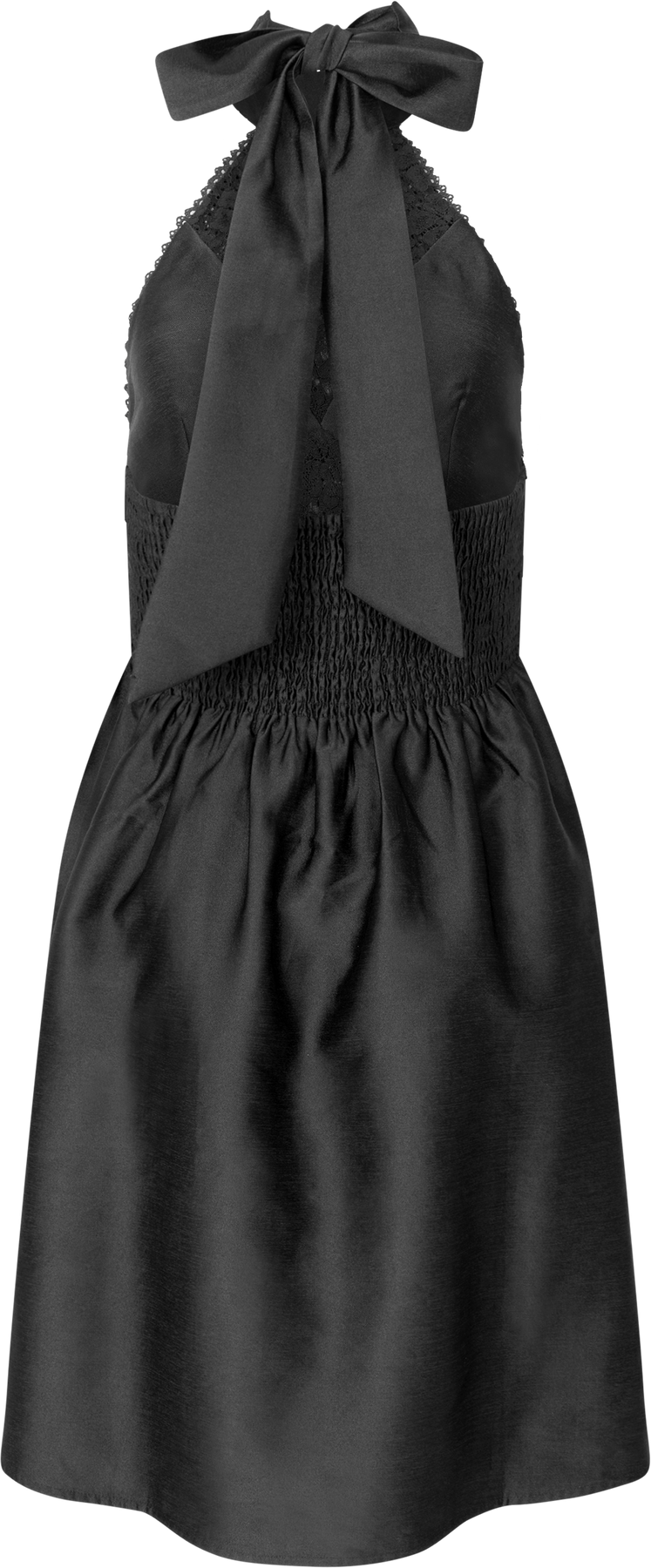 Swan Halter Mini Dress er en fantastisk, liten sort kjole fra OSMINE af nor. Kjolen har en flatterende halterneck-utringning som knytes til en elegant sløyfe i nakken, og har en åpen rygg som gir et sofistikert preg. Overdelen er vakkert designet med delikate blondepaneler, mens smock-elastikken i ryggen sikrer en perfekt og komfortabel passform.