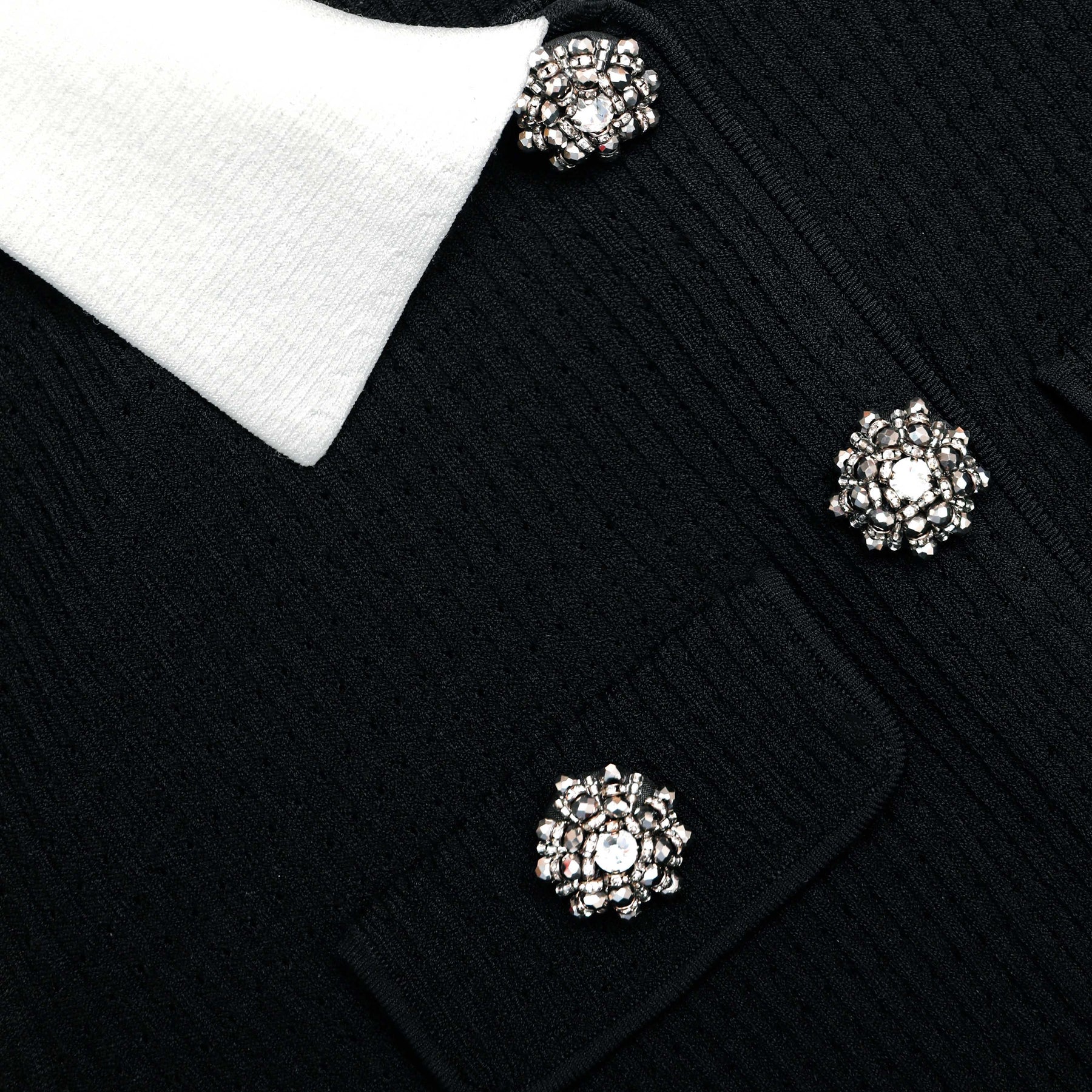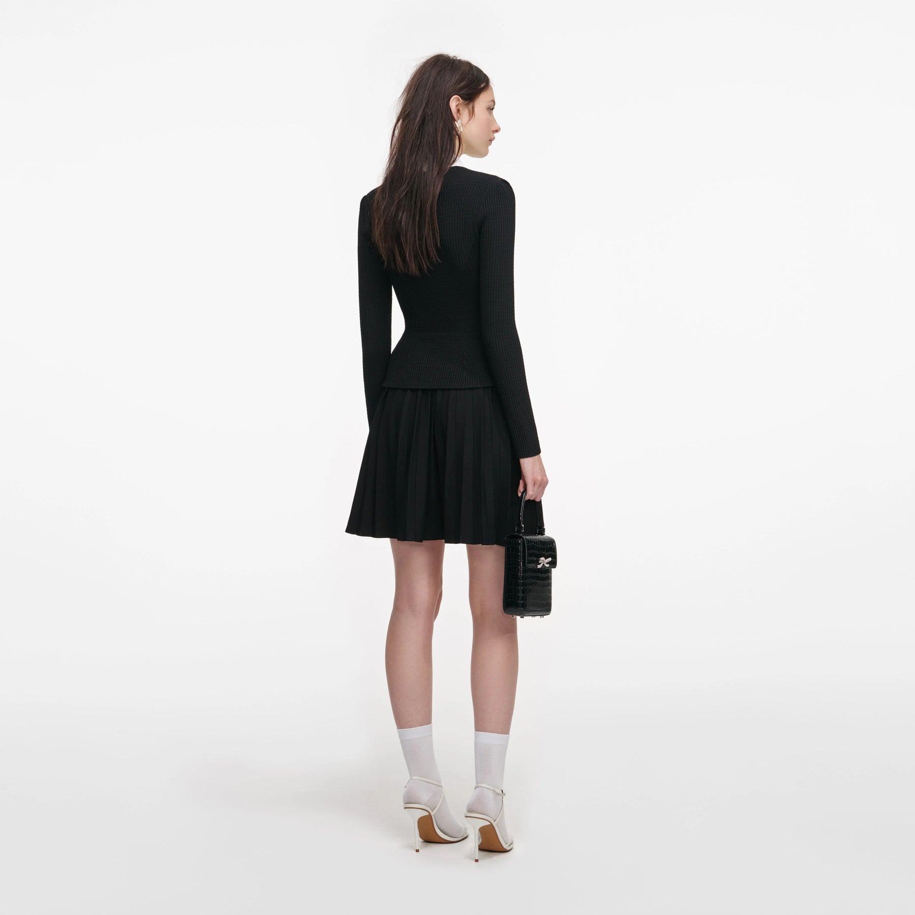 Tailored Knit Mini Dress fra Self-Portrait. Elegant minikjole fra Self-Portrait. Denne modellen er designet med en strukturert, kroppsnær overdel som fremheves av en skarp kontrastkrage og glitrende krystallknapper som gir et polert uttrykk. De fire frontlommene understreker den klassiske fasongen, mens skjørtet er plissert og faller i et kort, A-formet snitt som tilfører lett volum og en balansert silhuett.