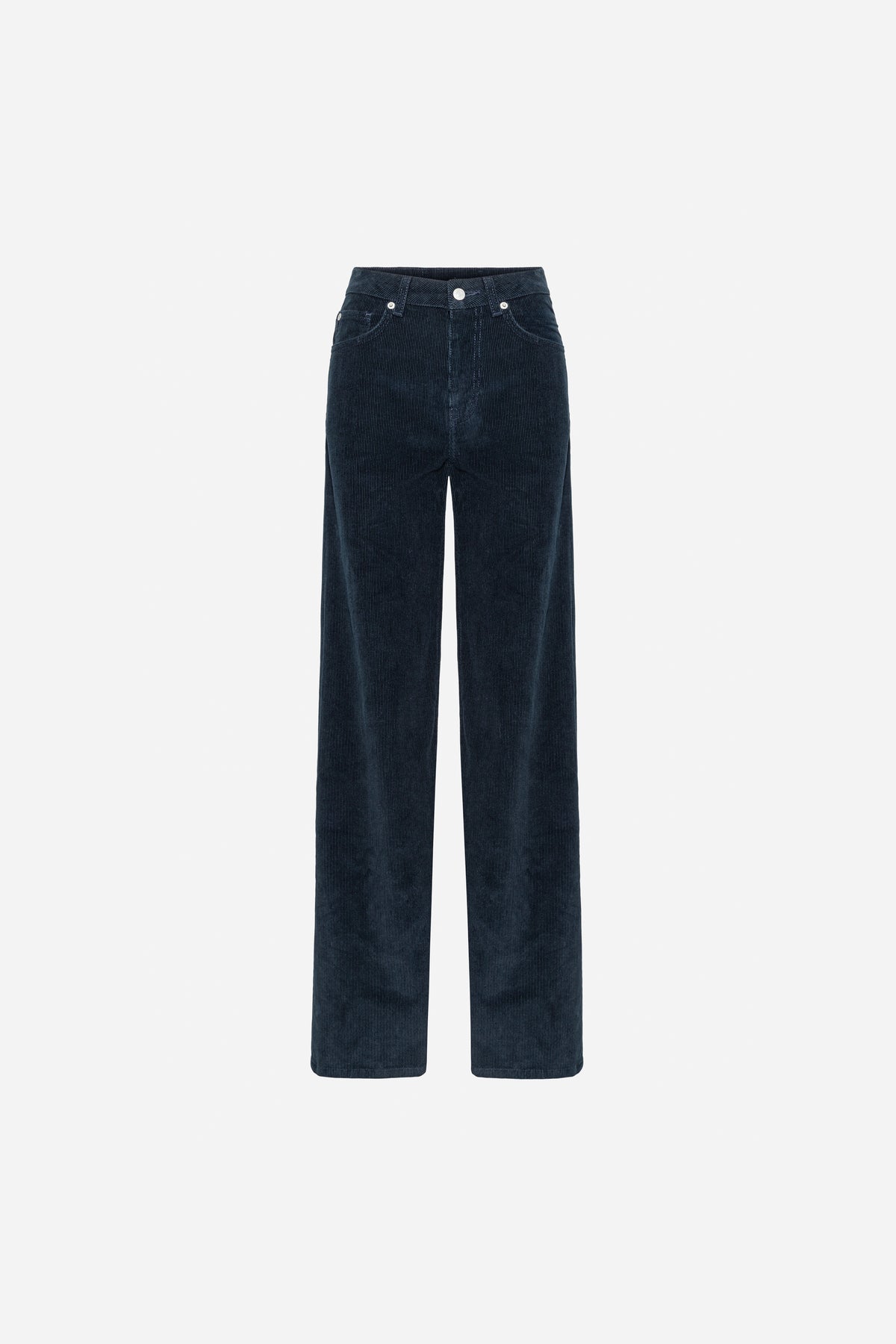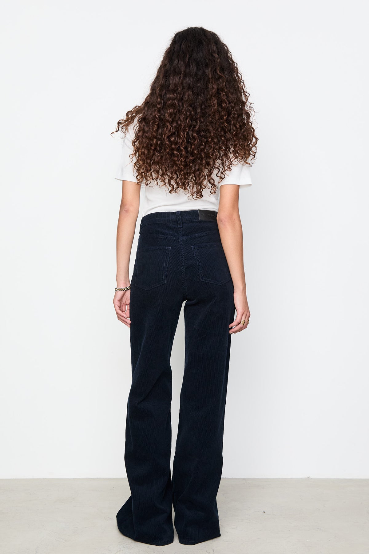 Taylor Cord fra Camilla Pihl. Bestselgeren Taylor fra Camilla Pihl i mørk blå cord - det perfekte alternativet til jeans denne høsten. En mørkeblå cordfløyelsbukse med høy midje og rette, vide ben som gir en flatterende og sofistikert silhuett. Den klassiske 5-lommersmodellen kombinerer en tidløs følelse med moderne passform. Cordfløyelen tilfører tekstur og dybde til antrekket, samtidig som den gir et mykt og behagelig uttrykk.