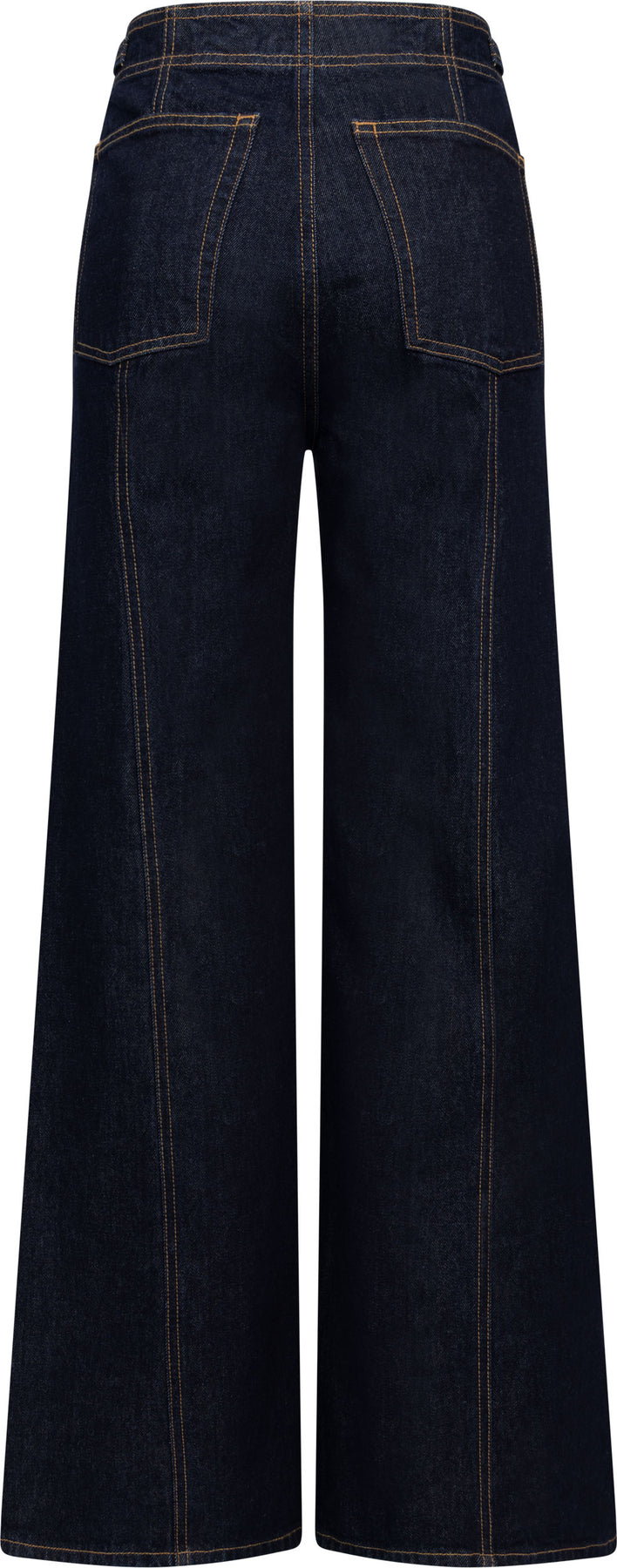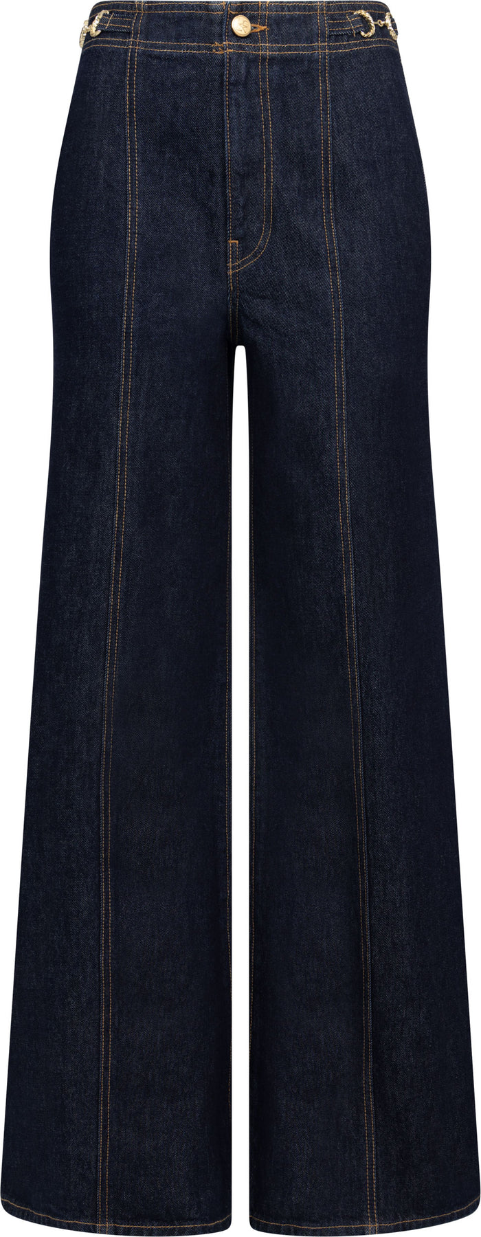 The Delphine High Rise Jean fra Ulla Johnson. Denne jeansen kombinerer klassisk denim med vintage-inspirert silhuett. Delphine har høy midje og ekstra vide ben med markerte pressefolder som gir en skreddersydd look. Jeansen har konstrastsømmer og dekorative metallringer i livet, som gir buksene et elegant og edgy uttrykk.