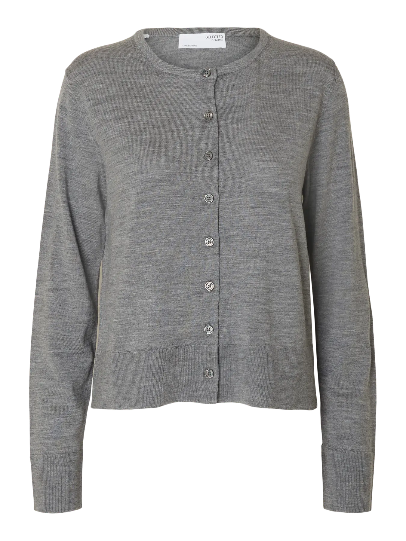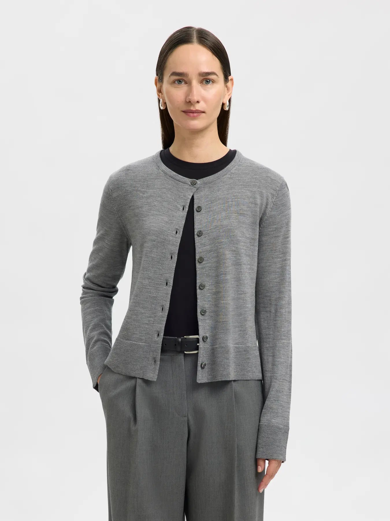 Thea Ls Knit Merino Cardigan fra Selected Femme. En klassisk og luksuriøs cardigan i 100 % merinoull – perfekt for lag-på-lag-styling året rundt. Thea Ls Knit Merino Cardigan fra Selected Femme har rund hals, smale ermer og en rett, litt kortere silhuett som gjør den like fin åpen som lukket. De diskré knappene og det finstrikkede uttrykket gir et stilrent preg, mens den myke merinoullen sørger for komfort.