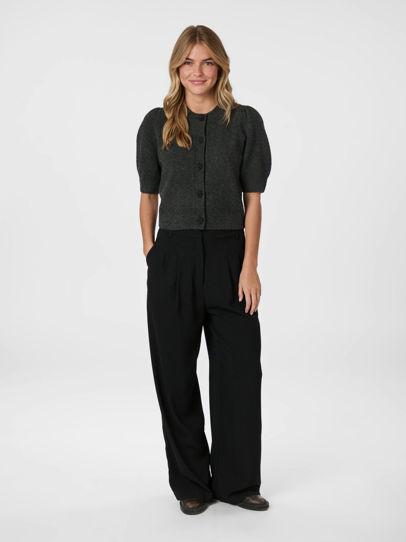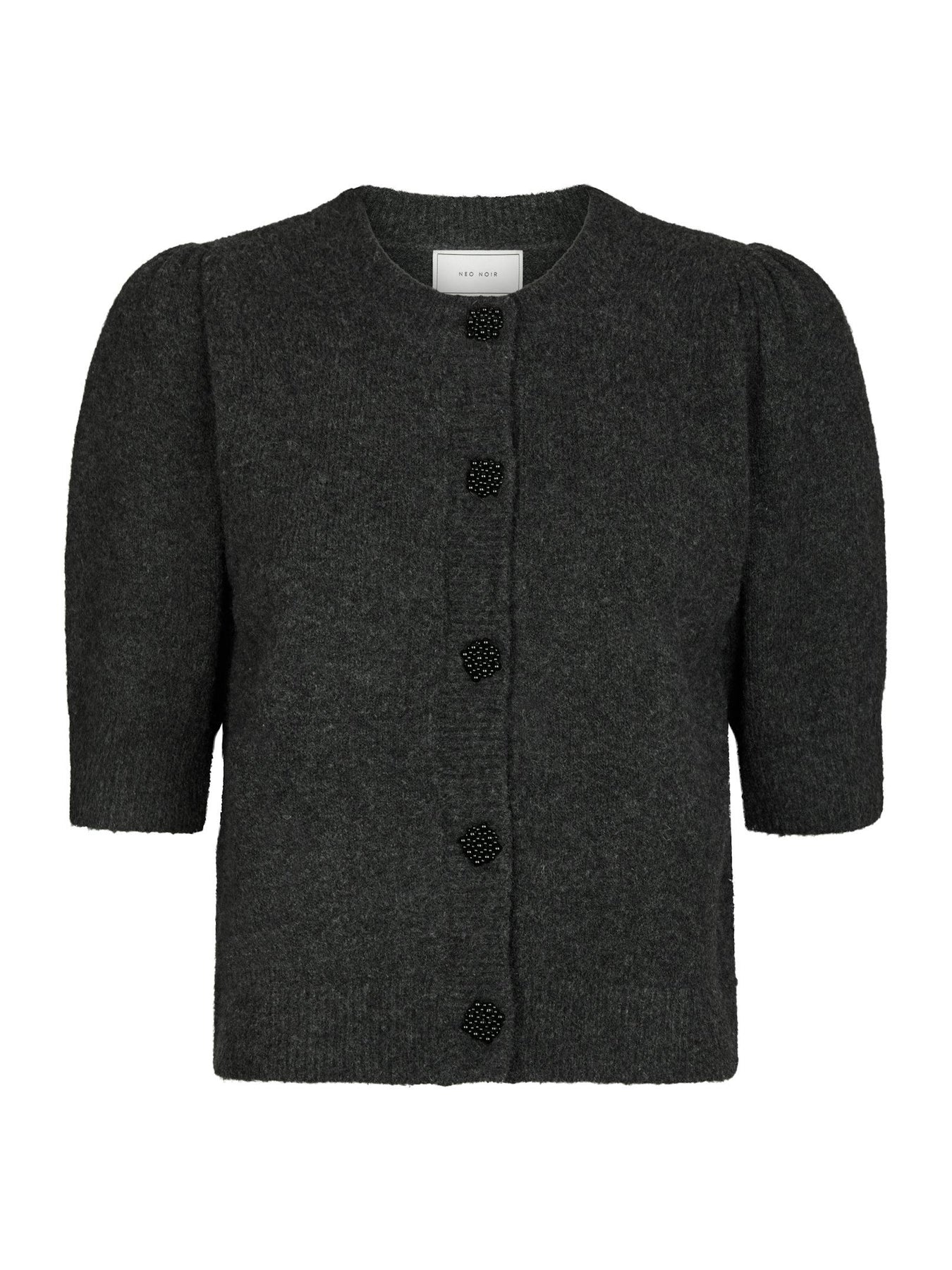 Trudy Deco Knit Cardigan fra Neo Noir. Søt, feminin cardigan fra Neo Noir med dekorative knapper. Trudy Deco Knit Cardigan har korte puffermer med ribbet mansjett. Cardiganen har rund hals, knappelukking og innsvingt og feminin passform.