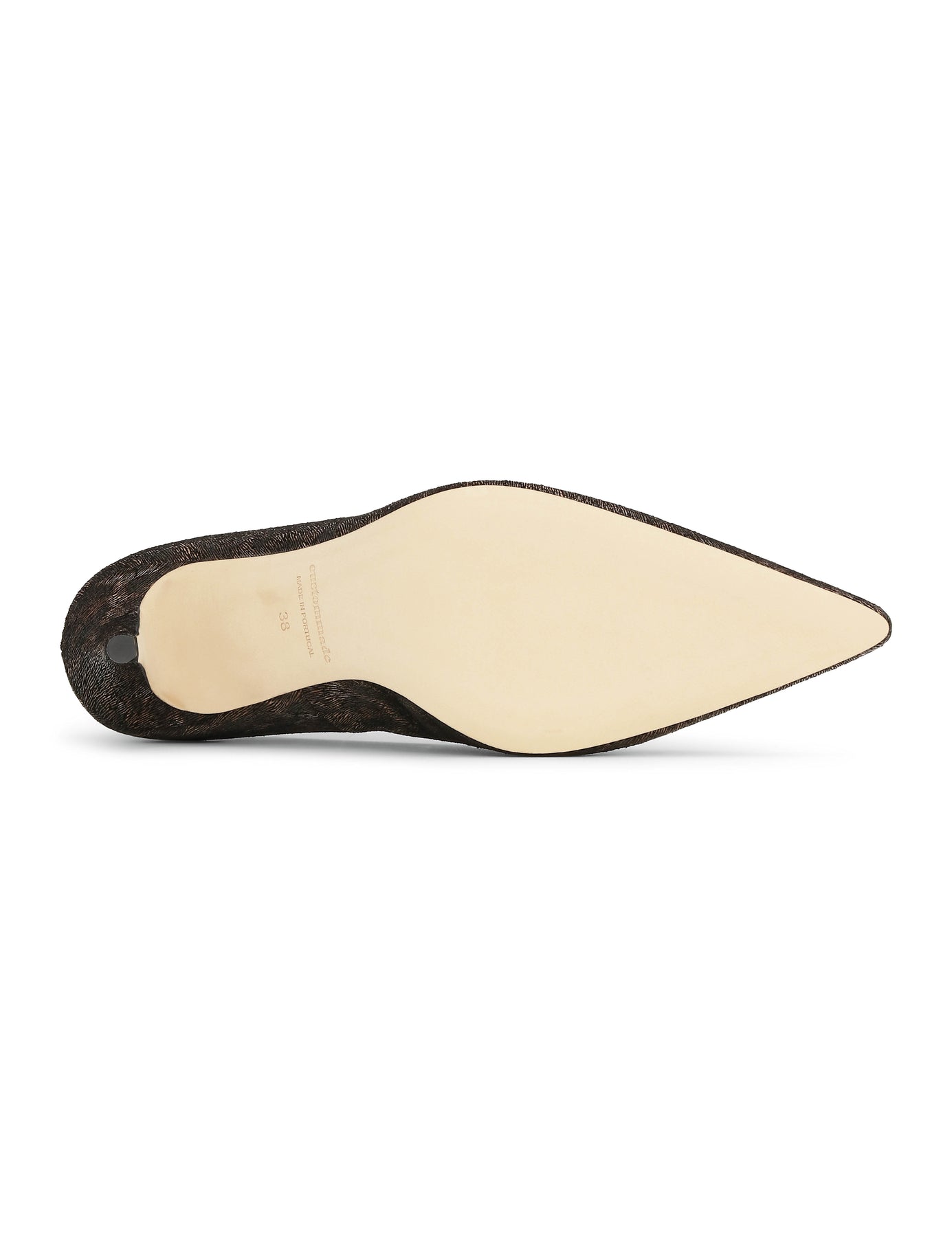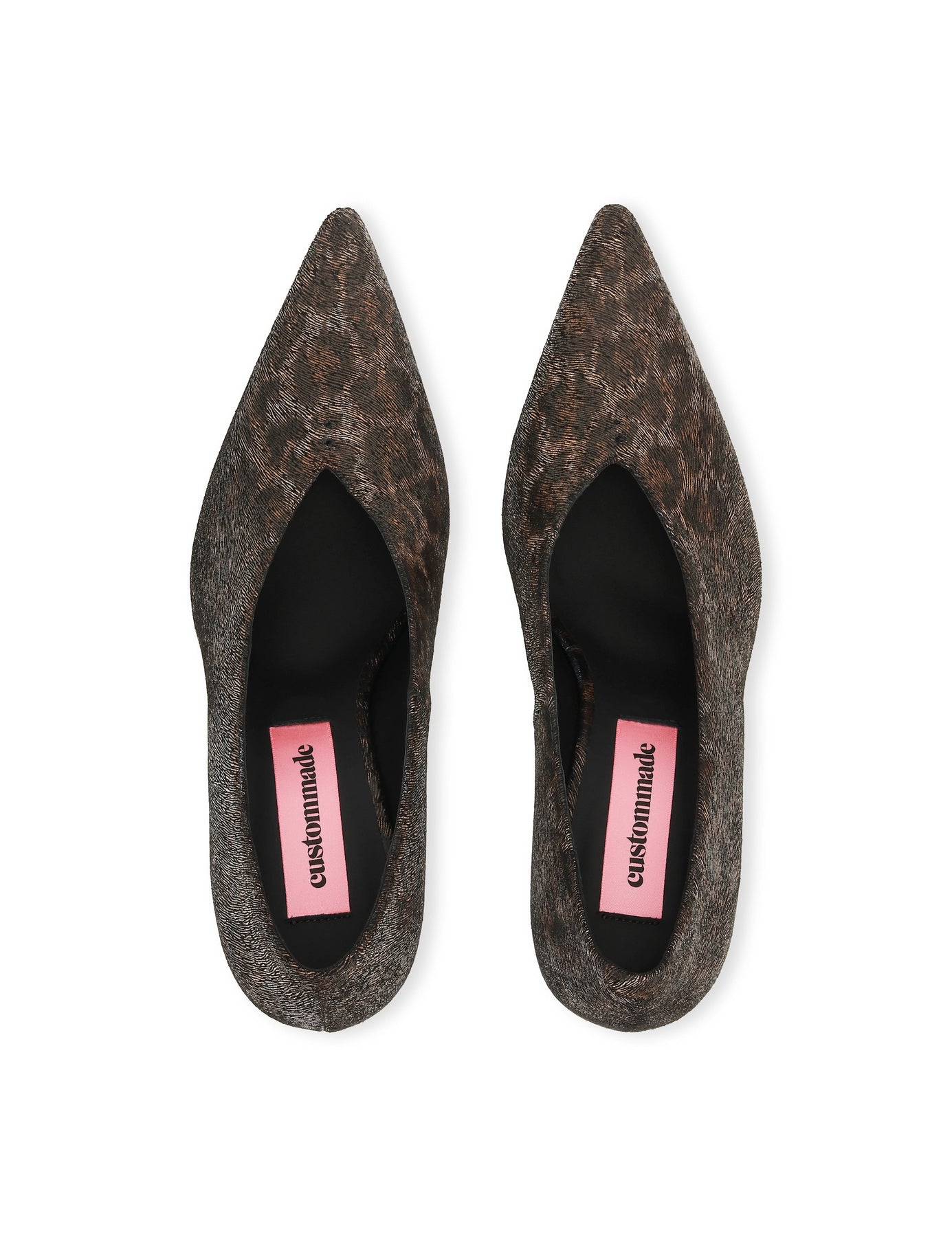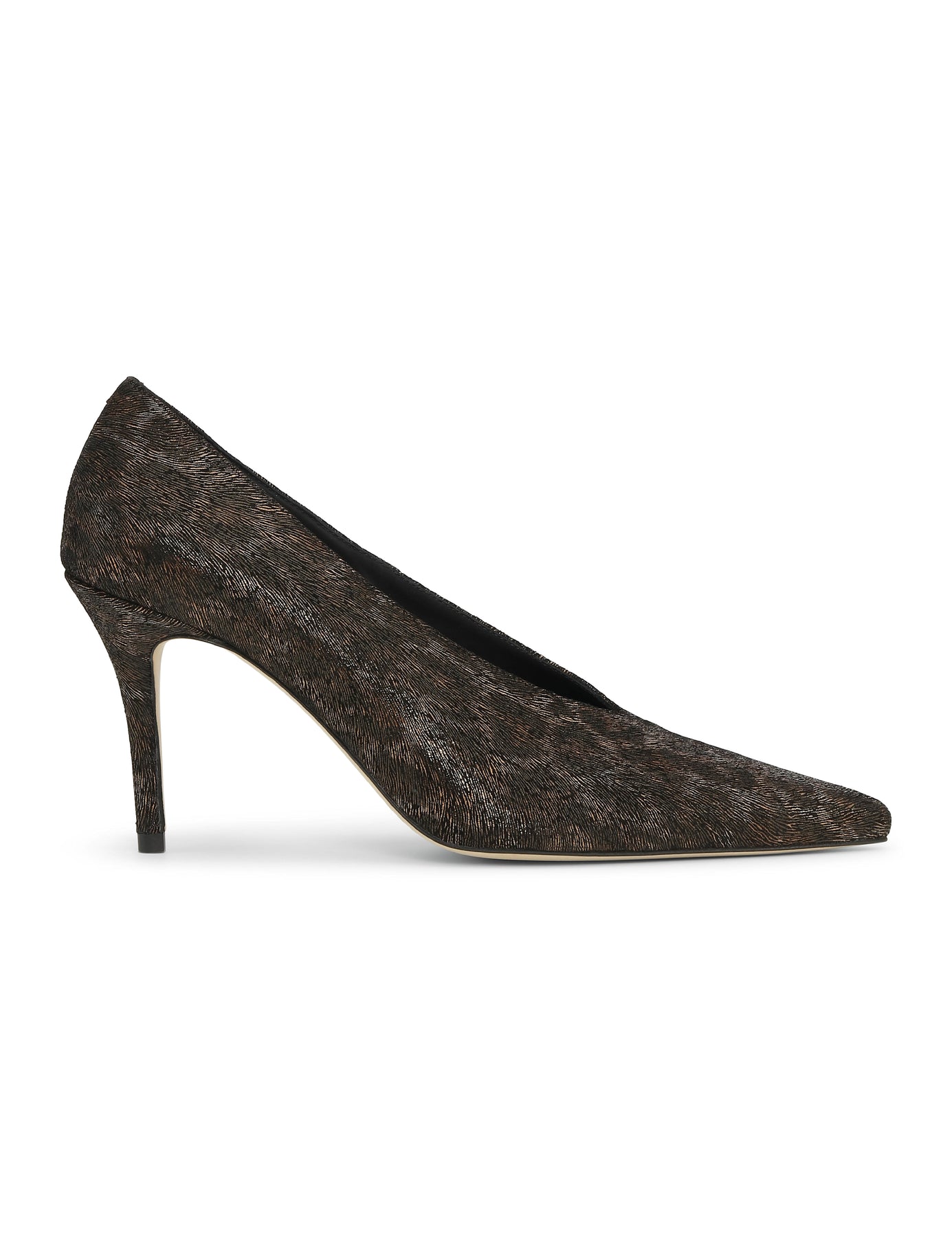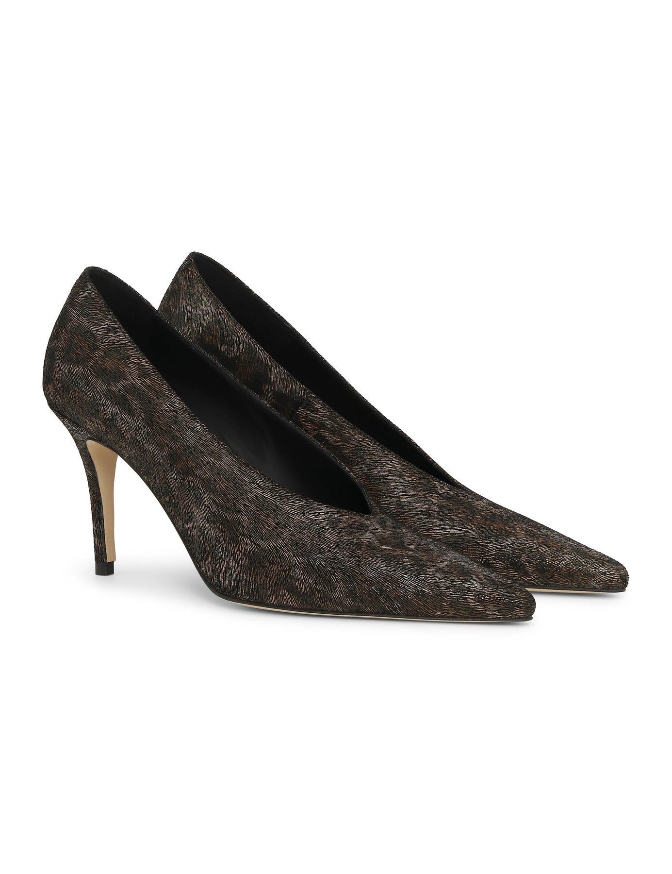Skoene har en klassisk silhuett med en sofistikert, spiss tå og en slank stiletthæl. Det som virkelig gjør at disse skoene skiller seg ut, er det skimrende leopardmønsteret i brune og metalliske toner. Den dype V-utskjæringen foran gir en moderne og flatterende effekt som forlenger bena.