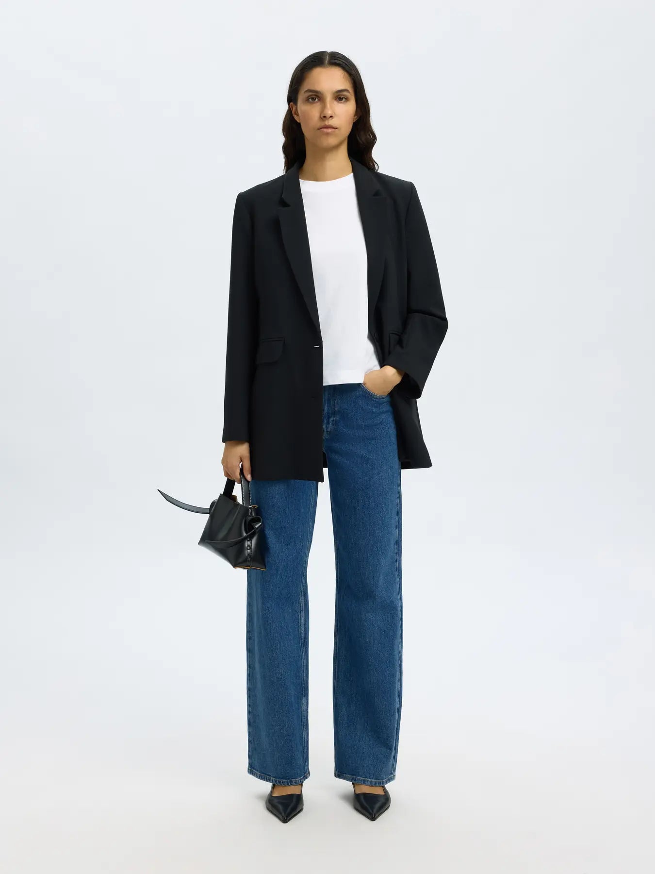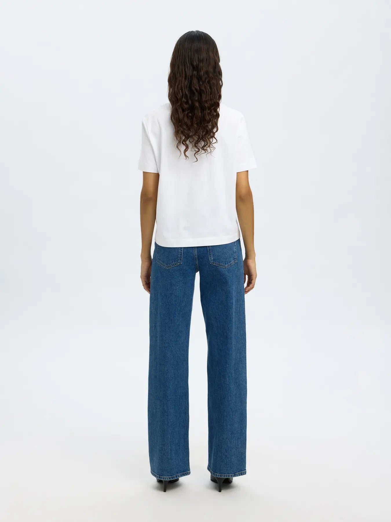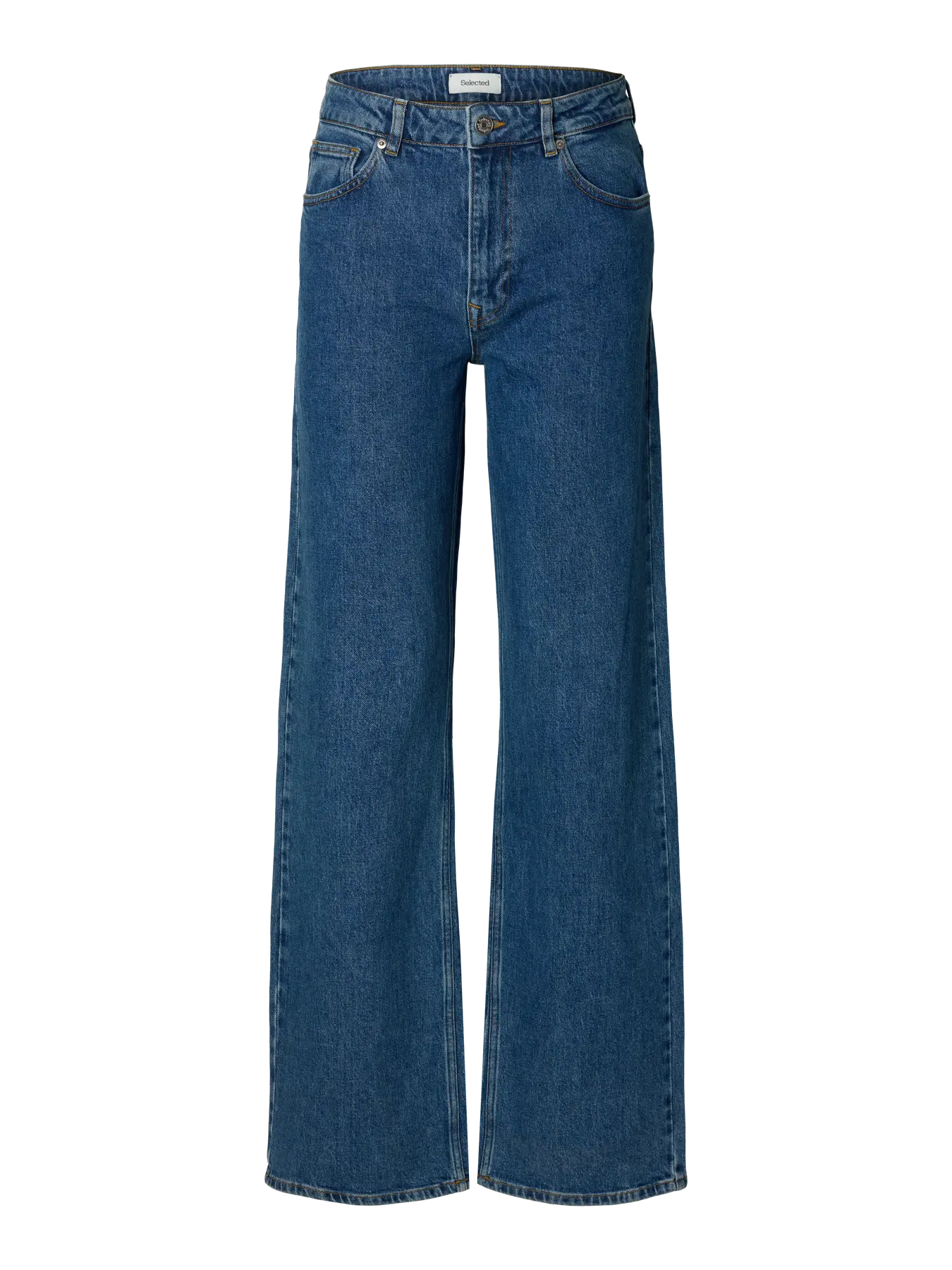 Wide Bea-Kori Hw Jeans fra Selected Femme. Tidløse og flatterende jeans med et sofistikert uttrykk. Wide Bea-Kori Hw Jeans har en høy midje og brede, rette ben. Den stive denimen former seg pent etter kroppen uten å miste fasongen. Klassiske lommer, beltehemper og metallknapper gir et autentisk uttrykk, mens den minimalistiske finishen holder stilen fresh og allsidig.