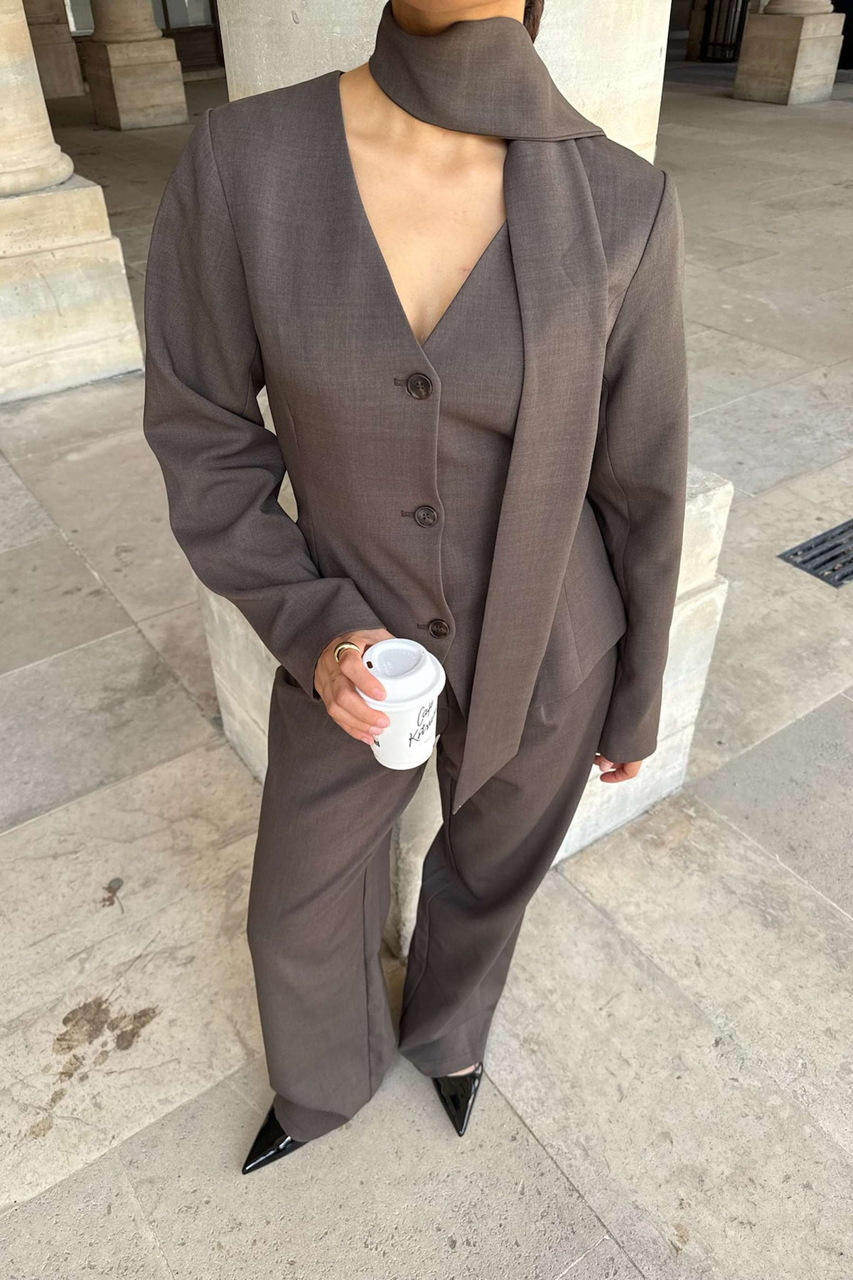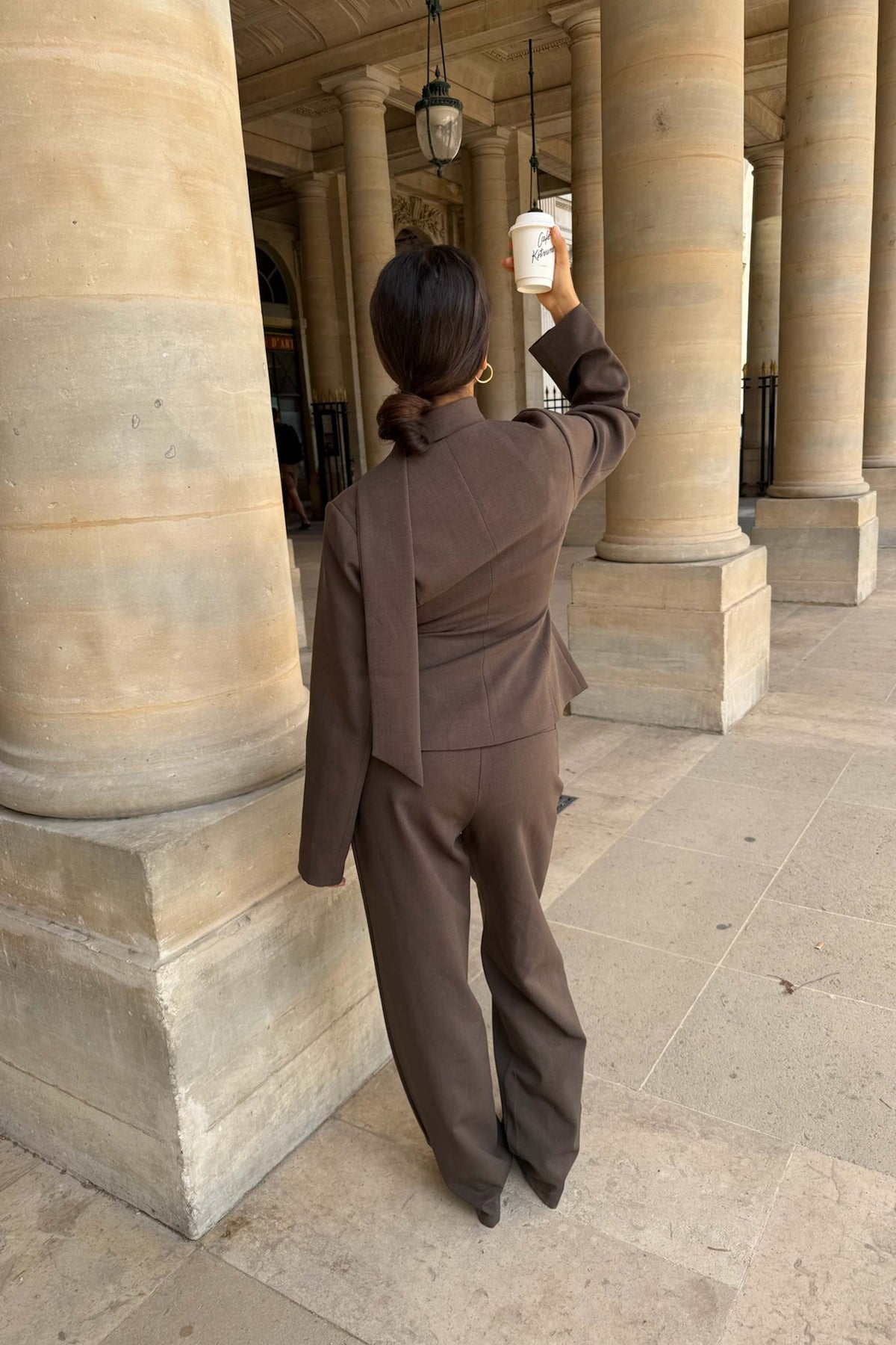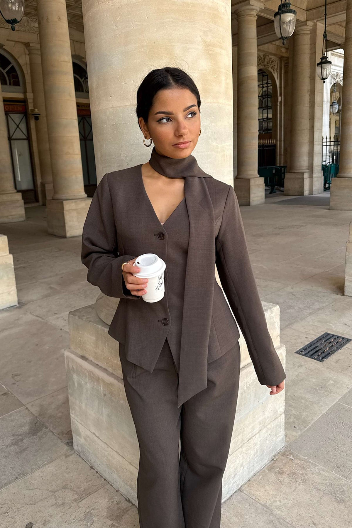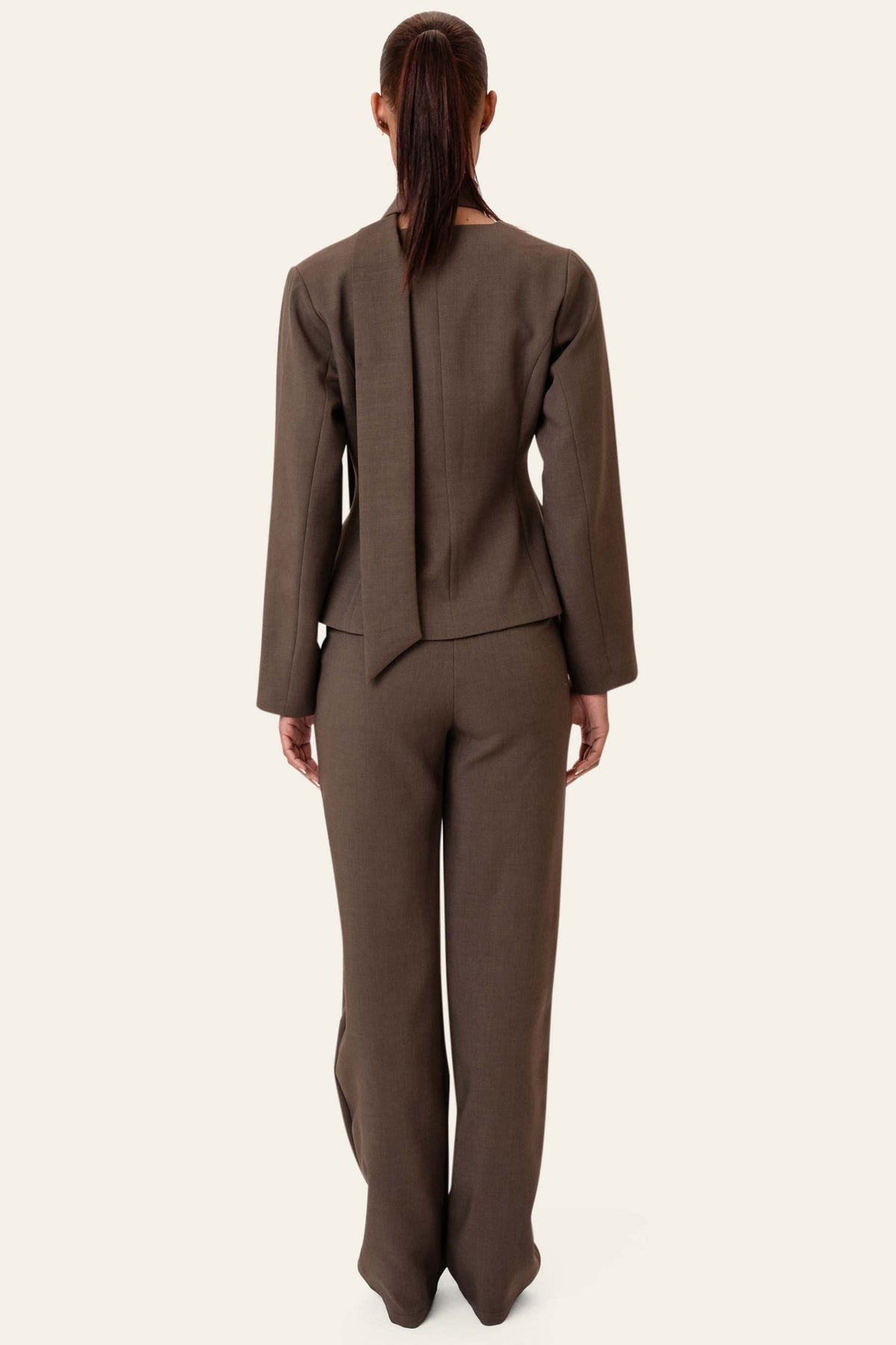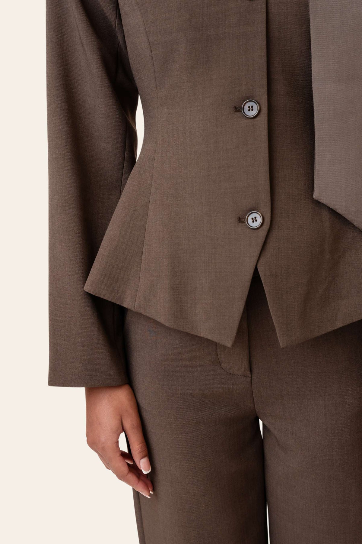 Yaraic Blazer fra BYIC. En tettsittende blazer i nydelig brun. Blazeren kneppes foran med mørkebrune knapper, og sammen med splitten under lukkingen fremhever dette midjen. Den har skulderputer som gir struktur og en raffinert silhuett, samt lange rette ermer og en V-formet halsutringning, noe som gir den et elegant utseende. Blazeren har et knytebelte som kan knytes i midjen eller styles som et skjerf for et ekstra preg.