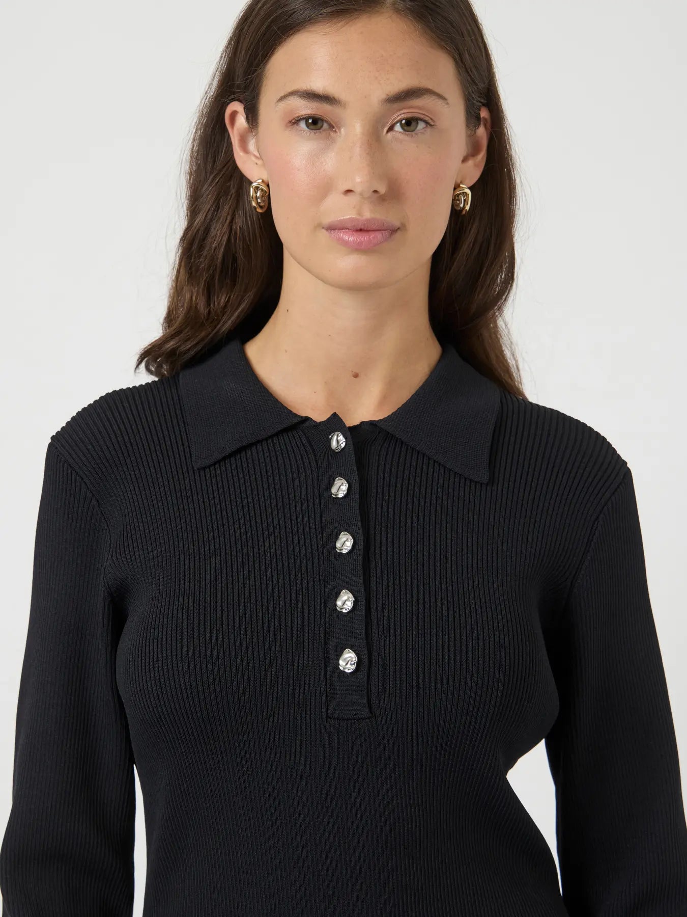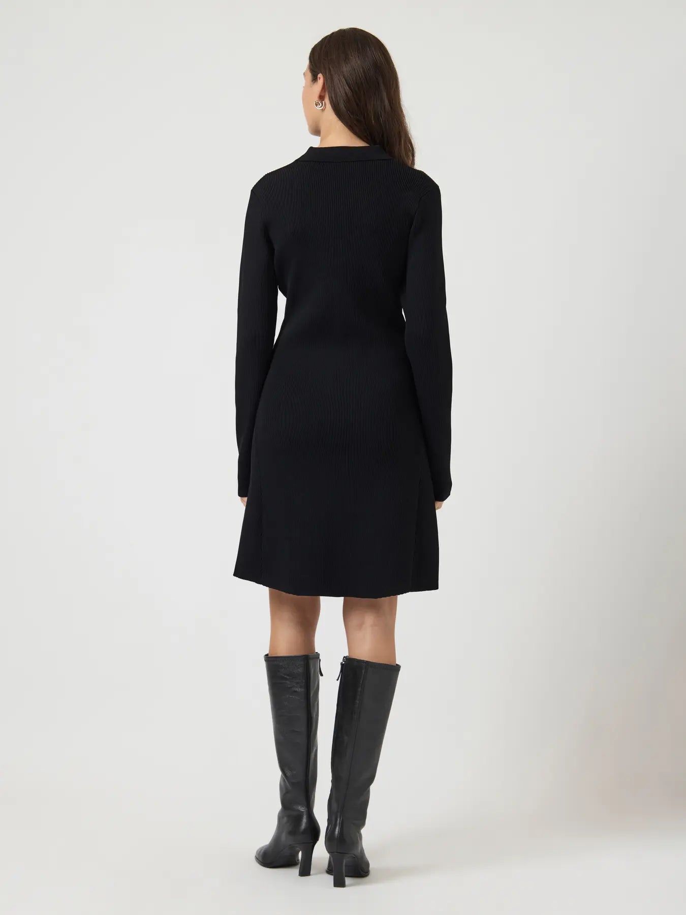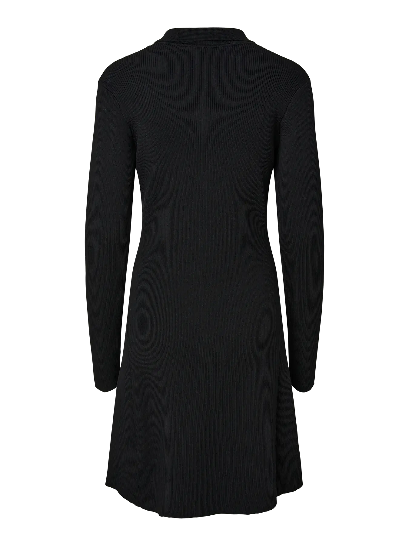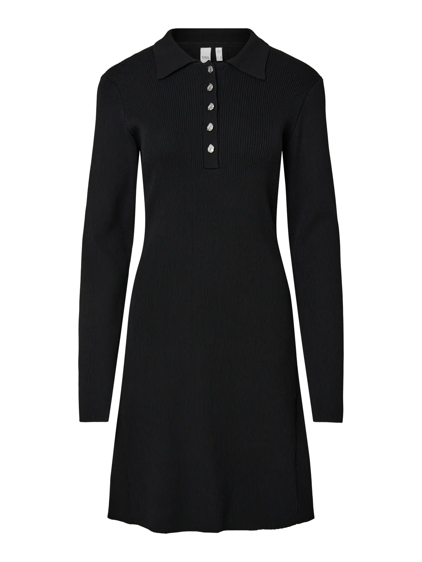 Yasnama Ls Knit Dress fra Y.A.S. Yasnama Ls Knit Dress er en tidløs strikkekjole i dyp svart med klassisk skjortekrage og dekorative knapper foran. Den har en myk, ribbestrikket struktur som gir en flatterende og behagelig passform, og et enkelt A-formet snitt som faller pent. En elegant hverdagskjole som passer like godt på kontoret som til middager.